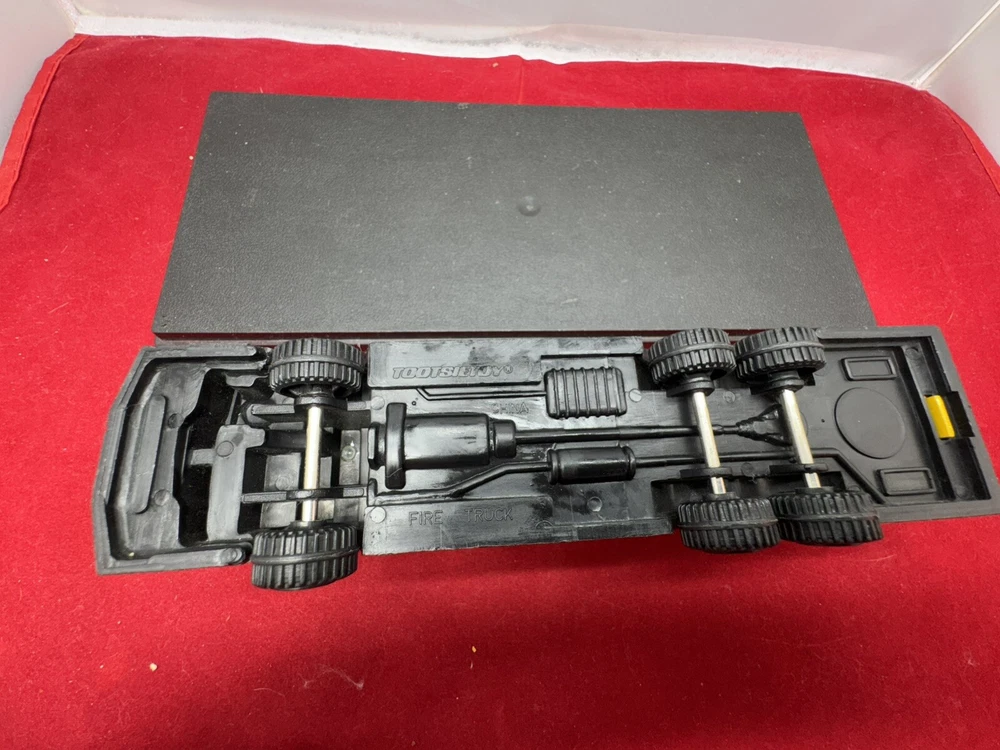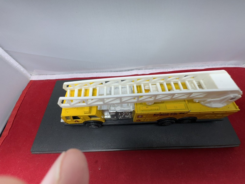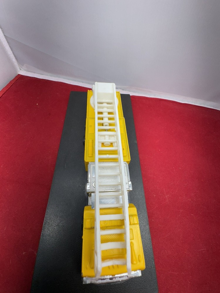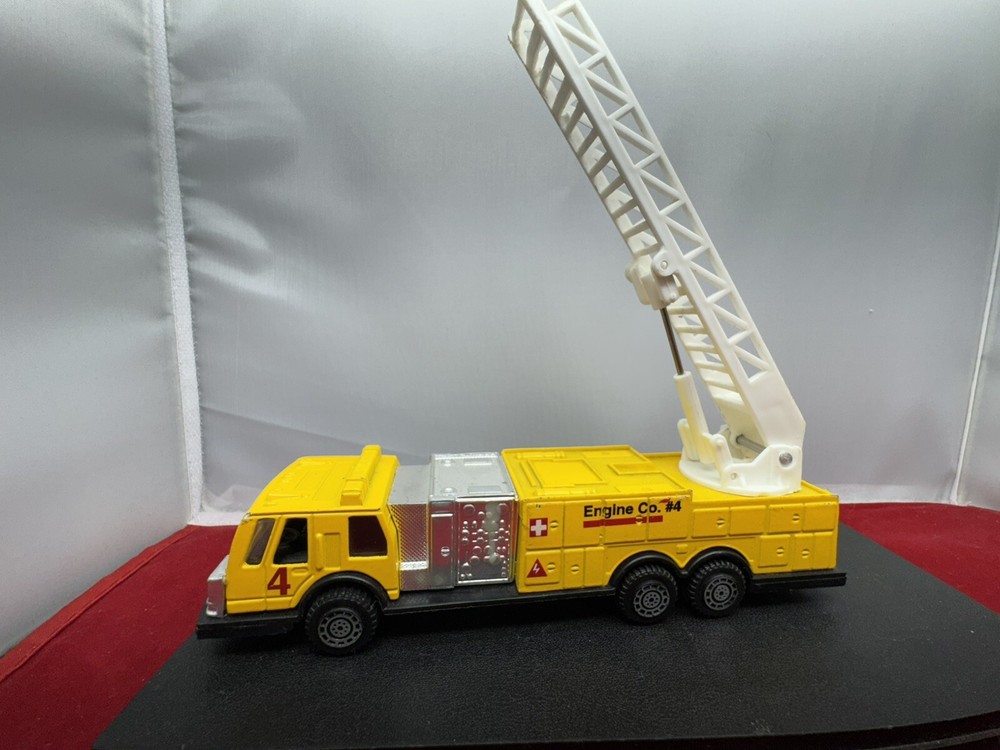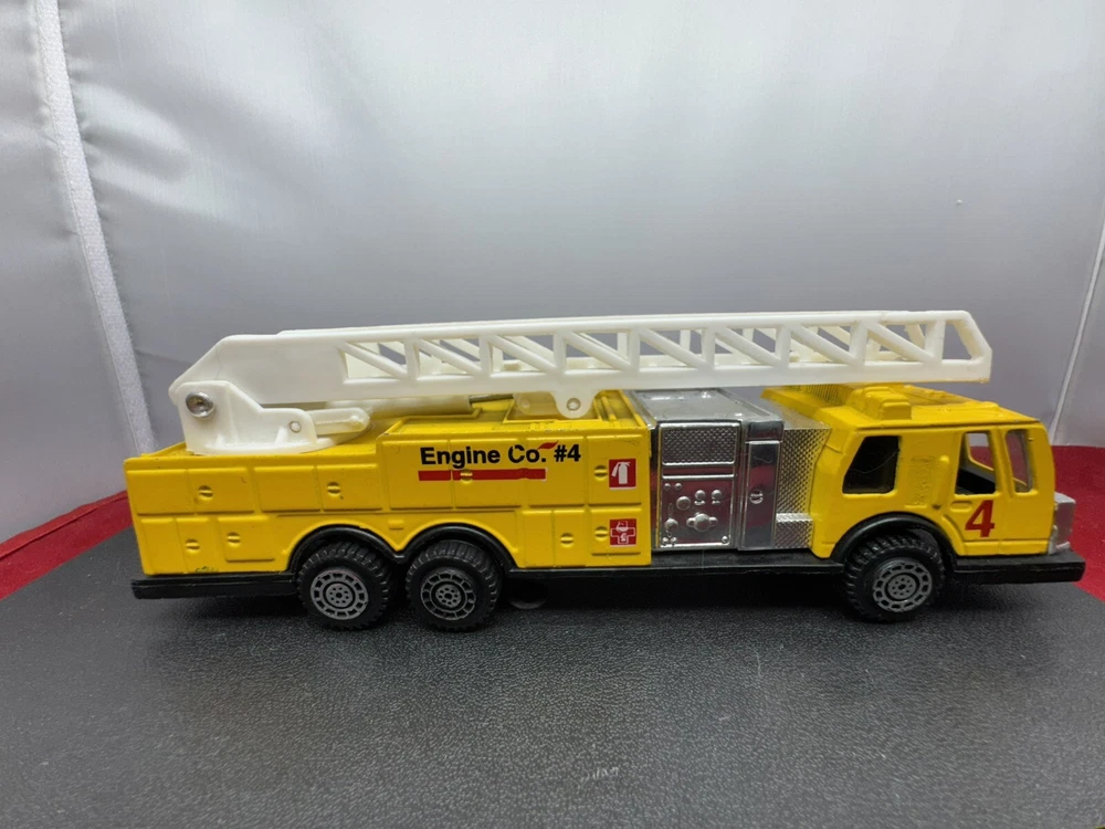 The product is a FIRETRUCK toy made by TootsieToy, featuring a yellow color and made of diecast metal and plastic. It is designed in a contemporary style for toy collectors and enthusiasts.