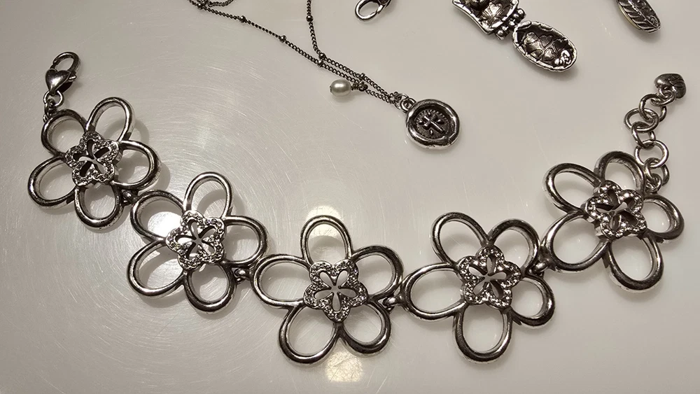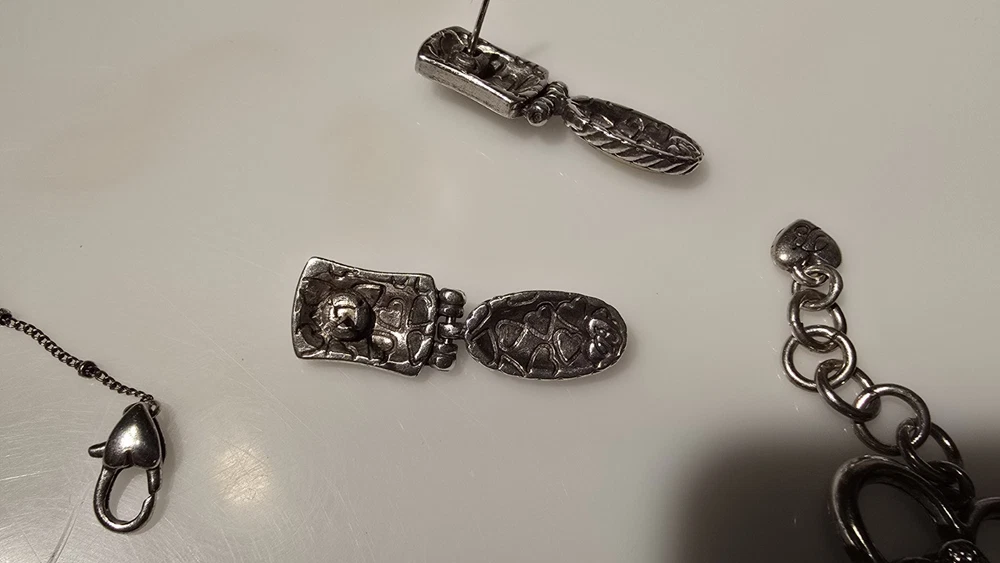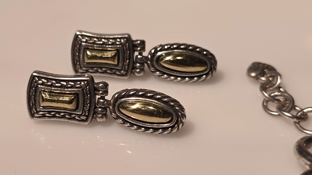 This is a 3 piece lot of all Brighton jewelry, including a floral panel bracelet, faith pendant necklace with genuine pearl accent, and door knocker style 2 tone earrings. Some wear to clear coating, not highly noticeable when wearing. This coating is used to prevent tarnish but wears off over time. I will include a free tarnish removal cloth with the lot, which works very well on Brighton jewelry. Thanks for looking! Please ask any questions BEFORE purchasing/offer, and see my eBay store for more!