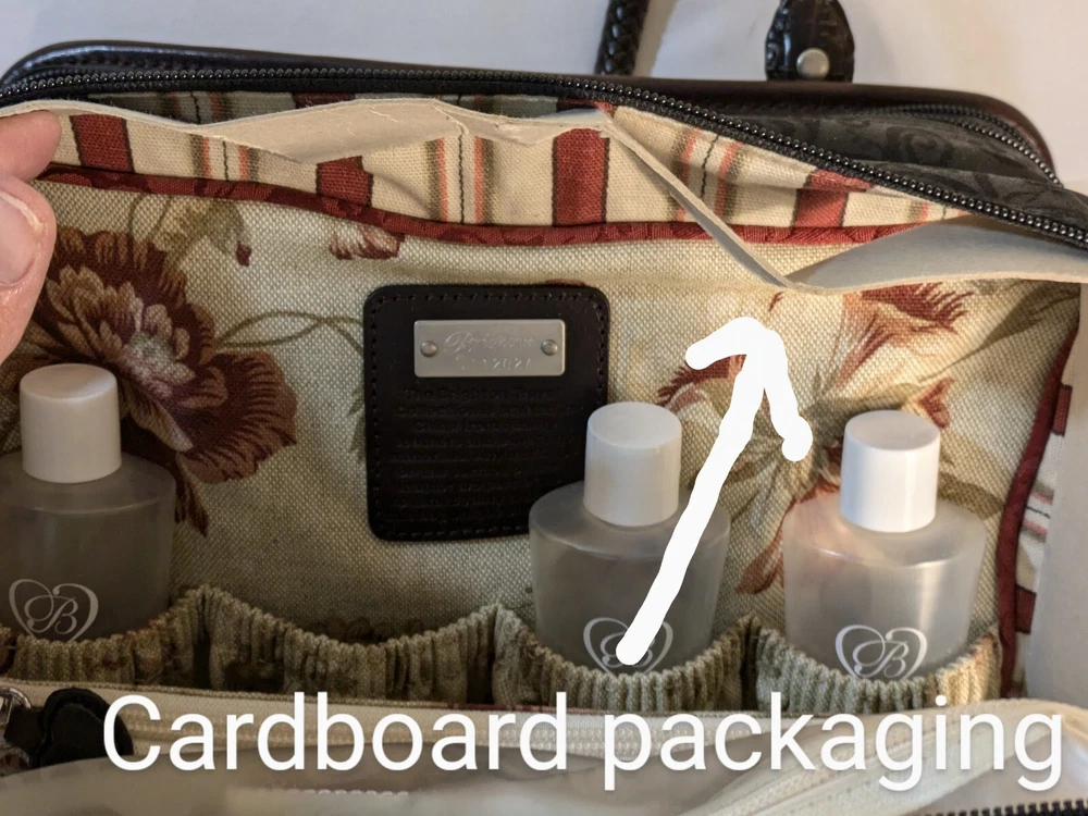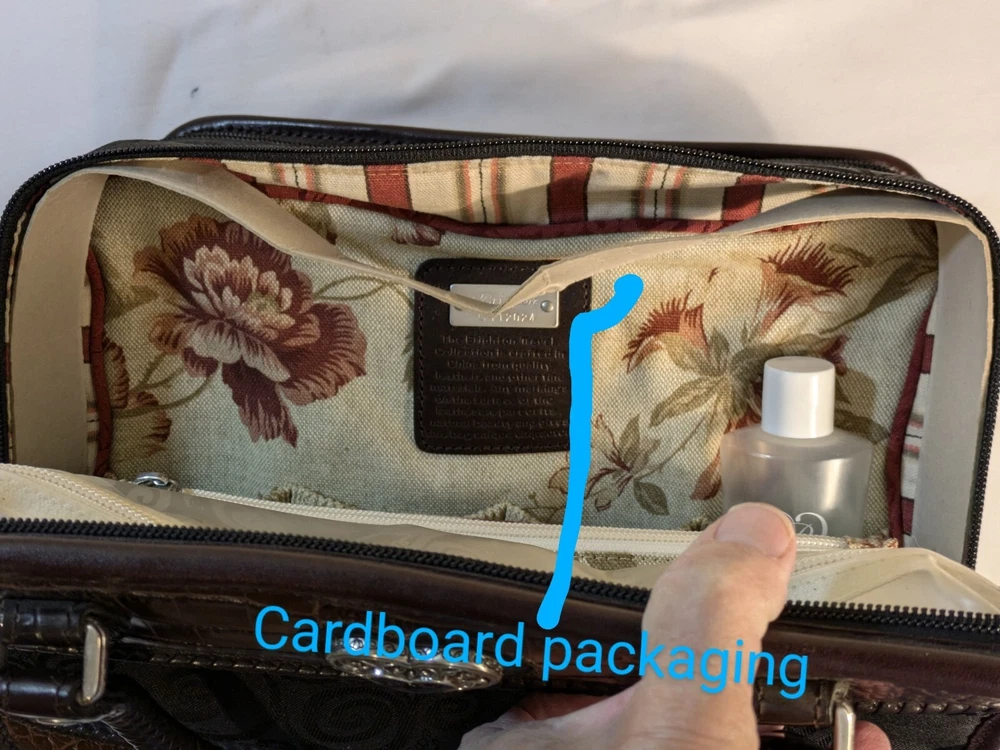 This bag is new and has never been used it still has the cardboard packaging bands. There's 3 bottles included that meet the size requirements for toiletries. The registration card is also included