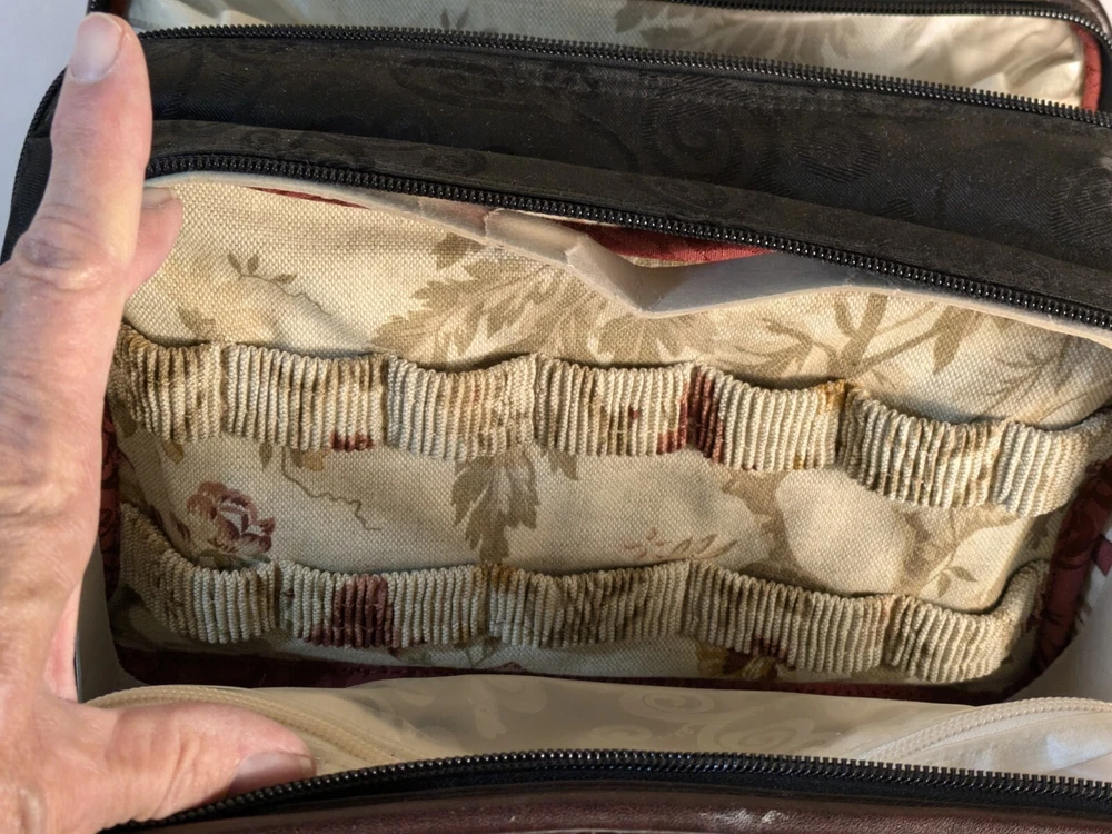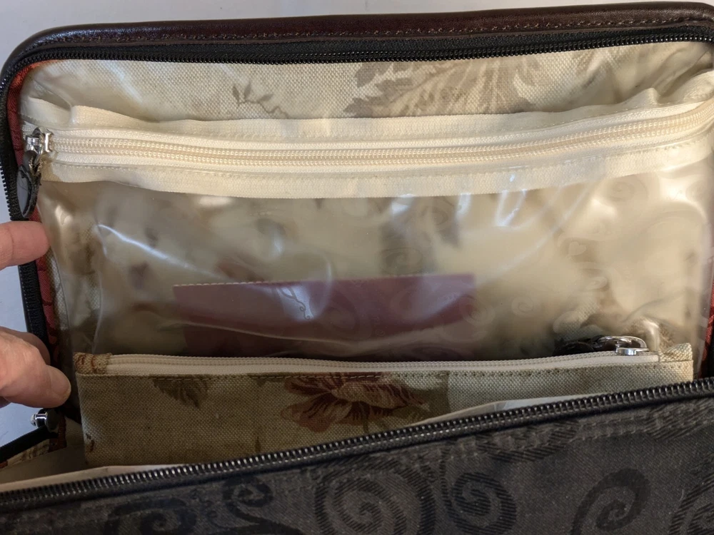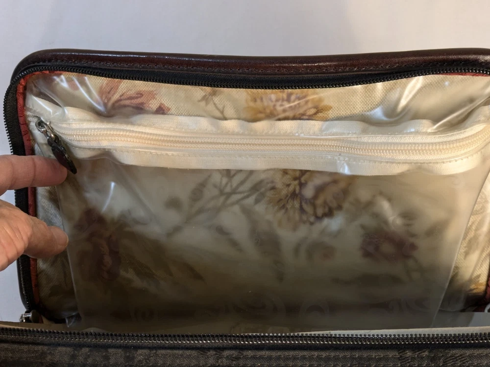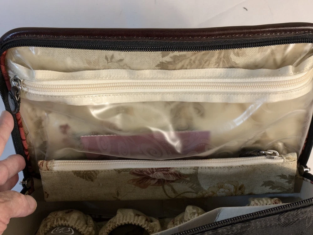 Type: Toiletry Custom Bundle: No gtin13: Does not apply Features: Zippers Storage: Plastic Zip Bags For Liquids Handles: Double Leather Snapped Handles Brand: Brighton Country/Region of Manufacture: China Interior: Floral Canvas MPN: N/A UPC: Does not apply Modified Item: No Outer Material: Leather Extra Storage: Make-up Brush Storage Model: Lansky Color: Black/Brown