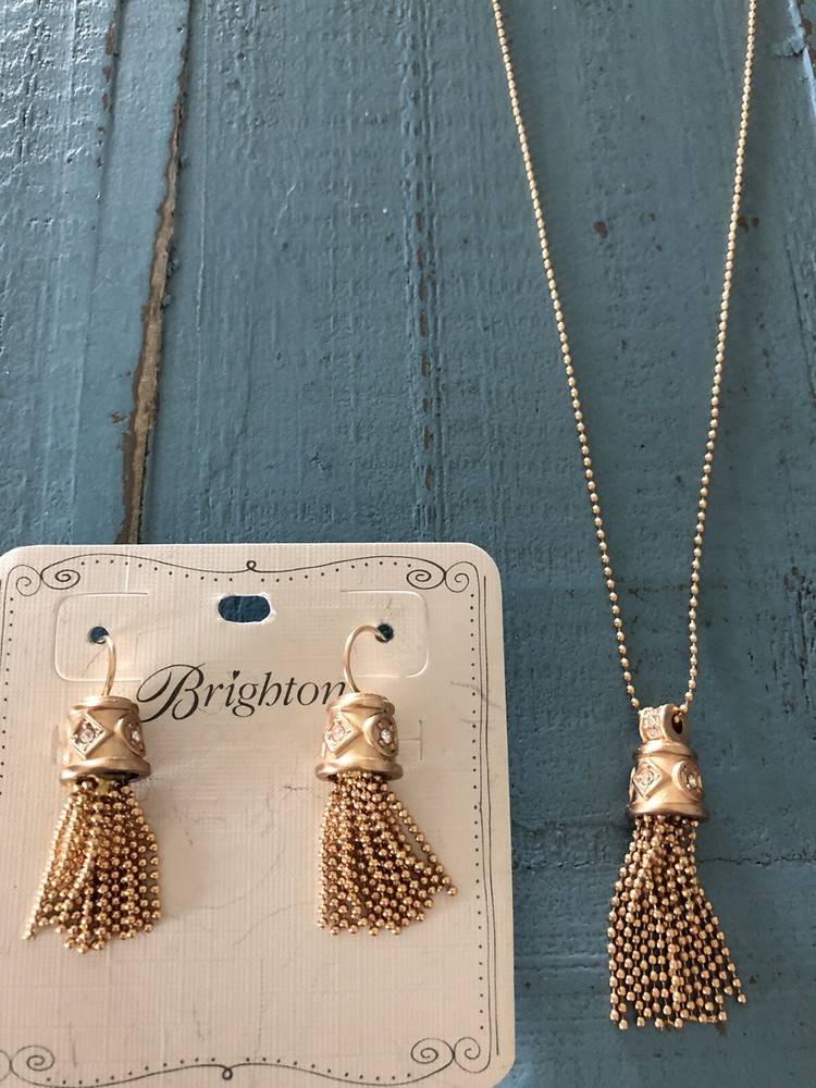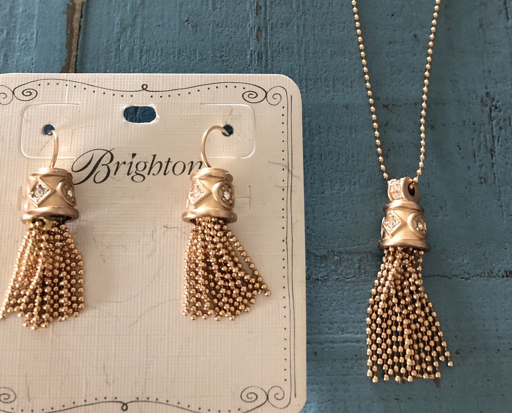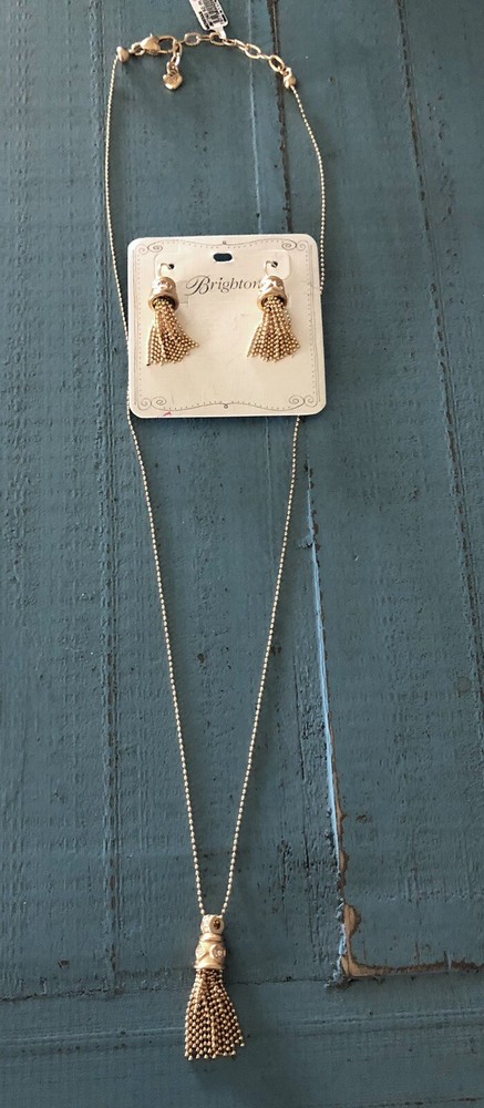 Brighton "MERIDIAN ZENITH TASSEL" Gold Necklace-French Wire Earring Set features an elegant mini tassel design with Meridian Zenith elements and a fine ball chain that gives this necklace with glass stones set in fine bezels a delicate, feminine and modern look! Necklace is a beaded link design measuring 24"-26" adjustable with a lobster claw clasp closure and features a fringe accented pendant with a 1 1/4" drop. (JM7293-Retail $108) French Wire Earrings are a matching design with a 1 1/4" drop and are 3/8" wide. (JA9273-Retail $108) Brighton storage pouch will be included.