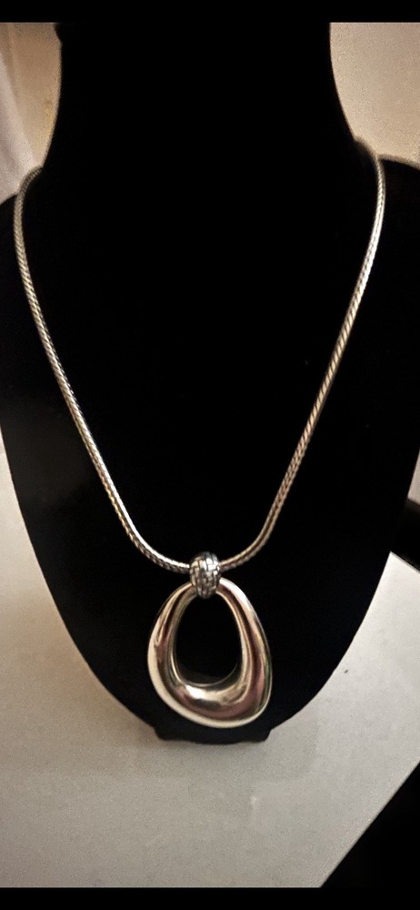 The Brighton Modernist Teardrop Pendant Necklace is a stylish and adjustable piece of jewelry that features a silver tone snake chain with a 30" length. The teardrop pendant adds a modern and elegant touch to the overall design, making it a versatile accessory that can be worn with various outfits. Made by the trusted brand Brighton, this necklace is sure to make a statement and elevate any ensemble with its sophisticated and timeless style.