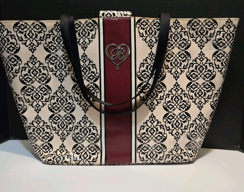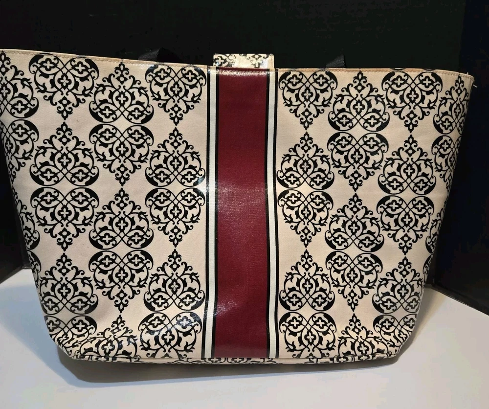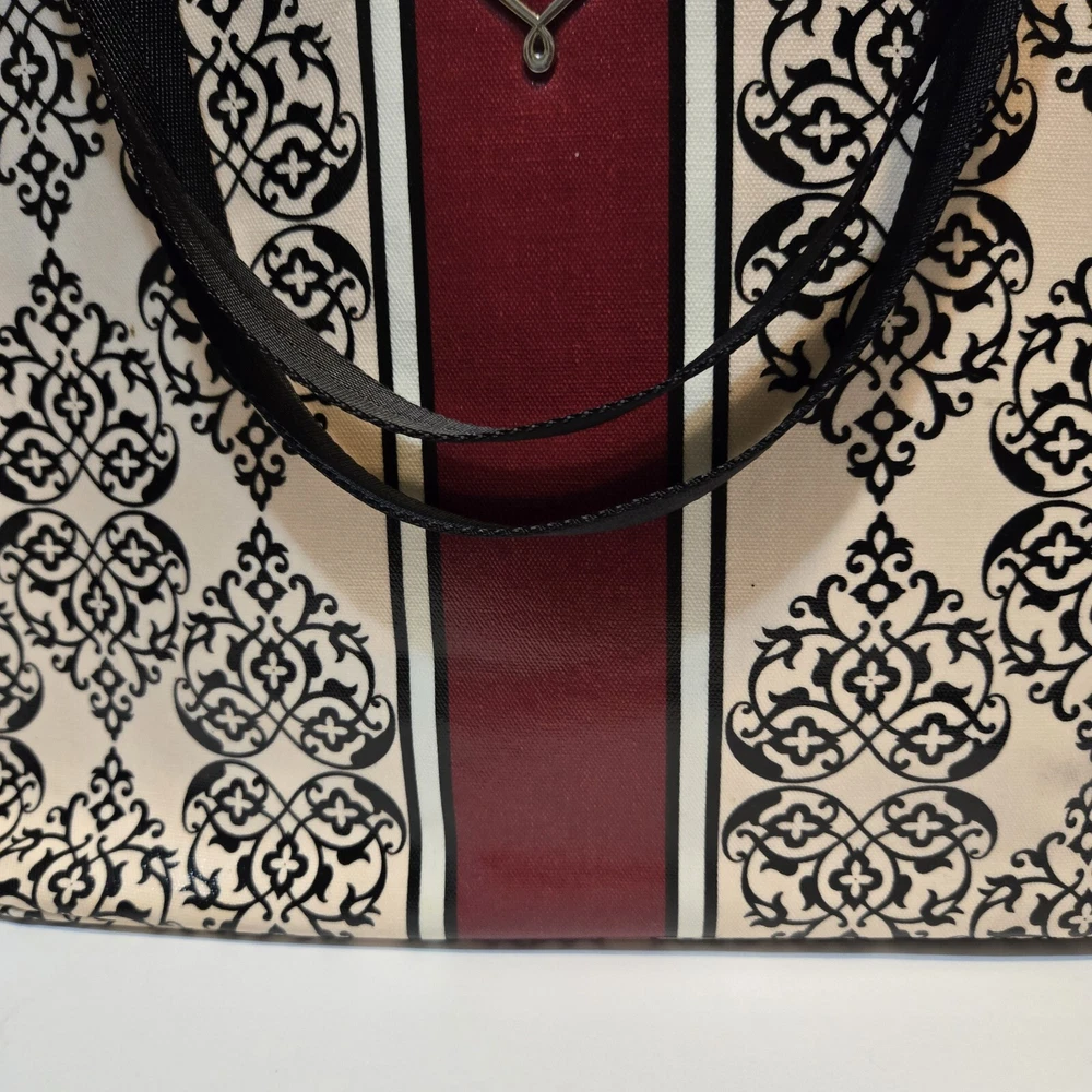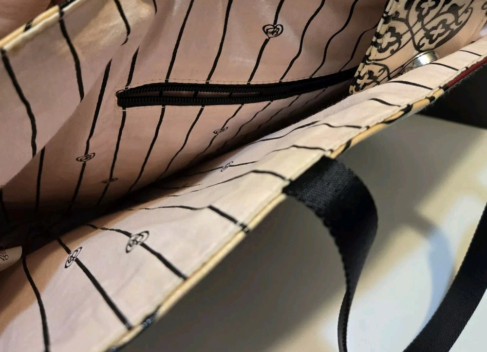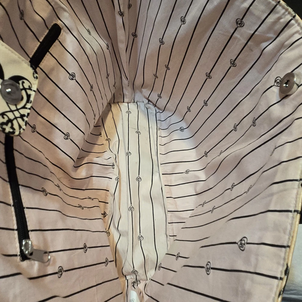 Brighton My Sweet Valentine Pink Black Large Tote Bag. Snap closure on top. Logo. Striped Lining. Pre-owned. Very Light pink outer poly vinyl with black design. Red stripe with logo. Double black web handles. Inside is fabric light pink with black stripes. 1 inside zip pocket. 20" wide at the top opening. 13" wide at the base. 12" tall, 5" deep. Has a few stains inside on bottom, a few stains inside the zipper pocket. & a couple of scuffs outside. Please see all photos. Shipped promptly with Usps.