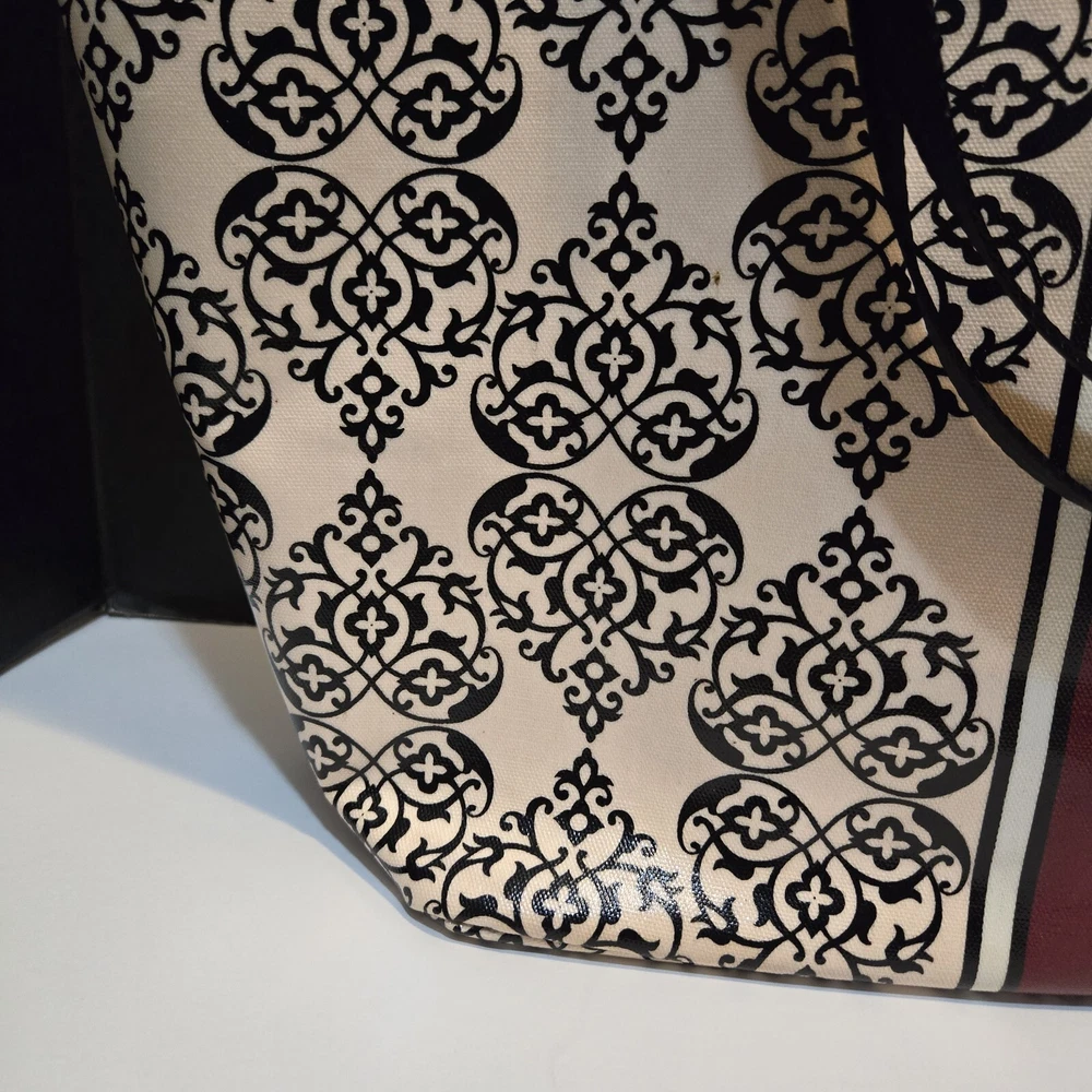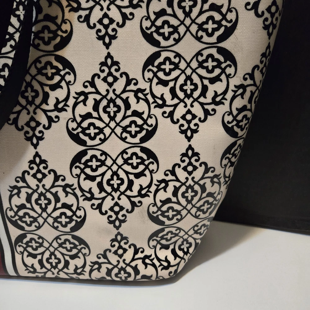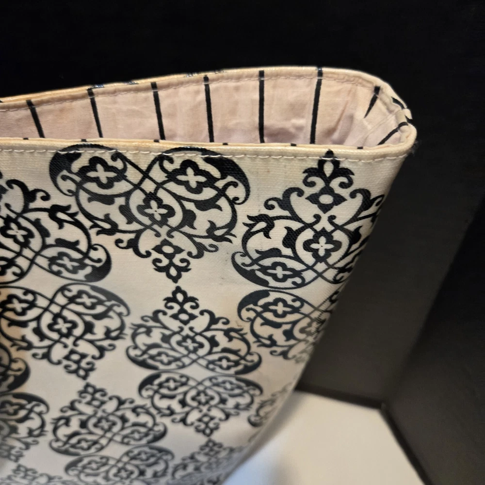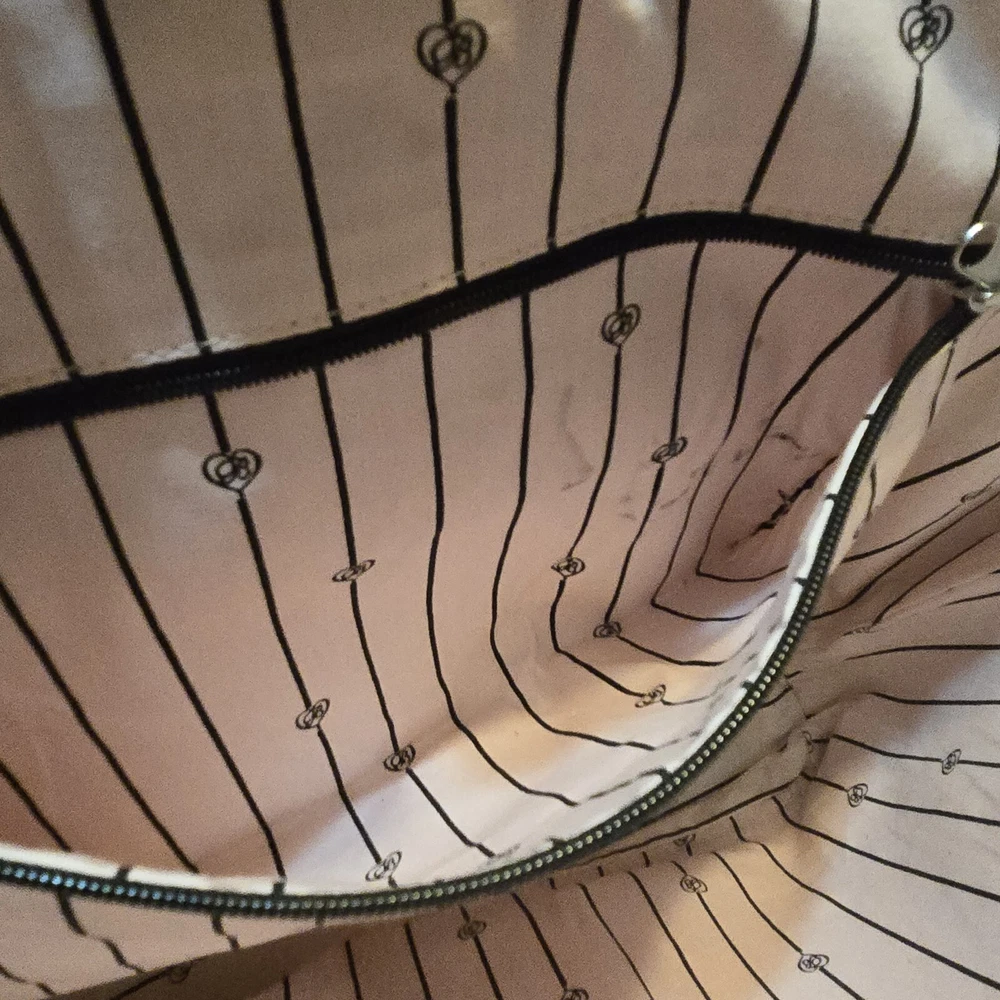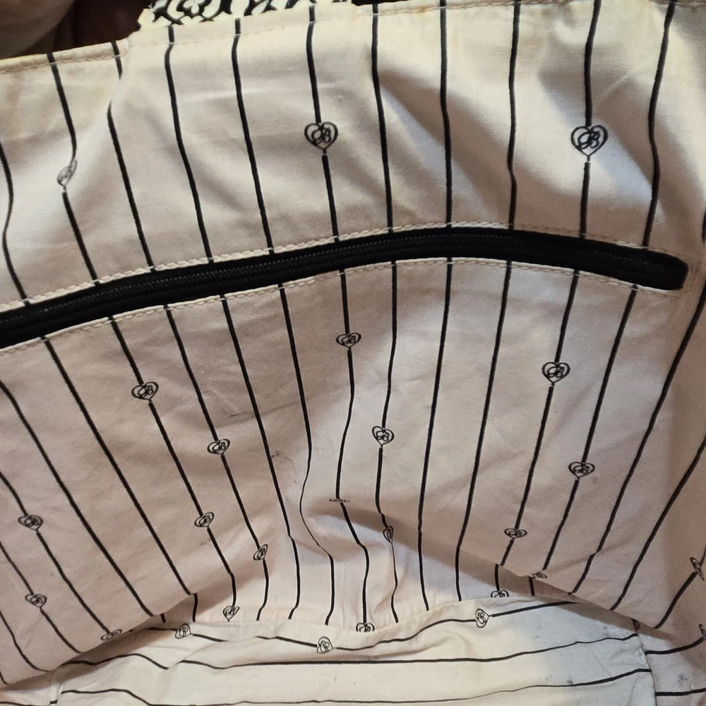 Brighton My Sweet Valentine Pink Black Large Tote Bag. Snap closure on top. Logo. Striped Lining. Pre-owned. Very Light pink outer poly vinyl with black design. Red stripe with logo. Double black web handles. Inside is fabric light pink with black stripes. 1 inside zip pocket. 20" wide at the top opening. 13" wide at the base. 12" tall, 5" deep. Has a few stains inside on bottom, a few stains inside the zipper pocket. & a couple of scuffs outside. Please see all photos. Shipped promptly with Usps.
