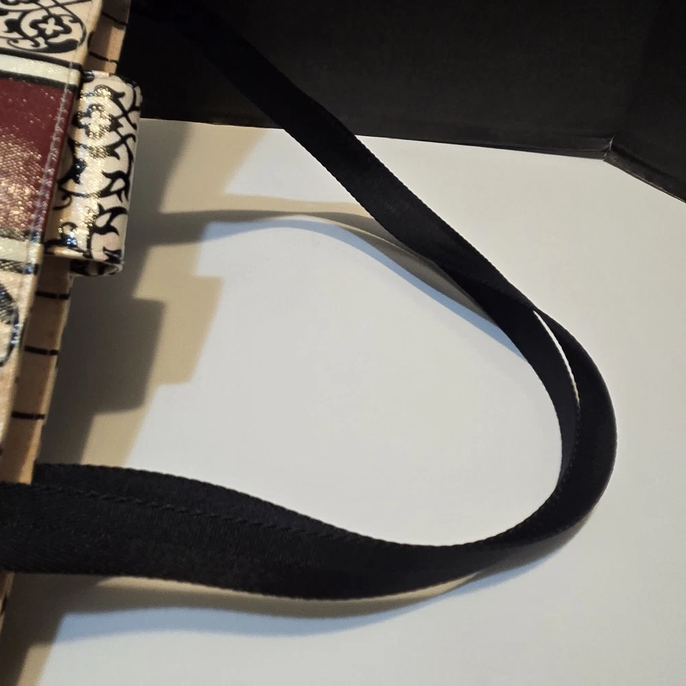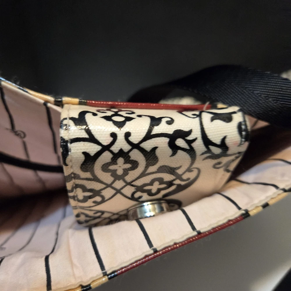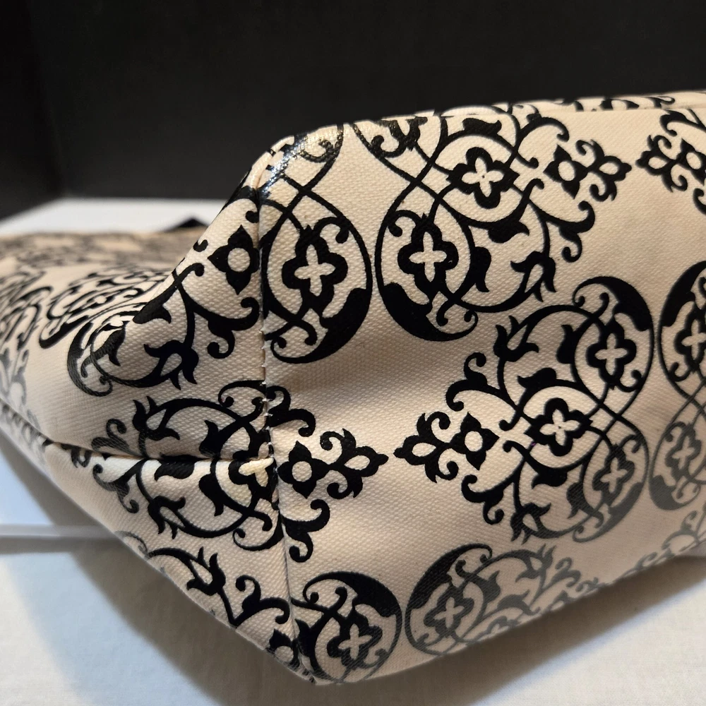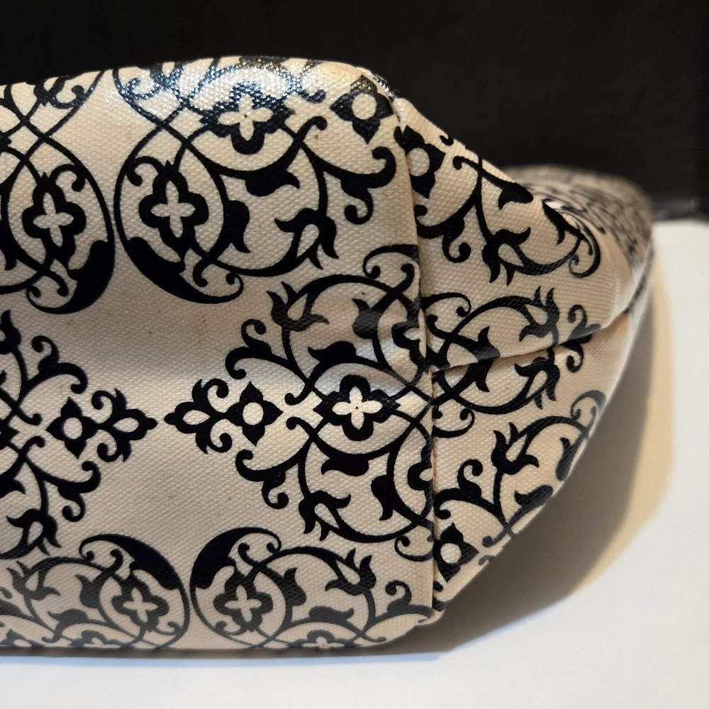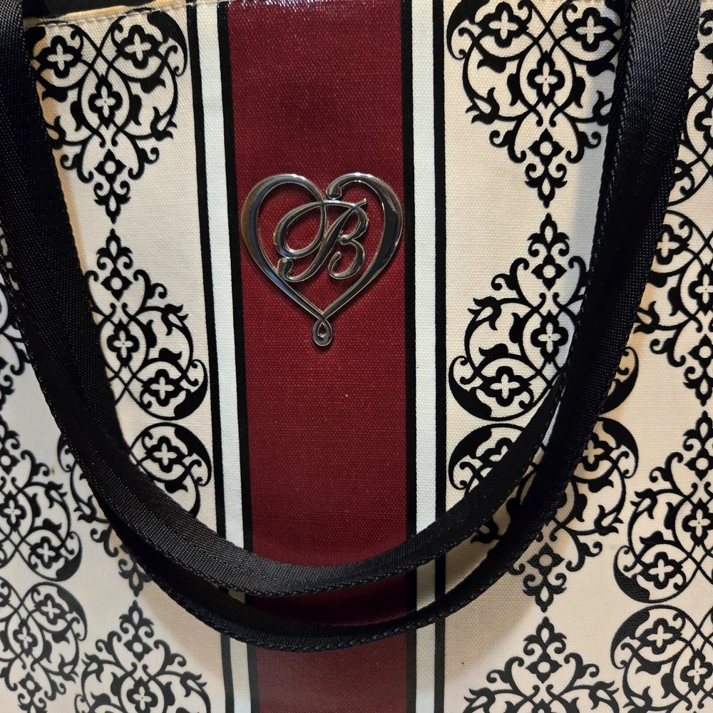 Brighton My Sweet Valentine Pink Black Large Tote Bag. Snap closure on top. Logo. Striped Lining. Pre-owned. Very Light pink outer poly vinyl with black design. Red stripe with logo. Double black web handles. Inside is fabric light pink with black stripes. 1 inside zip pocket. 20" wide at the top opening. 13" wide at the base. 12" tall, 5" deep. Has a few stains inside on bottom, a few stains inside the zipper pocket. & a couple of scuffs outside. Please see all photos. Shipped promptly with Usps.