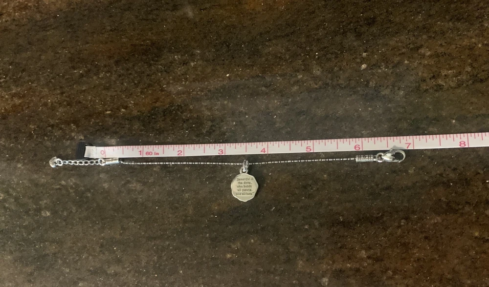 The Brighton Dove Charm Bracelet with Crystals is a beautifully crafted piece of jewelry that exudes peace and love. Silver plated and adorned with white/colorless crystals, this bracelet features a charming dove charm that adds a touch of elegance. The adjustable lobster closure makes it a versatile accessory suitable for various occasions such as Mother's Day, engagement, Christmas, wedding, anniversary, birthday, and Valentine's Day. The Brighton brand ensures quality and the piece is signed, giving it a touch of authenticity. Ideal for those who appreciate charm bracelets and love-themed accessories.