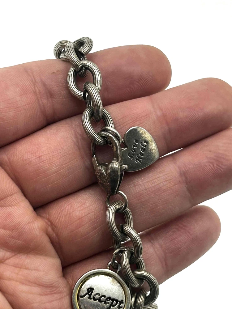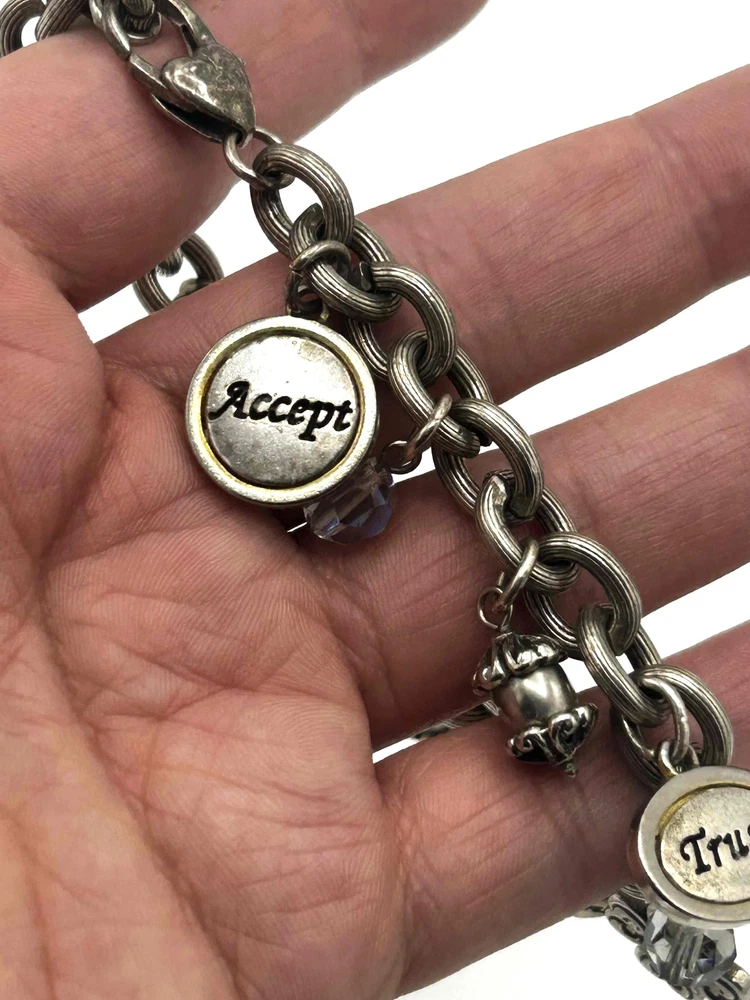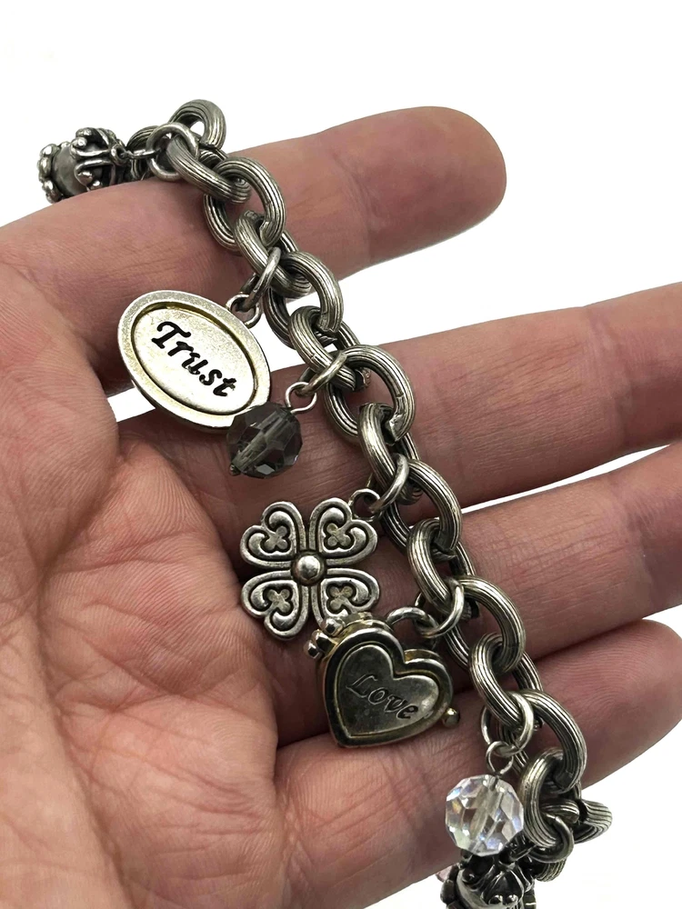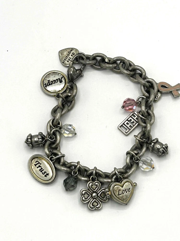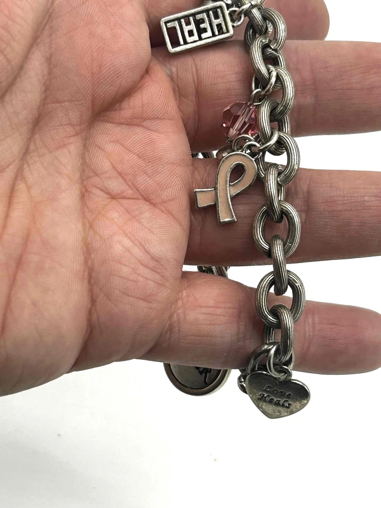 Brighton Pink Breast Cancer Engraved Words Charm Bracelet Support a cause with this Brighton charm bracelet, designed for breast cancer awareness. Features engraved inspirational words and beautiful charms, including a pink ribbon. A meaningful accessorization to any outfit. Condition: Good condition. Features: Engraved Words, Pink Ribbon Charm, Inspirational, Lobster Clasp Brand: Brighton Type: Bracelet Style: Charm Color: Pink Material: Metal