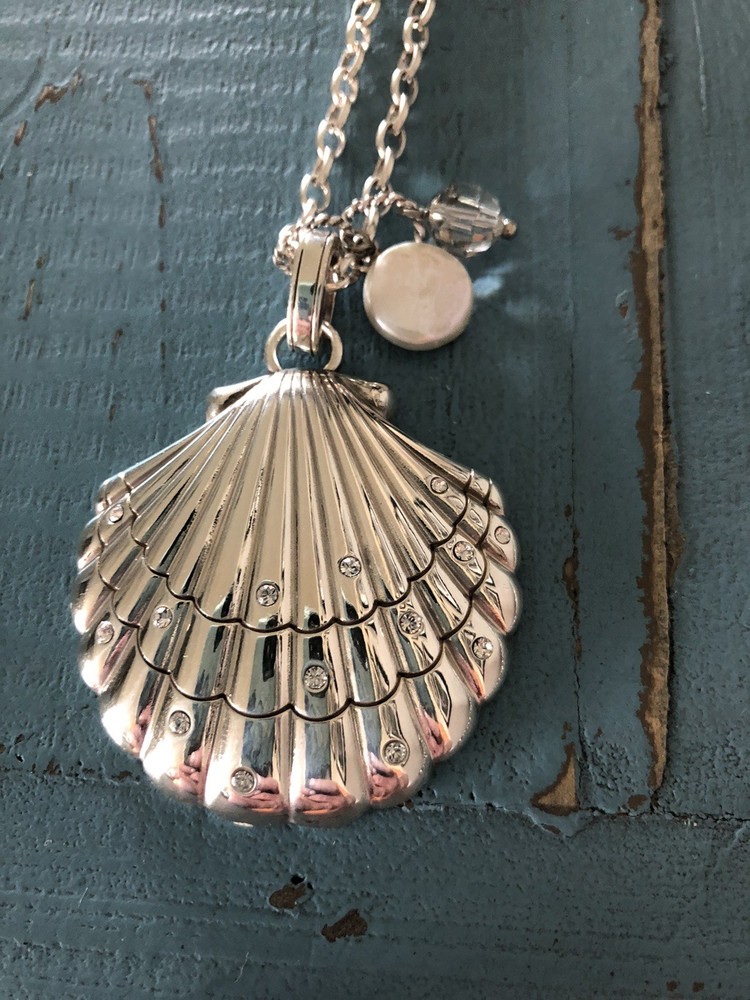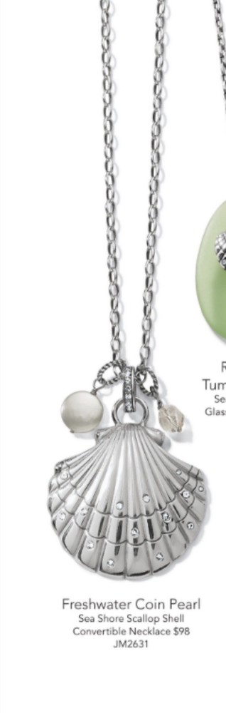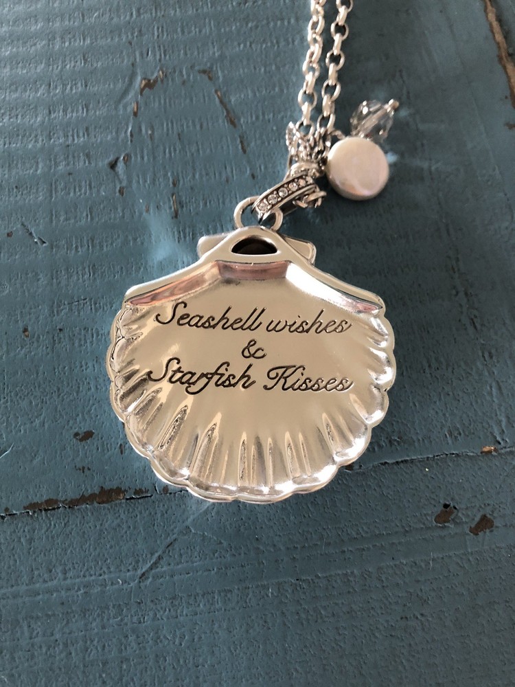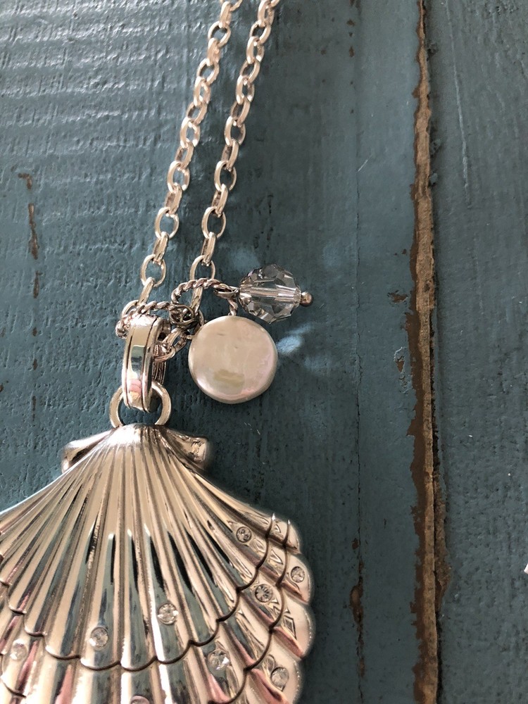 On this long silver necklace, a shiny shell statement pendant sparkles with fine quality crystal "water" droplets, enhanced with a fine quality crystal pearl and faceted bead. Even its bale shimmers with fine quality crystals. On its reverse, it reads, Seashell Wishes and Starfish Kisses. Wear this coastal necklace long or double the chain and wear it short! It's the perfect addition to your nautical look. - Closure: Lobster Claw - Length: 18" - 40" Adjustable - Features: Convertible - Pendant Drop: 2 1/4" -