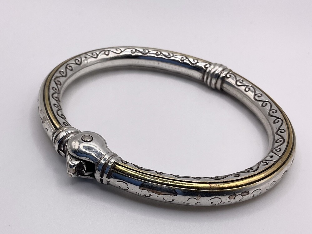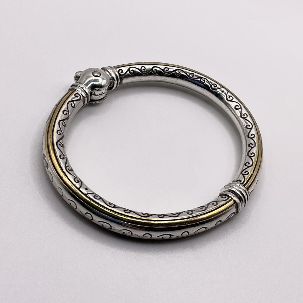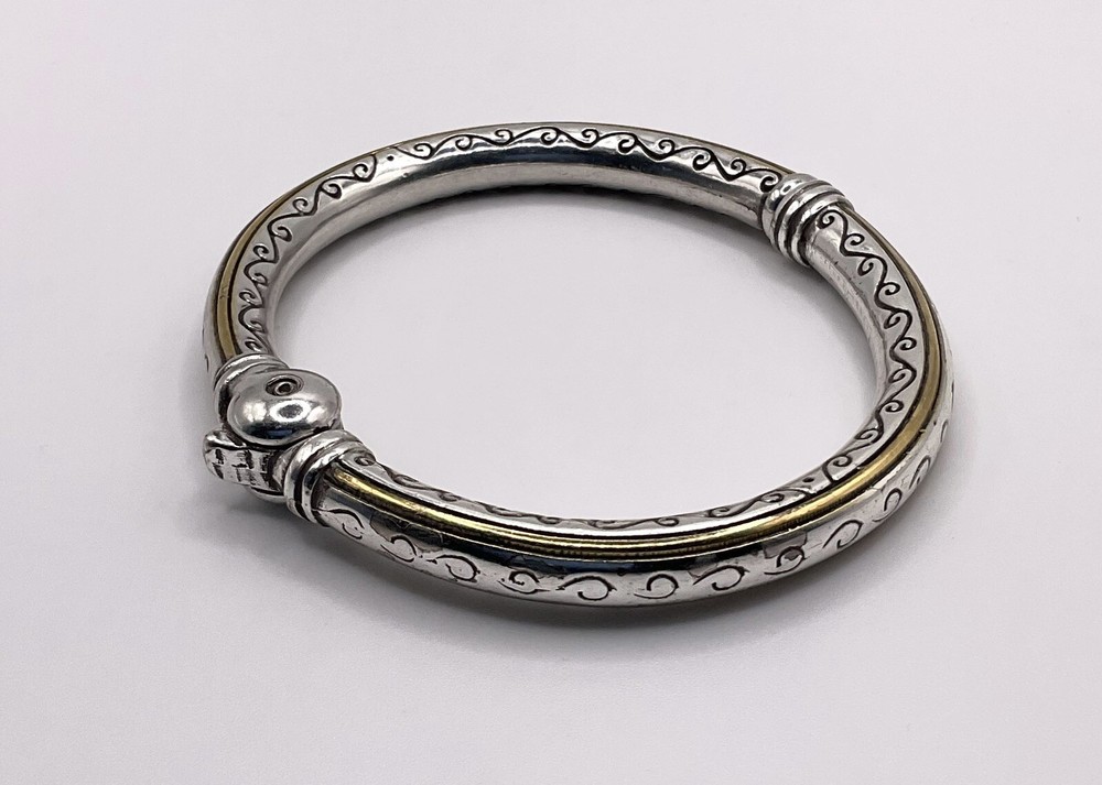 Add a touch of elegance to your outfit with this stunning Brighton silver plated cuff bracelet. The oval shape and magnetic closure make it easy to wear, while the reversible and stackable features allow you to switch up your style. A beautiful gold accent runs across both sides accompanied by a swirl design. B heart jewelry.