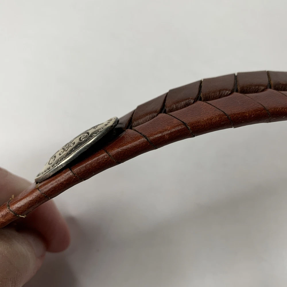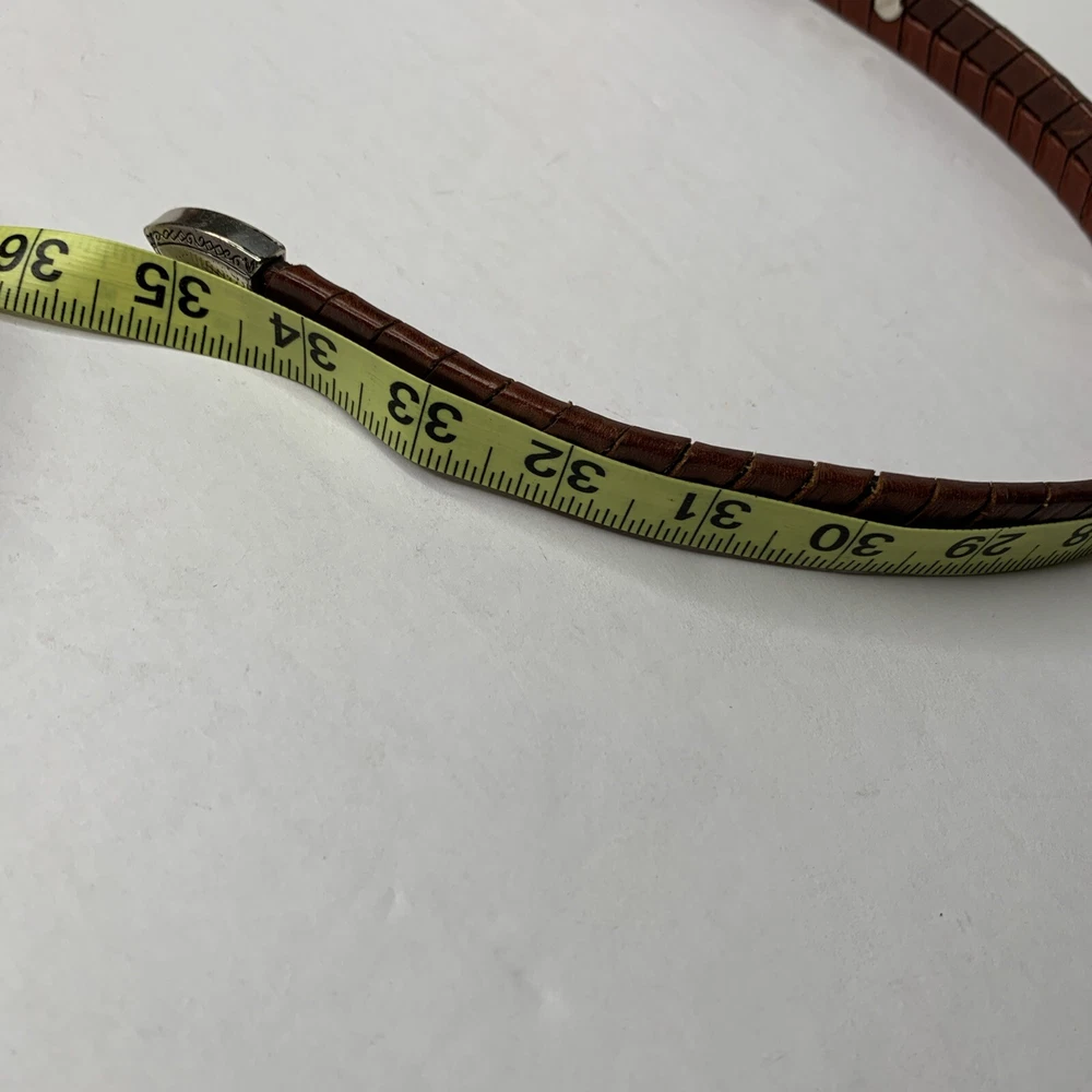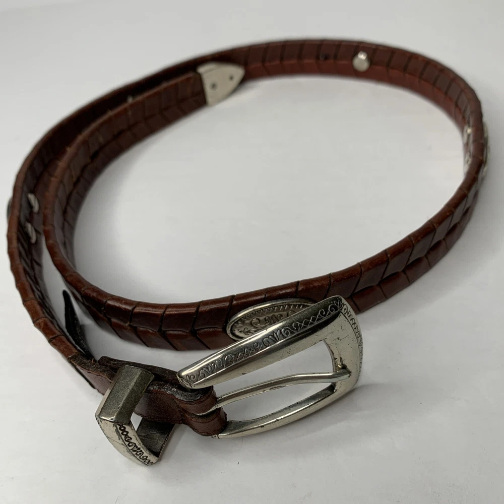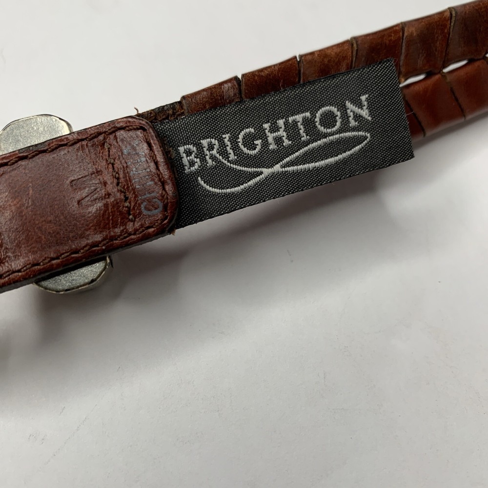 This Brighton belt is a must-have for any cowgirl or bohemian-inspired wardrobe. Made of 100% genuine leather, this braided belt features a stunning brown color and vintage style. The belt is accented with Brighton metal designs on the buckle and tip, and studded details that add a touch of sparkle to any outfit. With a normal 1” belt width and a waist size of 31-34 inches, this belt is perfect for everyday wear or to add a pop of color and style to any outfit. The nickel hardware material ensures durability and the belt is made in China. Add this unique and stylish belt to your collection today! One of the studded accents is loose because of a missing back screw. Please see photos.