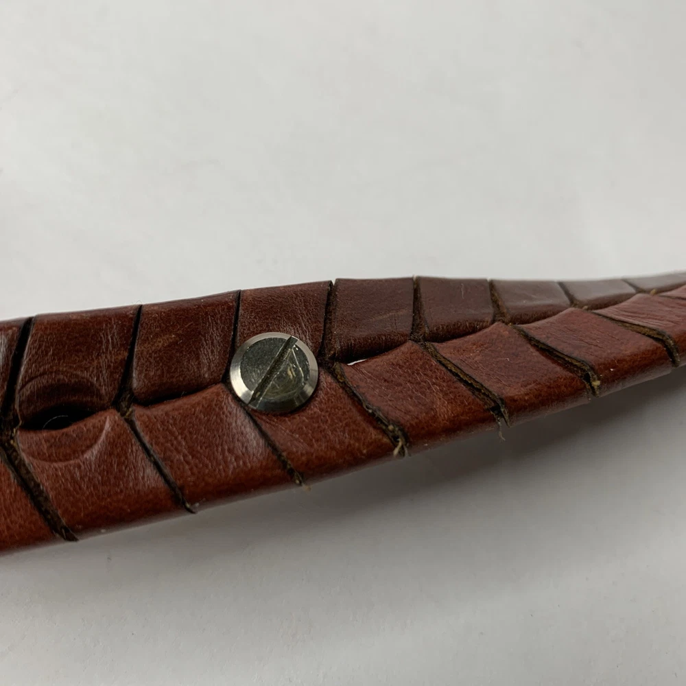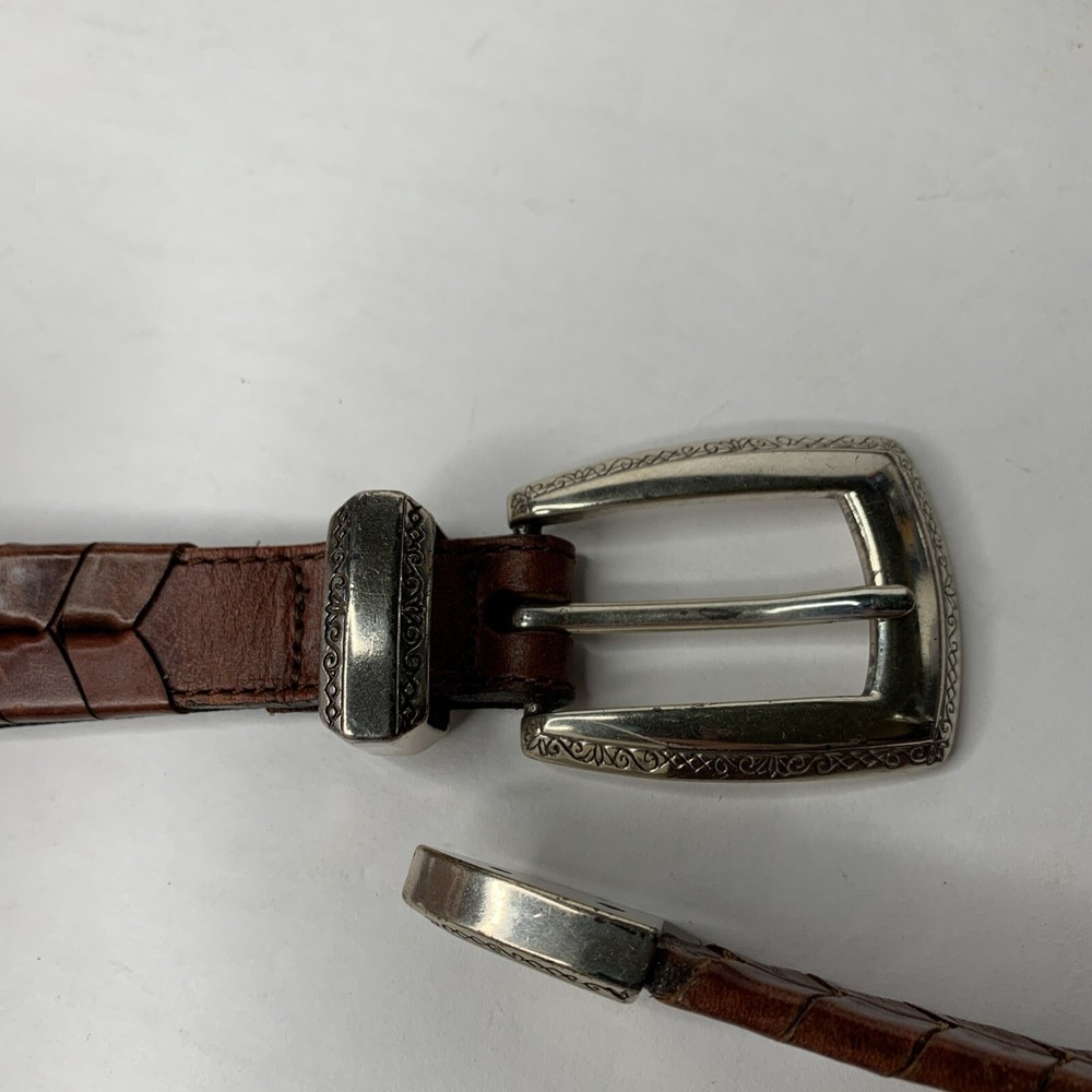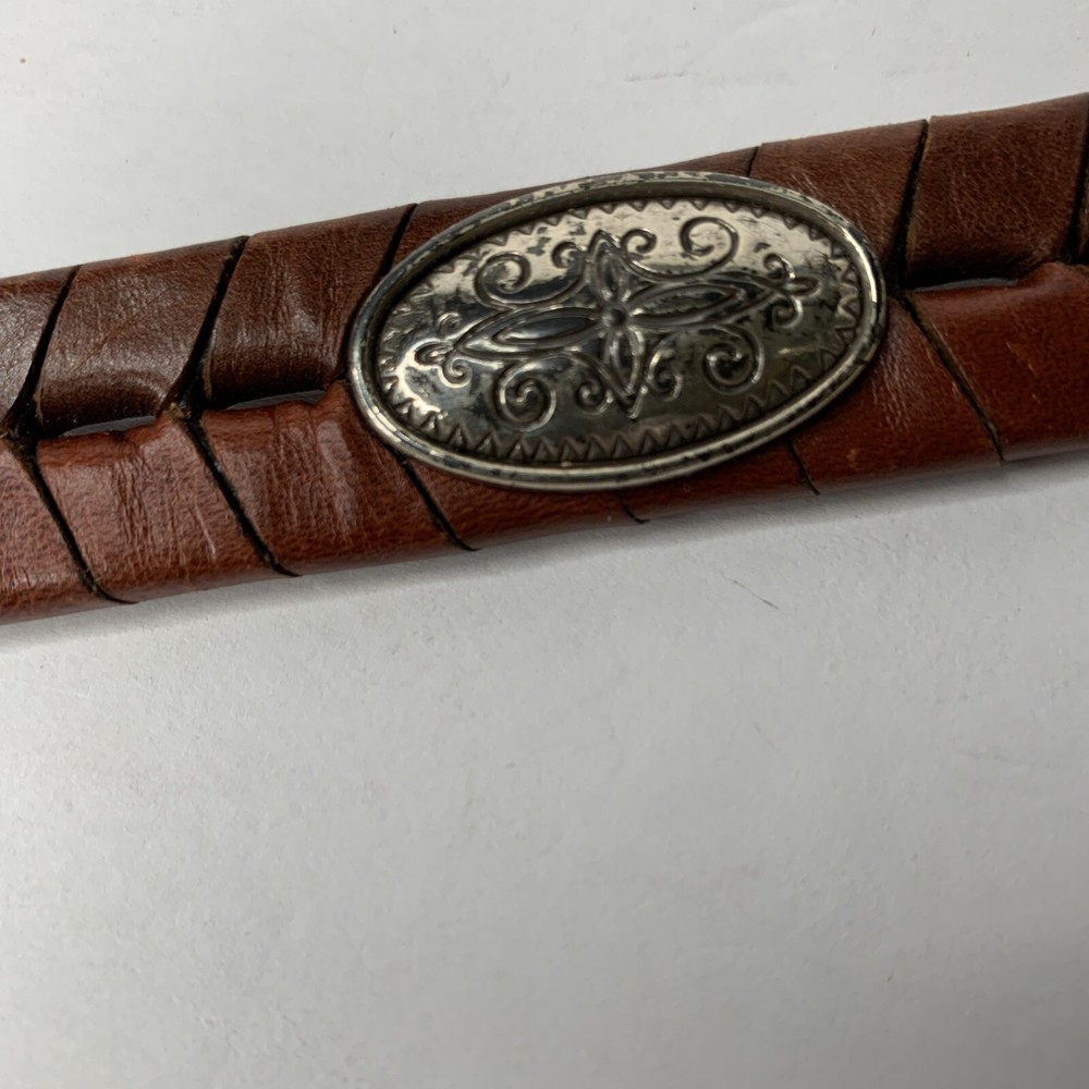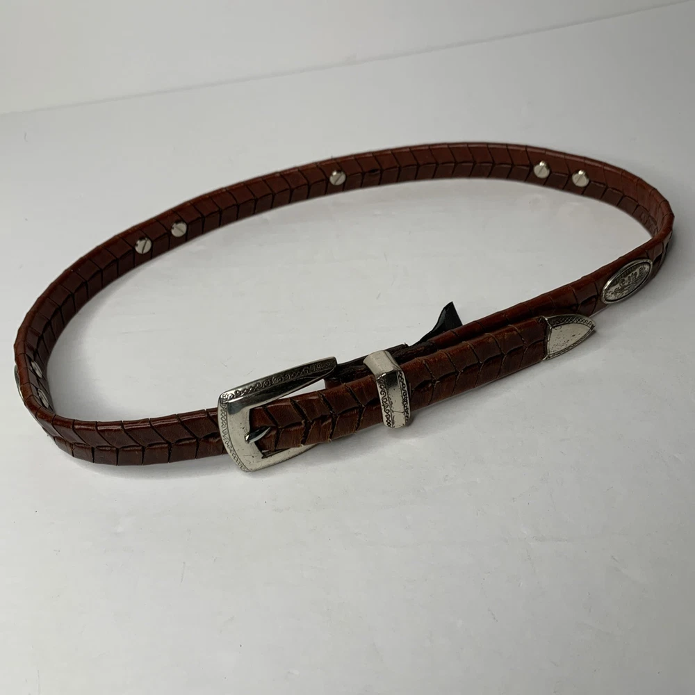 This Brighton belt is a must-have for any cowgirl or bohemian-inspired wardrobe. Made of 100% genuine leather, this braided belt features a stunning brown color and vintage style. The belt is accented with Brighton metal designs on the buckle and tip, and studded details that add a touch of sparkle to any outfit. With a normal 1” belt width and a waist size of 31-34 inches, this belt is perfect for everyday wear or to add a pop of color and style to any outfit. The nickel hardware material ensures durability and the belt is made in China. Add this unique and stylish belt to your collection today! One of the studded accents is loose because of a missing back screw. Please see photos.