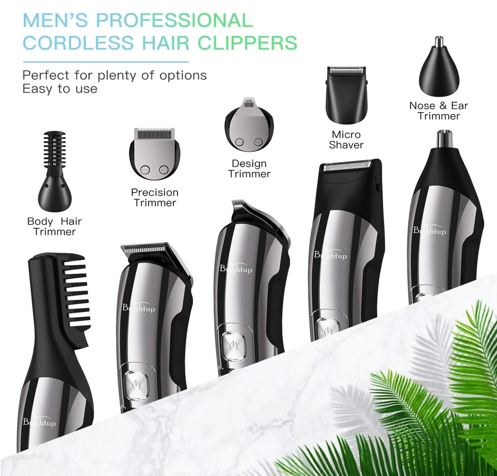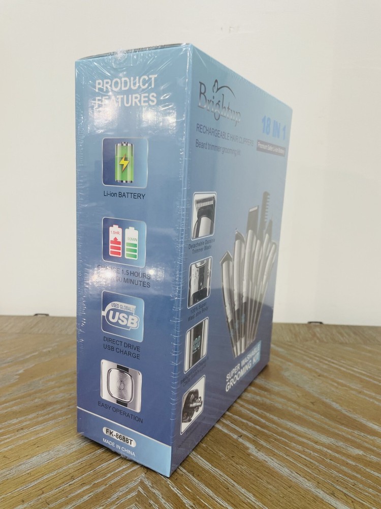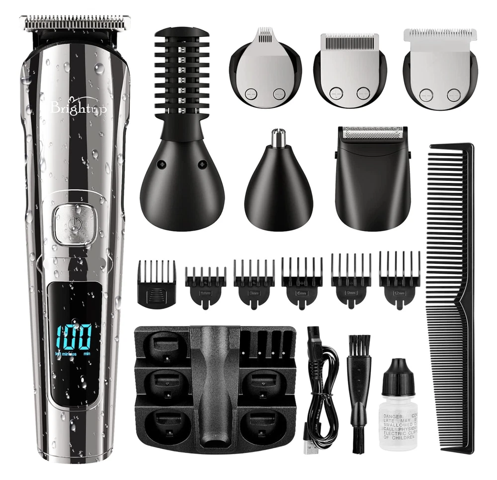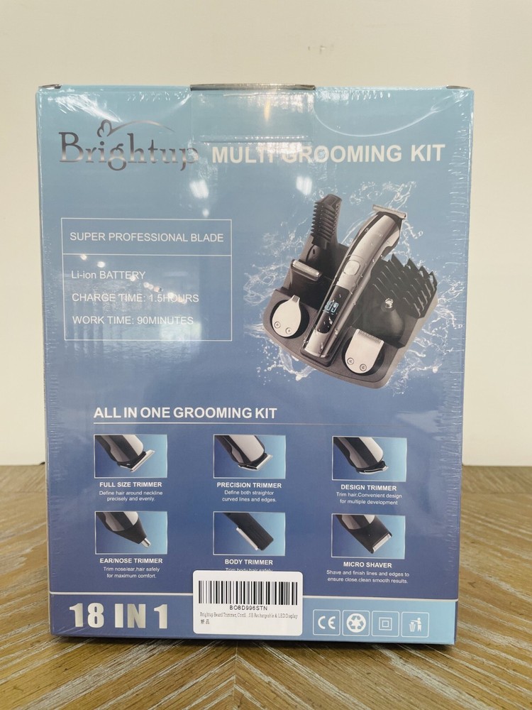 Brightup 18 in 1 Rechargeable Hair Clippers Bread Trimmer Grooming Kit, Super Washable, Premium Safer Li-Ion Battery Brand New In Box and Sealed All in One Beard Trimmer for Men Kit: Our Brightup Manscape all-in-one kit is designed for precision beard trimming and includes 6 trimmer heads and a stand base for easy organization. It also comes with 6 hair trimmer combs that allow you to control the length and style of your beard, body, face, nose, ear, eyebrows, sideburns, neck, groin, leg, pubic hair, ball or other private parts. Whole Body Washable: Our mens beard grooming kit is designed to be fully washable, making it easy to clean after use. The blades are also detachable and can be cleaned with the brush included in the kit. 2 Speed Modes and Low Noise: Our beard trimmers have 2 speed modes. The 7300 RPM speed is suitable for daily use, while the 8800 RPM speed can cut thicker hair more easily. The high-quality motor produces low noise for a pleasant grooming experience. LED Display and USB Rechargeable: The LED display indicates the battery power and reminds you to charge. The built-in rechargeable lithium-ion battery provides up to 90 minutes of run time per charge, and it only takes about 1.5 hours to fully charge. The cordless design makes it easy to use anywhere and is perfect for travel. Self-Sharpening Stainless Steel Blades: The stainless steel blades are self-sharpening and have a precision gap for close trimming. They are also non-corrosive, preventing rust and skin irritation. Ergonomic Design with Travel Lock: The smooth curved handle is comfortable to hold, and the 3-second long press lock design ensures better use. Gifts for Men and One-Year Warranty: This beard trimming kit makes great gifts for men, fathers, husbands, boyfriends, and sons. We also provide a one-year warranty for the Brightup beard trimmer.