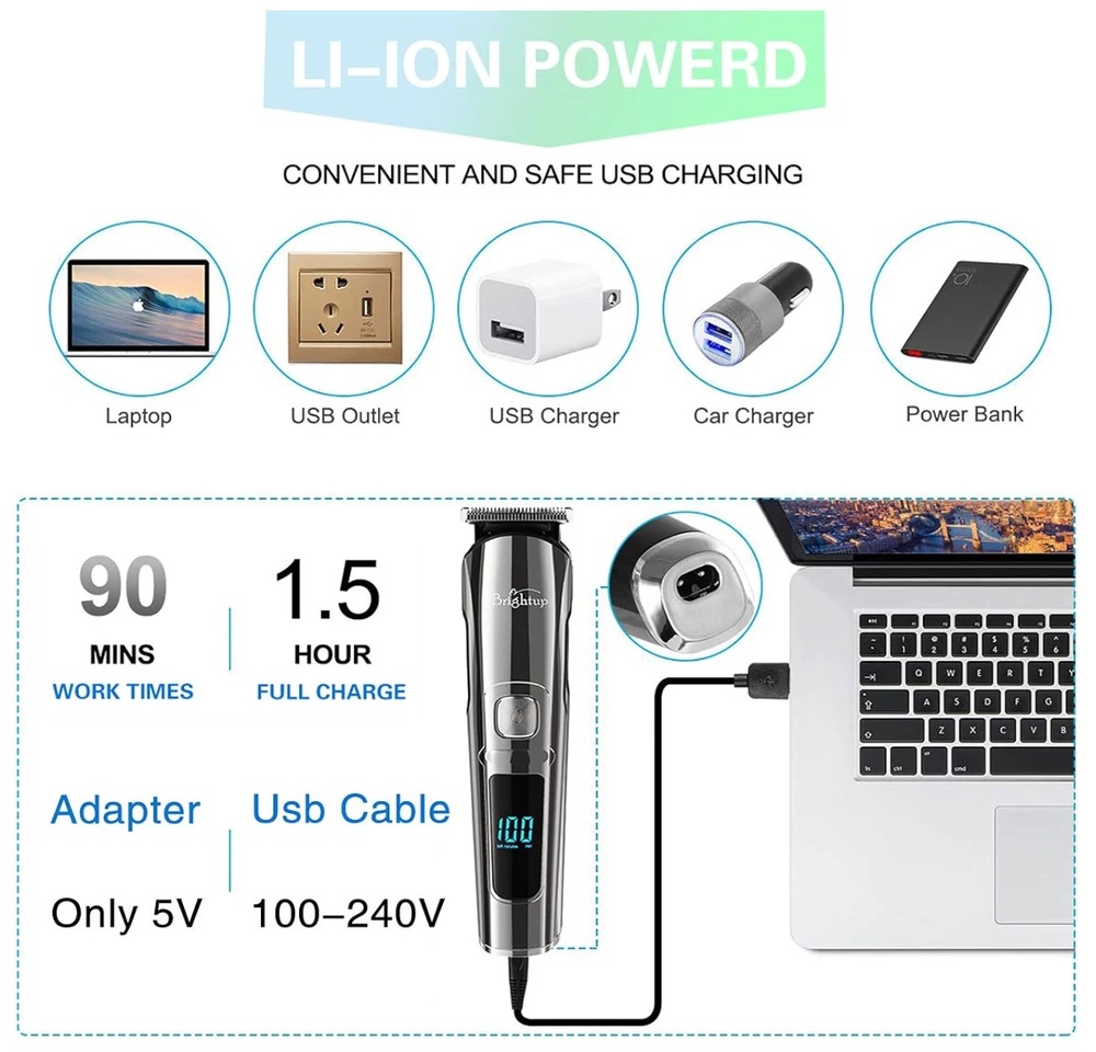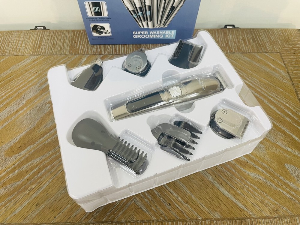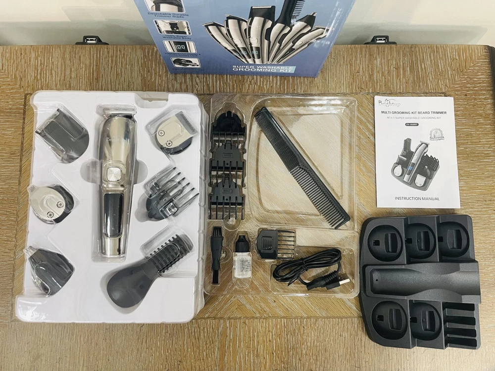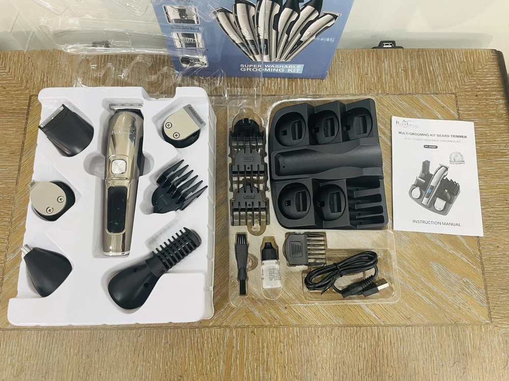 Brightup 18 in 1 Rechargeable Hair Clippers Bread Trimmer Grooming Kit, Super Washable, Premium Safer Li-Ion Battery Brand New In Box and Sealed All in One Beard Trimmer for Men Kit: Our Brightup Manscape all-in-one kit is designed for precision beard trimming and includes 6 trimmer heads and a stand base for easy organization. It also comes with 6 hair trimmer combs that allow you to control the length and style of your beard, body, face, nose, ear, eyebrows, sideburns, neck, groin, leg, pubic hair, ball or other private parts. Whole Body Washable: Our mens beard grooming kit is designed to be fully washable, making it easy to clean after use. The blades are also detachable and can be cleaned with the brush included in the kit. 2 Speed Modes and Low Noise: Our beard trimmers have 2 speed modes. The 7300 RPM speed is suitable for daily use, while the 8800 RPM speed can cut thicker hair more easily. The high-quality motor produces low noise for a pleasant grooming experience. LED Display and USB Rechargeable: The LED display indicates the battery power and reminds you to charge. The built-in rechargeable lithium-ion battery provides up to 90 minutes of run time per charge, and it only takes about 1.5 hours to fully charge. The cordless design makes it easy to use anywhere and is perfect for travel. Self-Sharpening Stainless Steel Blades: The stainless steel blades are self-sharpening and have a precision gap for close trimming. They are also non-corrosive, preventing rust and skin irritation. Ergonomic Design with Travel Lock: The smooth curved handle is comfortable to hold, and the 3-second long press lock design ensures better use. Gifts for Men and One-Year Warranty: This beard trimming kit makes great gifts for men, fathers, husbands, boyfriends, and sons. We also provide a one-year warranty for the Brightup beard trimmer.
