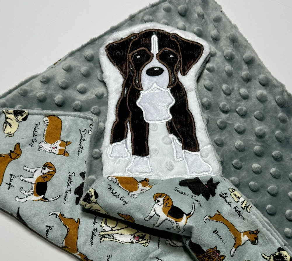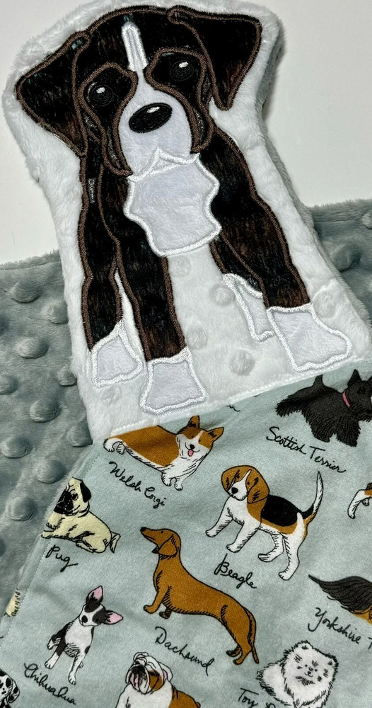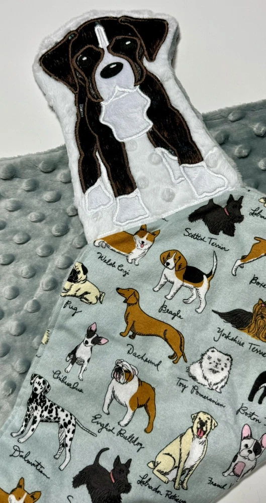 Super sweet baby lovey made by me! Sweet soft minky backing with a high quality flannel paisley print on front. Cute little embroidered animal all in minky. This measures approximately 18”x18”. Meant to be used for comfort or security.