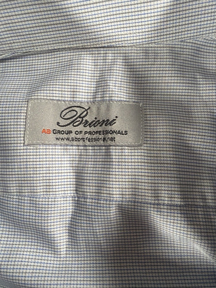 The Brioni Men’s Dress Shirt in size M is a stylish and sophisticated choice for the modern business man. Made from 100% cotton with a medium fabric wash, this shirt features a classic blue micro check pattern, long sleeves, and a collared neckline with button closure. The regular fit and barrel cuff style add a touch of designer flair to your wardrobe. Machine washable for easy care, this shirt is perfect for formal occasions and adding a touch of luxury to your everyday look.
