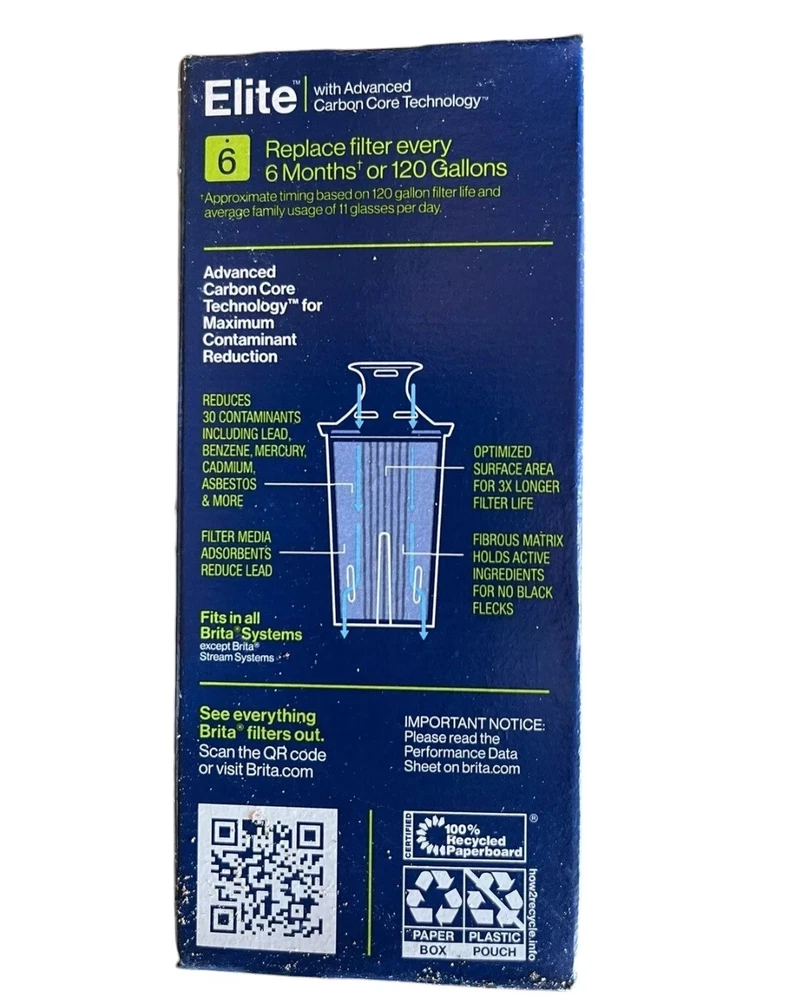 Get cleaner*, great-tasting, water without the waste^ with Brita™ Elite™ water filter replacements; you can save money and replace 1,800 single-use plastic water bottles^ per year; Packaging may vary Reduces 99% of lead, filters Chlorine (taste and odor), Cadmium, Mercury, Benzene, Asbestos, and more; Brita™ Elite™ filters out more than 3x the contaminants vs. standard Brita™ filters* The Brita™ Elite™ lasts 3x longer than Pur filters and 6x longer than standard ZeroWater filters; only replace the Brita™ Elite™ water filter 2x a year, about 6 months** Compatible with all Brita™ pitchers and dispensers except Stream; just insert filter into reservoir, line up pitcher notch with filter groove, press firmly to ensure tight seal Blue in color and made without BPA, Brita™ Elite™ filters feature a pull-top cap for easy removal and with no presoaking, filter installation is fast and simple