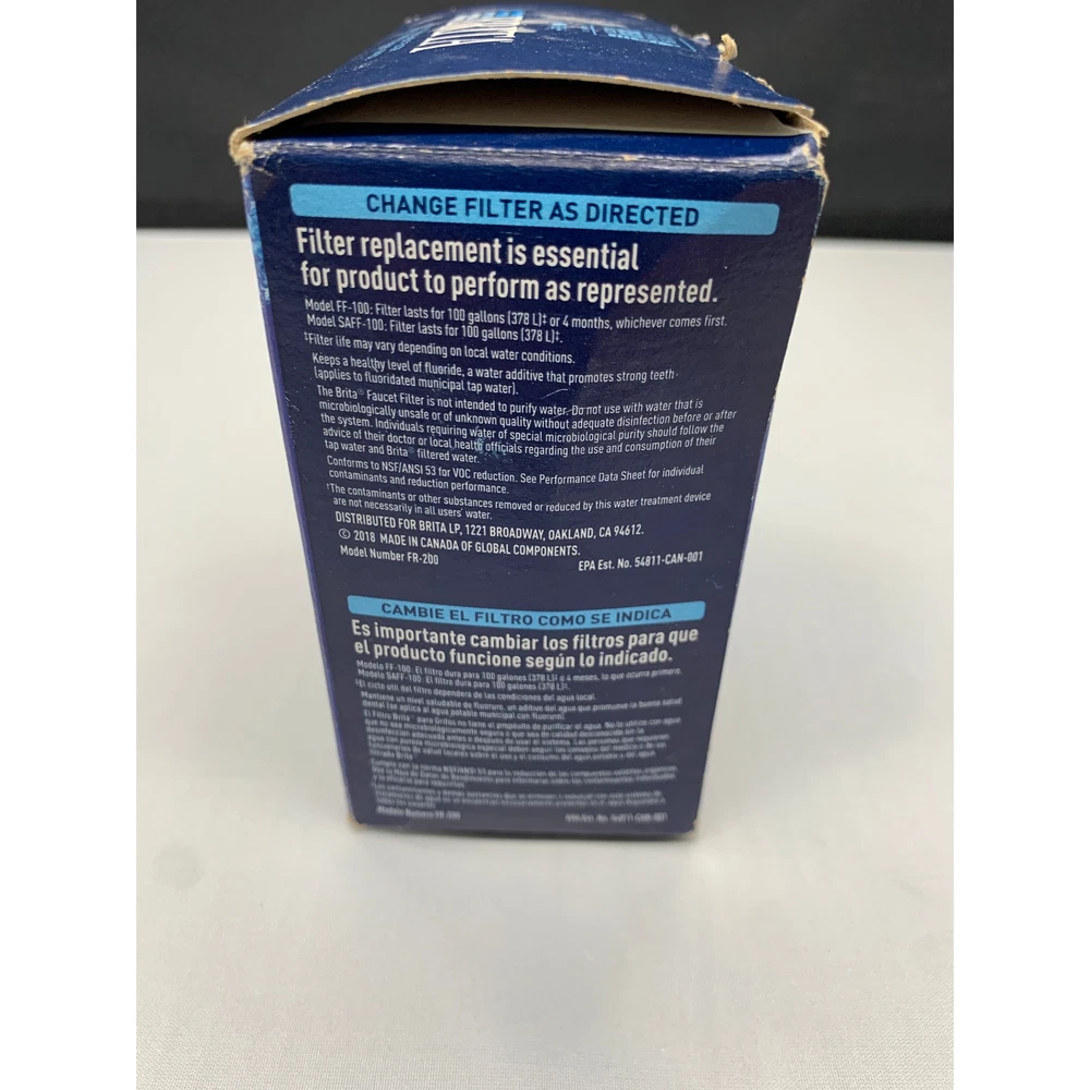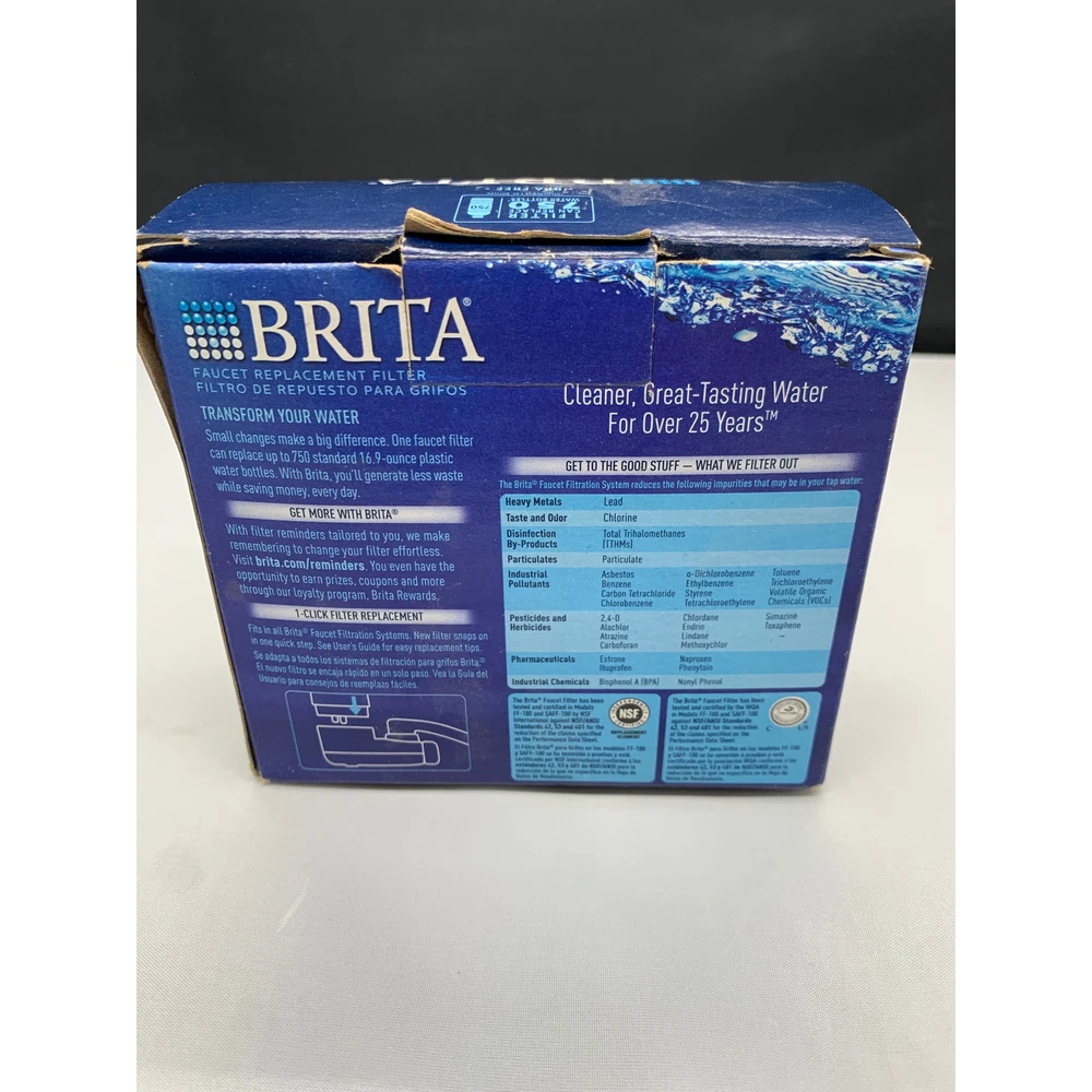 Brita "On Tap" Faucet Water Filter Specs: Filter Life: 100 gallons or 4 months (this may vary depending on water conditions) Brita 42633 Black On Tap Faucet Water Filter Contaminant Reduction: NSF/ANSI Standard No. 53 tested for the Reduction of: VOC, TTHM, O-Dichlorobenzene, leaf, Cysts - Cryptosporidium and Giardia, asbestos, turbidity, carbofuran, alachlor, atrazine, heptachlor epoxide, 2,4-D, chlordane, trichloroethylene, lindane, methoxychlor, chlorobenzene, styrene, toxaphene, ethylbenzene, benzene, endrin, tetrachloroethylene, simazine, toluene, carbon tetrachloride