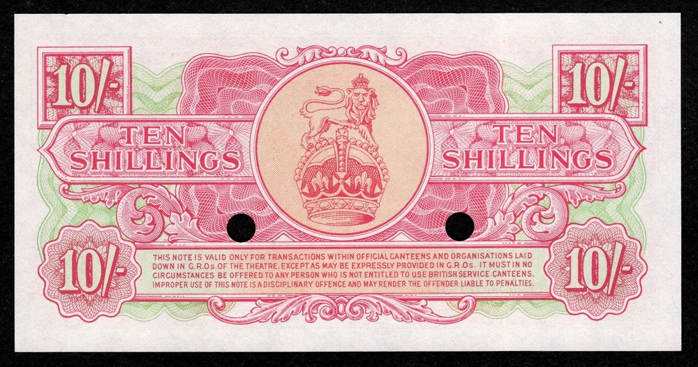 British Armed Forces 10 Shillings 3rd Series Special Voucher UNC Hole Cancelled British Armed Forces 10 Shillings 3rd Series Special Voucher UNC Hole Cancelled Offered here is an original British Armed Forces 10 Shillings Special Voucher , 3rd Series. These vouchers were issued for use in British military canteens and official establishments overseas. Printed by Thomas De La Rue & Co. Ltd., London , they were not legal tender for general circulation but were restricted to authorized military use. Note Details: Issuer: British Armed Forces Series: 3rd Series Denomination: 10 Shillings (10/-) Serial Number: G/T 397909 Printer: Thomas De La Rue & Co. Ltd., London Two hole punch cancellation marks (as issued/redeemed) Condition: This example is Uncirculated . Crisp, original paper Strong embossing and vibrant color Excellent margins No folds observed Hole punch cancelled (typical for redeemed vouchers) The cancellation punches are standard for these issues and do not indicate damage — they confirm official redemption/control. Please review images carefully for your own grading standards. Collector Appeal: A bright, high-grade example ideal for: British military currency collectors Commonwealth paper money collectors Military payment/voucher specialists Type collectors seeking an uncirculated example An attractive 3rd Series British Armed Forces 10/- voucher with strong eye appeal and full originality. The item you see pictured here is the exact item you will receive unless otherwise stated in the description above. We offer FREE domestic shipping with tracking. We accept returns within 30 days of delivery. Please see our Policies below for more information on returns. If this listing has the Best Offer option, then we are willing to listen. Make an offer via eBay’s “Make Offer” button. If there is no “Make Offer” option, then this our best price. We will do our best to respond to questions and/or offers as quickly as possible. For information regarded sales tax and how it might affect your purchase, please see our polices below. S.G. Rare Coins Inc. Polices: SHIPPING : USPS First Class * OR * USPS Priority Mail, Insured and signature required (depending on value). We ONLY ship to the buyer's address that is pre-registered with eBay at the time of purchase/checkout. Any request to ship to an address other than the registered address will be denied and reported to eBay. Orders are generally processed within 1 business day unless otherwise noted or on Time Away. Please allow extra handling time when noted as we occasionally travel to trade shows. Every effort will be made to process your order within a timely manner. TRACKING: Provided for every shipment. Please see your order for the tracking number. Tracking information can take up to 24 hours to show after label is created. INTERNATIONAL ORDERS: The coins and currency categories are NOT currently available for international shipping on eBay's International Shipping Program. Unfortunately, SGRCI does NOT ship outside of the United States at this time. Any request to ship outside of the US will be denied. RETURNS: We accept returns within 30 days of delivery, however, we may issue a partial refund based on current market value at the time of return. PLEASE NOTE : Do not use the eBay return reason "didn't match description or photos" as certified coins and currency have serial numbers which can be authenticated by the eBay approved third-party grading services. If the wrong reason is used to return an item, Sellers are charged with a defect which can cause our eBay fees to increase. This would force us to raise our prices. Please help us keep the prices as LOW as we can! In the unlikely event we shipped the wrong item, the item was damaged during shipping, or we had the wrong photo with the listing, you are welcome to use the appropriate return reason. If the return policy is misused however, you will be reported to eBay. NON-PAYMENT : If payment has not been received after 4 days of purchase/end date of auction and customer has not made other arrangements, we reserve the right to cancel the transaction. SALES TAX: eBay now collects sales tax directly for many US States. Based on the current applicable tax laws, eBay will calculate, collect, and remit sales tax on our behalf (as well as other sellers and registered dealers) for the affected, respective states. We do not calculate, receive or remit the sales tax for any of our transactions . It is all done automatically by eBay. For more information on the new tax laws, please click here . Registered dealers should contact eBay and fill out the proper forms for tax exemption. Please contact eBay directly if you have any questions in regards to sales tax. FRAUD: We reserve the right to cancel any transaction in which fraudulent persons, activities, or funds are suspected. No partial payments, multiple payments, layaway or overpayments will be accepted. PRICES & OFFERS: Auctions and Buy It Now prices are our best prices. Pre-haggled for your convenience! We do our best to consider all reasonable offers, however, we work on extremely close margins. If your offer is not reasonably close to our Buy It Now price, we probably won't be able to make a deal. If you would like an explanation of the value of any item, we would be happy to provide one. POP / POPULATION & PRICE GUIDE INFO are provided at the time of the listing's creation or original start time. We encourage you to double-check independently as populations and price guides are subject to change. SEE AN ERROR? Please let us know! We are human and make occasional mistakes. We would never intentionally list something incorrectly or misleading. QUESTIONS? Please contact us with any questions or concerns. We are always happy to help! Salvatore Germano PNG #481