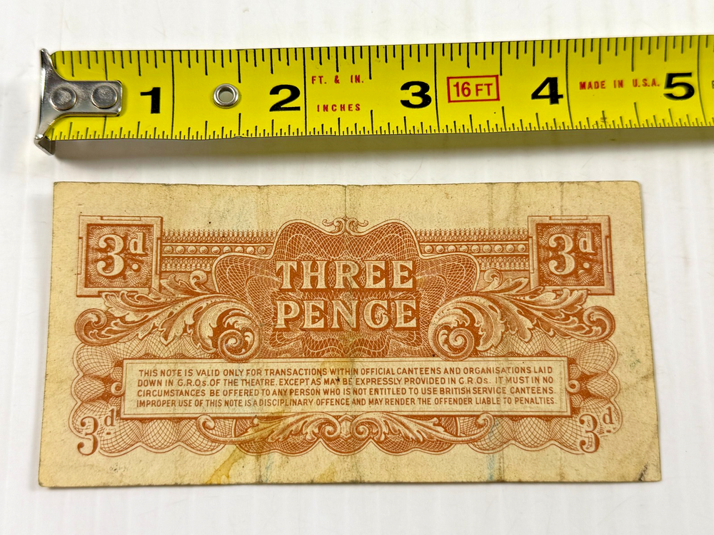 British Armed Forces 3 Pence (3d) Special Voucher 2nd Series issued in 1948 This is a 1948 British Armed Forces 3 Pence Special Voucher, part of the 2nd Series of military currency. Denomination: Three pence (3d). Series: 2nd Series, issued by command of the Army Council. Purpose: These vouchers were created to be used only within official canteens and organizations in occupied Germany after World War II to help curtail the black market. Features: This particular series included a metal security strip rather than a watermark. Printer: Printed by Thomas De La Rue & Company Limited, London. We ship fast!