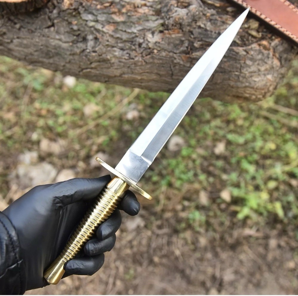 British Army Fairbairn-Sykes Commando Knife – 3rd Pattern Brass Handle with Leather Sheath Overall Length: 13 Inches | Blade Length: 8 Inches A legendary blade with roots in World War II history, the Fairbairn-Sykes Commando Knife is a symbol of elite military craftsmanship. This 3rd pattern replica stays true to the original design, featuring a distinctive solid brass handle with ringed grip for enhanced control and balance. The 8-inch double-edged high carbon steel blade tapers to a fine point, ideal for precise thrusting. A traditional blued finish adds both corrosion resistance and a non-reflective surface, making it suitable for tactical use. Includes a handcrafted leather sheath with secure snap strap and belt loop, perfect for field or display. Specifications: • Overall Length: 13 inches • Blade Length: 8 inches • Handle: Solid brass, ringed grip (3rd pattern design) • Blade: Double-edged, high carbon steel • Sheath: Genuine leather with belt loop • Style: Military/WWII British Commando Replica Perfect for military collectors, history enthusiasts, and knife aficionados.