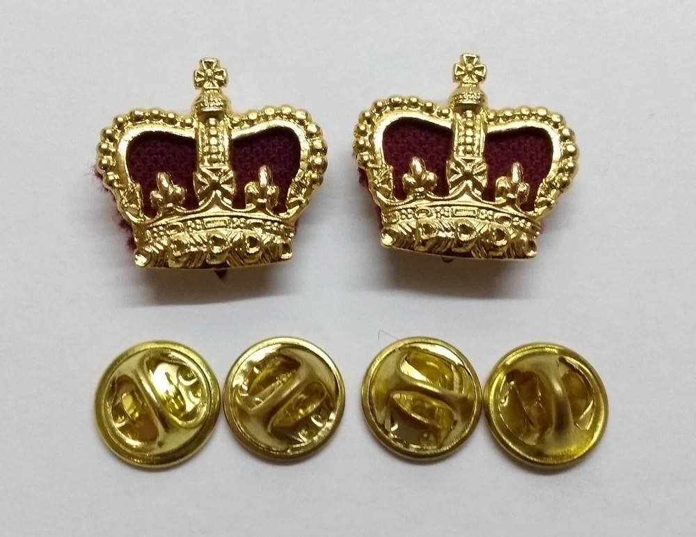 British Military Crowns Rank Insignia Royal Crown With Red Cushion & Clutch Pins 1pair of small British rank crowns (gold colour). This listing is for a pair of badges. Great for customization, costumes or collectors. Condition: New Size: 22.3mm X 21.2mm Approx Photos are stock photos colour shades may differ Please contact me for any further information. Thanks for looking