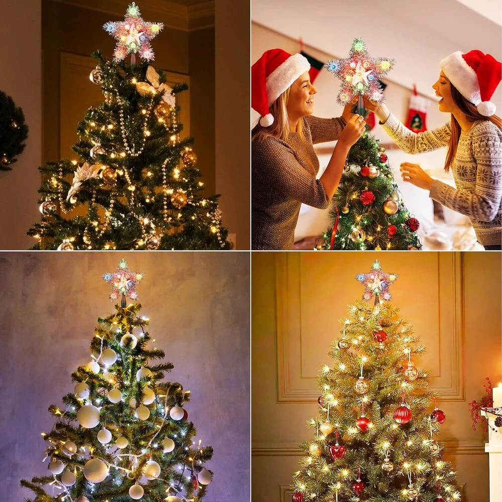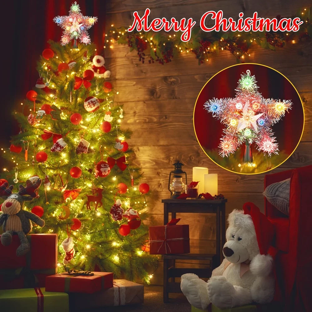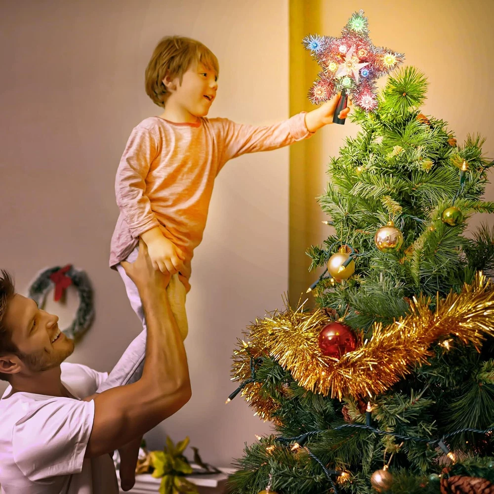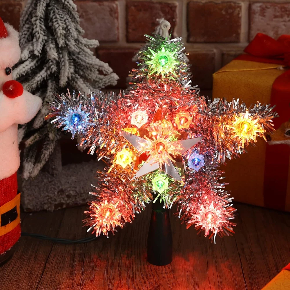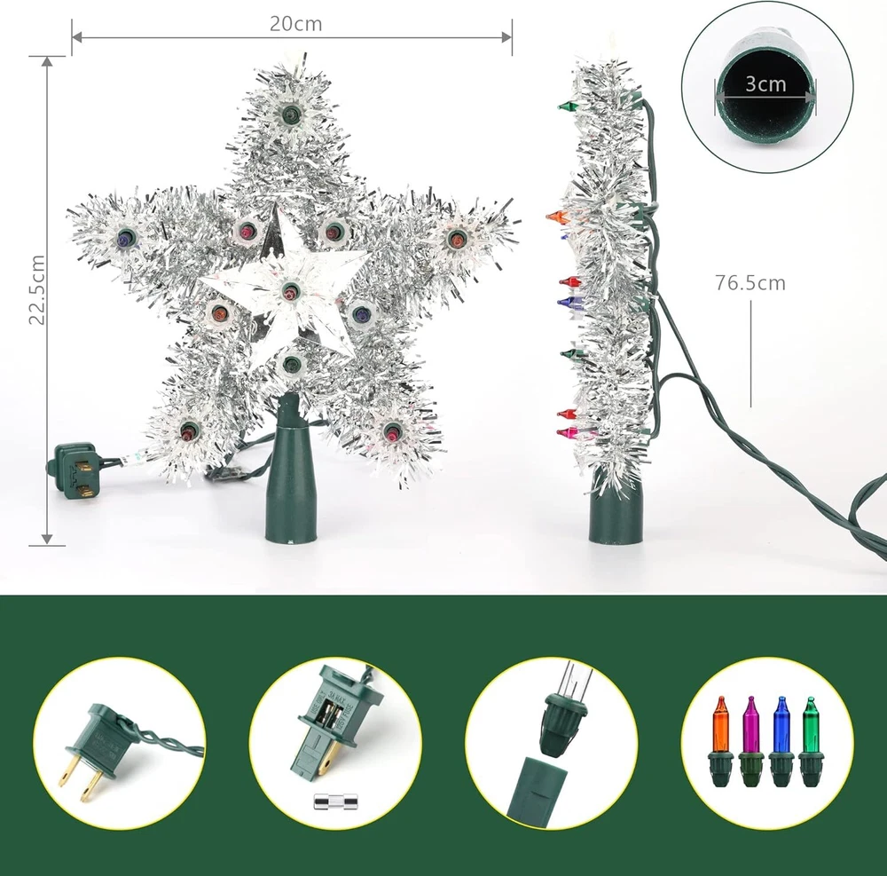 BrizLabs Christmas Star Treetop 1 Pack, Multicolor Topper With Tinsel Product Details Item Weight: 6.4 ounces Package Dimensions: 8.98 x 8.11 x 2.32 inches Size: 1 Pack Color: Multicolor Star Topper With Tinsel Style: Classic Style Batteries Included?: No Batteries Required?: No Shiny Reflective Foil Fringe Treetop Lights: Shiny light up topper, with 11 replaceable multicolored mini lights and numerous tinsels surrounding, classic style, creating a colorful bling bling vision, which is an ideal and considerable Xmas decorations gift for family, relatives, friends, colleagues or yourself. Replaceable Parts: This tinsel tree topper with built in 11 replaceable clear light bulbs, which will be more brighter than before during night lighting. Spare parts will be more important in lighting showing, 4 bulbs and 2 fuses spare included for supporting normal operation. Delicate Christmas Craft: The treetop star is eye-catching in day and nighttime showing, especially the piercing stars and classic patterns can form a different and amazing view and enhance the festival mood. The bottom of the star-shaped tree top is hollow diameter is 1.18 inches. You can easily place it to most of the size of the Christmas tree without any other tools. , May this starry light bring you good lock and health Wide Decorative Applications: This shining star lighted tree top will be perfect for decorating in Christmas party, shopping center, home, park, garden, yard, cafe, pub, bistro, bar, restaurant, office, supermarket, shopping mall, hotel, Halloween, Thanksgiving, New Year, birthday party, wedding, anniversary, ceremony, evening party etc No Christmas tree is complete without a beautiful star on top! And our gorgeous star Christmas tree top is your best choice based on the following advantages: 1. Five-point star tree topper, traditional and delicate, highlights a glittered surface with winding silver wire with built-in soft glowing lights. So it is the ideal way to complete the decoration of your Christmas tree and light up the Christmas spirit! 2. Pre-lit star tree topper, with 11 count incandescent lights, light up pretty with your Christmas lights on the tree, adding a Christmas atmosphere! 3. Upgraded glitter surface with built-in lights design, shining beautifully! 4. UL certified, safe and durable! 5. Green base and lead wire with glittered silver finish, perfect matches your Christmas tree and 2.5ft lead cord allows easy connection with Christmas lights. 6. Easy assemble in minutes, just stick the base of the star into the top of the tree, adjust the angle to keep it upright, connect the plug with the end connector to Christmas lights on the tree (not to exceed 210 watts), done! Specifications: Lights Color: Warm White Wire Color: Green Wire Light Quantity: 11 Counts Base Diameter: 1.18in Length Between The Plug and Star: 2.5ft Package Included: 1 x Star Christmas Tree Topper 2 x Spare Bulbs 1 x Fuse