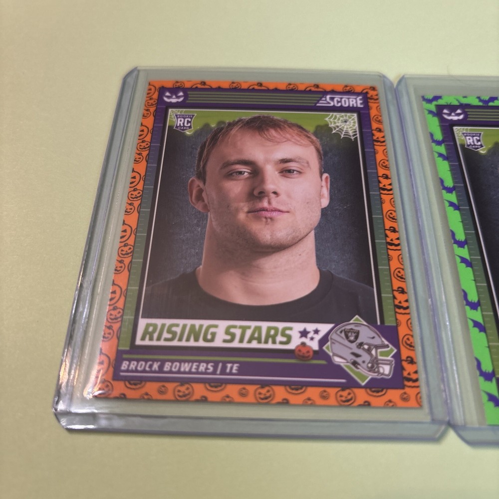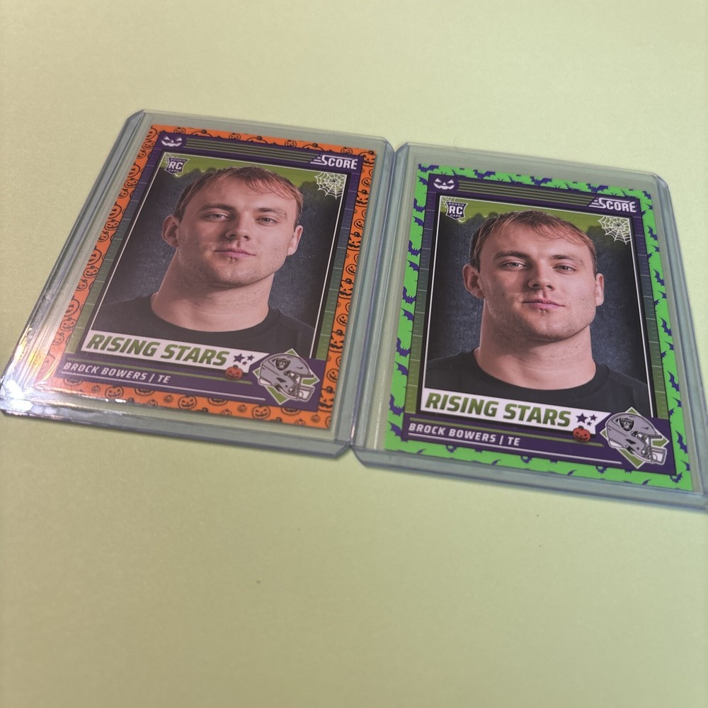 Get your hands on this amazing Brock Bowers 2 Rookie Orange & Green Raiders Bats Pumpkins Combine Ship+ Coupon trading card set from the 2024 Panini Score A Treat collection. This set features two cards with the talented football player and is perfect for any fan of the National Football League (NFL). The cards are manufactured by SCORE and are sure to impress with their unique design and quality. The set includes everything you need to complete your collection and features the rookie season of Brock Bowers. This is a must-have for any sports trading card enthusiast and is perfect for adding to your collection or gifting to a fellow football fan. Don't miss out on this opportunity to own a piece of football history!