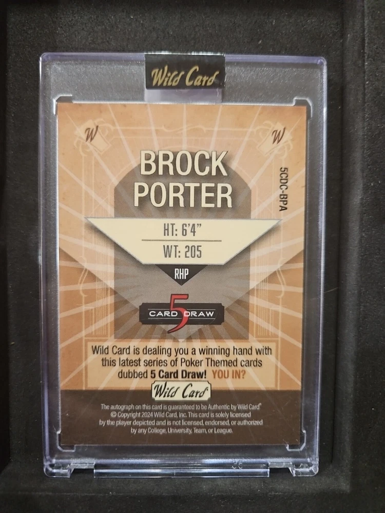 The product is an autographed Brock Porter baseball trading card from the 2024 Wild Card 5 Deck Draw set by Wild Card. The card features Brock Porter, a Major League Baseball player, and is numbered 2 out of 3. The card is in near mint or better condition and is ungraded. This collectible item would be a great addition to any baseball card collection for fans of Brock Porter or trading card enthusiasts.