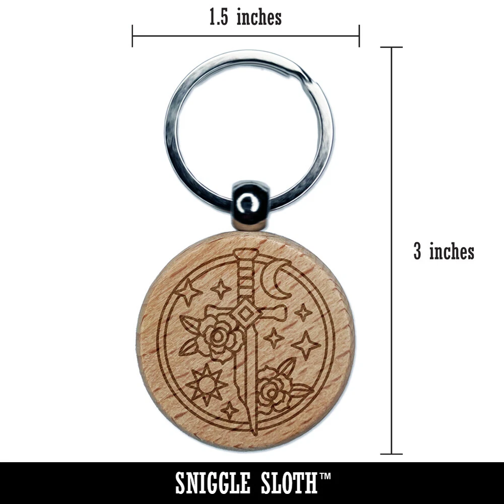 Broken Magical Sword Engraved Wood Round Keychain Tag Charm