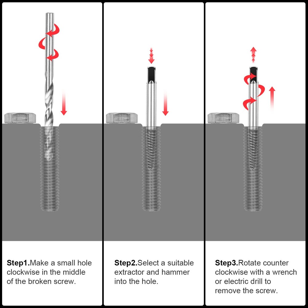 【Reliable Quality】The broken water pipe extractor is made from heavy duty alloy steel, black oxidation with whole body heat treatment, rustproof and sturdy, ensure high hardness and durability, eight different sizes of extractors,basically can meet all the needs of removing debris. 【Square Shank & Deep And Wide Threads】The broken water pipe screw extractor with square end design, allows the extractor to work with wrenches, pliers, tap wrenches or die stocks, aggressive left hand spiral design, easy out style spiral flutes embed themselves to increase grip as resistance increases. 【Easy To Use】Use a drill to drill a deep hole in the screw head, choose a drill bit smaller than the damaged screw, and then reverse the screwdriver counterclockwise into the damaged screw, the operation is convenient and simple,saving a lot of time and energy. 【Eight Size To Choose & Storage Box】8 pcs pipe screw extractor set, #1 for 1/8''-5/32'', #2 for 5/32''-3/16'', #3 for 3/16''-1/4'', #4 for 1/4''-5/16'', #5 for 5/16''-7/16'', #6 for 7/16''-9/16'', #7 for 9/16''-3/4'', #8 for 3/4''-1'', come with a molded box, keep these extractors organized, clean, secure and easy to find. 【Widely Application】The water pipe screw extractor set can remove sunken,peeled,rusted,cracked or corroded screws and bolts,remove broken fasteners, suitable for screws or bolts of various sizes,such as hexagon socket bolts,machine screws,square head bolts,wood screws,hexagon screws,sheet metal screws, are ideal for construction, automotive, home diy projects or for industrial use.