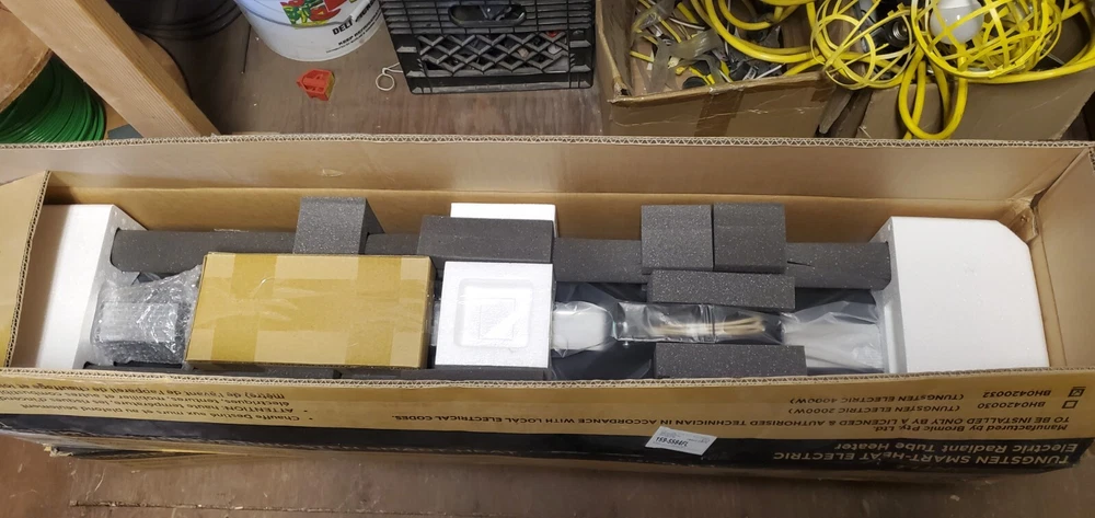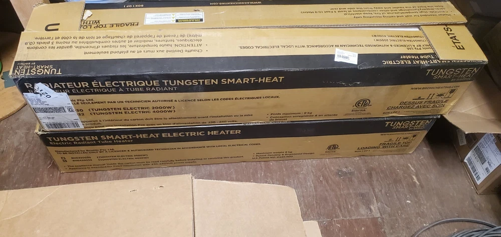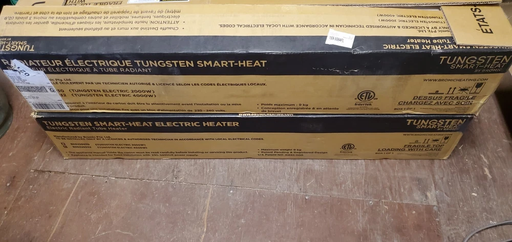 This Bromic Heating Tungsten Electric Double Element Heater is a high-quality heating solution for indoor and outdoor spaces. With a powerful heating rating of 4000-4999 BTU and a voltage of 240V, this heater can cover an area of up to 120 sq ft. The heater is made of stainless steel and has a sleek black color, making it a stylish addition to any space.It has three heat settings and can be controlled through a switch, remote control, or the app. The heater is compatible with Smart Heat Link, and can be mounted on either the ceiling or wall. The heating system uses infrared technology and has double element tubes, ensuring efficient and effective heating. This Australian-made heater has a power of 3.4-3.9 kW and is 44 inches in length, 3.5 inches in depth, and 8.5 inches in width. FEATURES: High temp corrosion-resistant coating Water Ingress Protection Rating Spectral Reflectors for excellent radiant output THESE UNITS ARE BRAND NEW, AND UNUSED. THE BOX WAS OPENED TO VERIFY THAT NOTHING WAS DAMAGED. THEY WERE PURCHASED FOR $907.00 EACH.