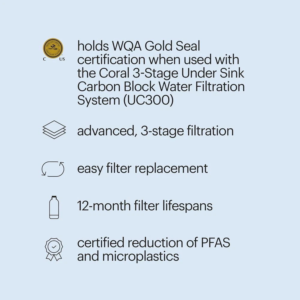 Brondell H2O+ Coral UC300 Three-Stage Undercounter Water Filtration System (UF-35 Replacement Filters) Product Details Is Discontinued By Manufacturer : No Product Dimensions : 24.38 x 34.04 x 14.99 inches; 1.5 Pounds Item model number : UC300 Manufacturer : Brondell Country of Origin : USA Brand: Brondell Special Feature: Easy to Install Product Dimensions: 24.38"L x 34.04"W x 14.99"H Package Information: Bottle Installation Type: Under Sink Power Source: Manual Operation" Or "Na Item Weight: 1.5 Pounds Model Name: UC-300 Maximum Flow Rate: 0.5 Gallons Per Minute Shelf Life: 12 Months MaterialCapacity: UF-35 Replacement filters600 Gallons Included ComponentsPurification Method: Water Purifier with Designer Chrome FaucetActivated Carbon THREE-STAGE FILTRATION: Brondell’s Coral Three-Stage filter set consists of a sediment filter, pre-carbon filter, and carbon block filter. Get rid of physical, chemical, and biological contaminants in your water while leaving behind beneficial minerals. REPLACEMENT WATER FILTER: This sediment and carbon block filter replacement is specifically for the Brondell Coral Under Sink Water Filter (sold separately); It is designed for easy installation, providing great-tasting water for up to 12 Months 3-STAGE CARBON FILTRATION: The sediment filter reduces rust, sand, and particulates; The carbon pre-filter reduces VOCs, chlorine, and other contaminants; The carbon block filter further decreases chemicals, bad tastes, smells, and heavy metals SIMPLE DIY INSTALLATION: The replacement filter can be installed in just a few minutes with a quick and easy twist and seal installation; The change indicator lets you know when a new filter is needed; Includes filter indicator replacement battery