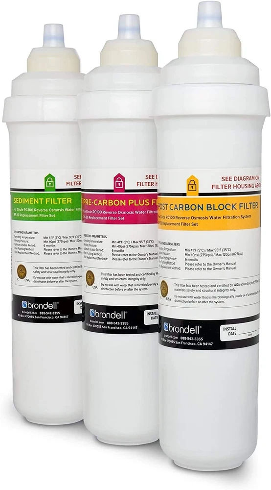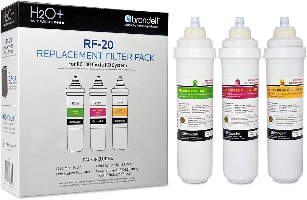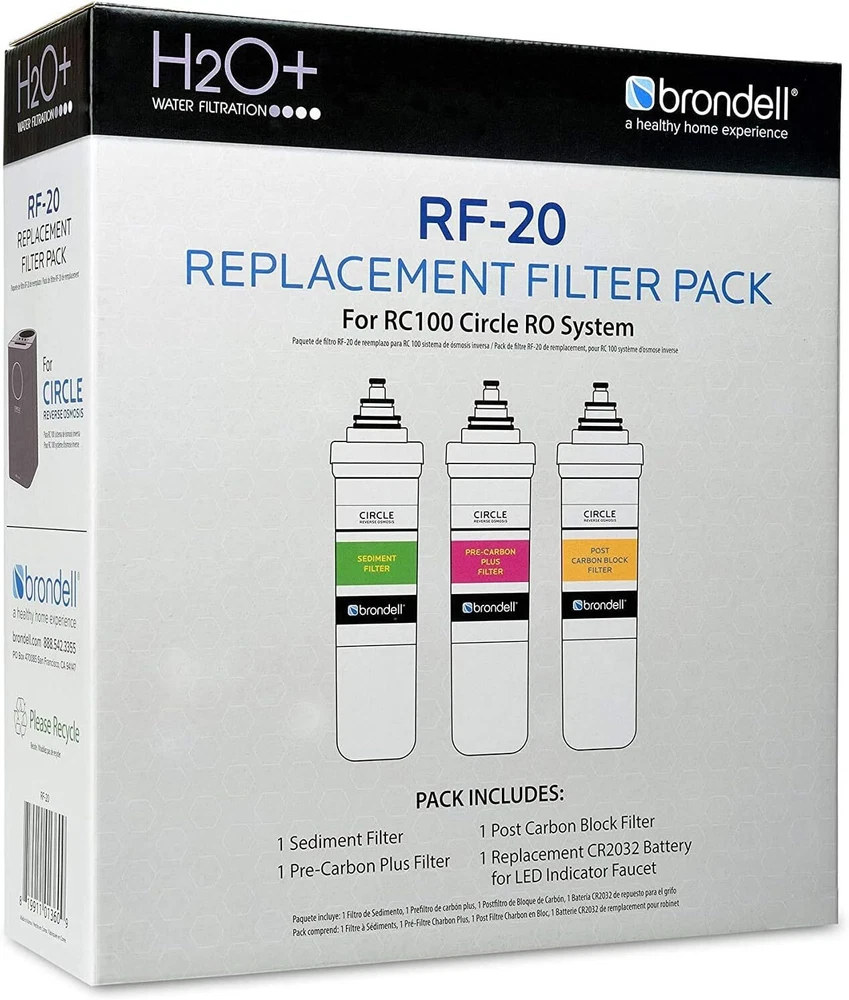 Brondell RF-20 Water Filter Replacement for Circle, Sediment and Carbon Block, Under Sink Reverse Osmosis Filtration System, Lasts 6 Months Product Details Material: Carbon Product Dimensions: 2.75"D x 8.25"W x 11.25"H Item Weight: 2.6 Pounds External Testing Certification: WQA Product Benefits: Removes Pollutants Brand: Brondell Unit Count: 1.00 Count Compatible Water Purifier Models: Brondell Circle RC Number of Items: 1 Item Weight: 2.6 pounds Manufacturer: Brondell Item model number: RF-20 Is Discontinued By Manufacturer: No REPLACEMENT WATER FILTER: This sediment and carbon block filter replacement is specifically for the Brondell Circle Under Sink Water Filter (sold separately); It is designed for easy installation, providing great-tasting water for up to 6 Months AN EXTRA BOOST FROM CARBON: The carbon-based block filtration reduces cloudiness and helps trap unwanted components; Reverse osmosis membrane technology combines with 3-stage carbon filtration to filter water that’s not just safer, but tastier, too CLEAR BENEFITS: The sediment filter reduces rust, sand, and particulates; A carbon block pre-filter reduces VOCs, chlorine, and soluble contaminants; The carbon post-filter further reduces VOCs & lingering contaminants, along with chlorine taste & smell SIMPLE DIY INSTALLATION: The replacement filter can be installed in just a few minutes with a quick and easy twist and seal installation; The change indicator lets you know when a new filter is needed; Includes filter indicator replacement battery We design hygiene products that help protect our planet’s essential resources. From water-saving showers and air purifiers to bidets that help reduce toilet paper and energy use, we’re helping you live more sustainably and it feels better already. Reverse osmosis membrane technology combines with 3-stage carbon filtration to deliver drinking water that’s not just safer, but tastier, too. This filter replacement set is designed for use with the Circle Reverse Osmosis Under Sink Water Filtration System, which features Gold Seal Certification by the Water Quality Association (WQA) for reduction of 64 contaminants, including lead, chlorine, chloramines, industrial chemicals, cysts, and more. To keep your system running at its best, replace your carbon filter set every 6 months. Your purchase also includes a battery replacement for your faucet’s filter change indicator.