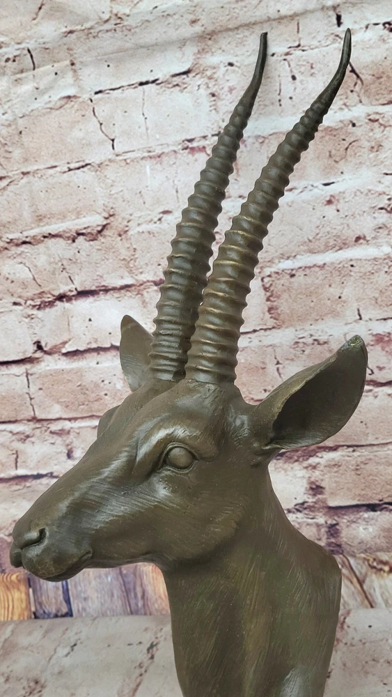 Condition : This sculpture is in perfect condition Bronze Dimensions: Height 16" X Width 8" Weight:8 LBS Inventory:85AL3606458 This stunning bronze gazelle head wall mount captures the essence of a hunter’s trophy, immortalizing the beauty and majesty of this swift and graceful creature. Its lifelike features, crowned by its tall, slender horns, evoke the wild and untamed spirit of the gazelle. This piece serves as a reminder of the animal's natural elegance and agility, making it a striking addition to any space. Known for their remarkable speed, gazelles can reach bursts of up to 60 mph (97 km/h) or sustain a pace of 30 mph (48 km/h). These remarkable animals inhabit the deserts, grasslands, and savannas of Africa, as well as regions in southwest and central Asia and the Indian subcontinent. This sculpture pays tribute to their ability to thrive in such diverse and challenging environments while celebrating their enduring beauty. Handcrafted using the traditional lost-wax casting method, the bronze sculpture is finished with a rich brown patina for preservation and an air of timeless sophistication. Signed by the artist Nick, this piece is a testament to the artistry and skill required to capture the essence of one of nature’s most captivating creatures. Art Deco Original Gazelle Head Bust Trophy Bronze Statue Sculpture Wall Mount Video will open in a new window Using the eBay App? Paste link into a browser window: [isdntekvideo]