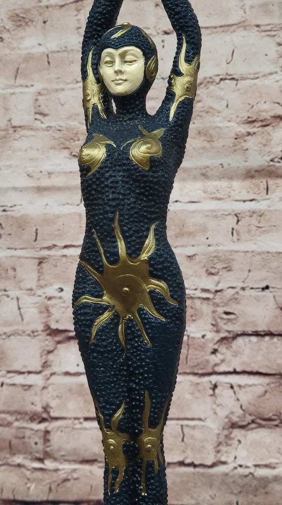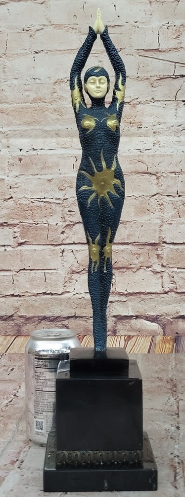 Condition : This sculpture is in perfect condition. Bronze Dimensions with Marble Base: Height 18.5" X Width 4" Marble Dimensions:4" X 4.5" Height without base:14.5" Weight:8 LBS Inventory:67EP184MC7776 This stunning bronze sculpture captures the elegance and poise of a female Egyptian dancer, delicately balanced on tiptoe in a graceful pose. Her intricate outfit, adorned with starfish decorations, adds a touch of exotic charm and enhances the fluidity of her movement. Every detail of her posture and attire reflects the timeless allure of Egyptian artistry, blending seamlessly with the refined aesthetics of the Art Deco era. Inspired by the renowned works of the famous Romanian sculptor Demetre Haralamb Chiparus (1886–1947), this piece pays homage to his mastery in creating exquisite dancer sculptures. Chiparus was celebrated for his ability to infuse movement and emotion into bronze, and this sculpture beautifully echoes his signature style. Crafted from high-quality bronze and meticulously painted in soft pastel colors, the figure exudes lifelike charm and sophistication. Mounted on a square tiered marble base with bronze embellishments, the sculpture is both a visual and tactile delight. The combination of luxurious materials and expert craftsmanship makes this artwork a striking addition to any collection, bringing the glamour and elegance of the Art Deco period into any space. Art Deco Style Cold Painted Bronze Dancer Sculpture after Chiparus Statue Video will open in a new window Using the eBay App? Paste link into a browser window: [isdntekvideo]