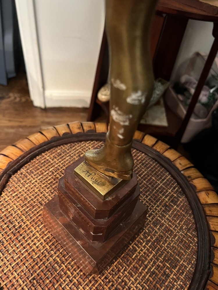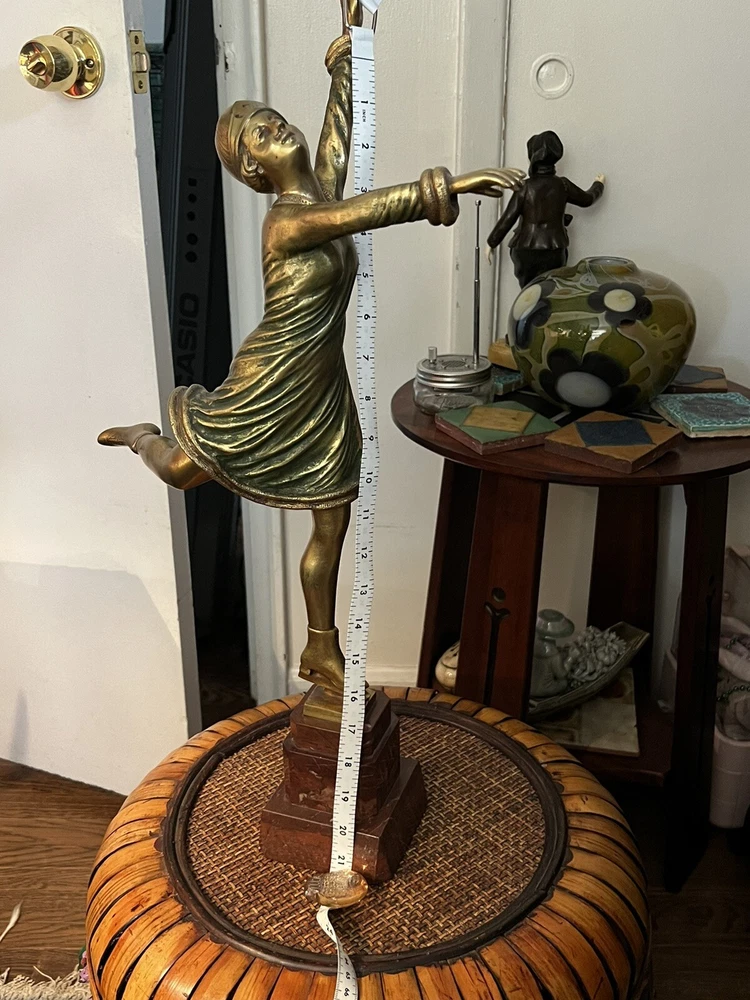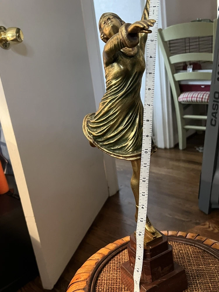 Gracefully capturing the elegance of a skater in mid-pose, this Art Deco ice skater sculpture is a timeless piece that beautifully embodies the chic style of its era. Crafted from high-quality bronze, the sculpture rests atop a polished marble base, enhancing its classical appeal and adding to its overall sophistication.The work is signed, indicating its authenticity and the artist's touch, making it a collectible treasure for enthusiasts and connoisseurs alike. Its striking presence is sure to be a conversation starter, whether placed in a private gallery or as a standout piece in a entryway. It's in wonderful condition, little wear of some of the gold paint on the one calf of a leg, but it could easily be touched up with some gold paint, no breaks, scratches, it's in overall great shape, would be great entryway piece. Artist signed, she is 19" without stand and 23" with marble base.