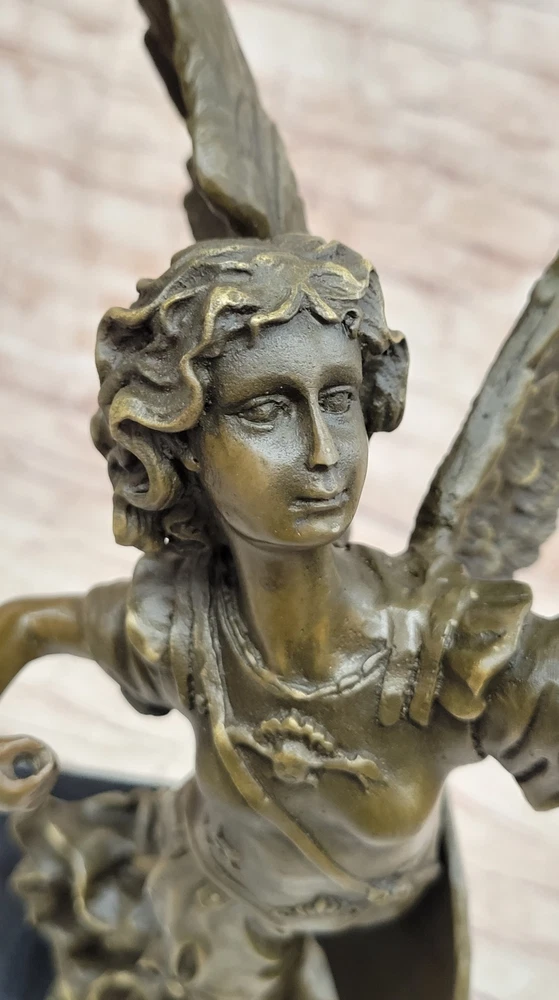Condition : This sculpture is in perfect condition. Bronze Dimensions with Marble Base: Height 18" X Width 10" Marble Dimensions: Diameter 6" Height without base:17" Weight:17 LBS Inventory:40DS2597902 Embrace the divine presence of the Archangels with this captivating bronze sculpture that embodies the majestic essence of Archangel Gabriel. As one of the foremost hierarchs in the celestial realm, Archangel Gabriel is a harbinger of GOOD NEWS, a divine messenger who carries the voice of God. With a name that means "Hero of God," Gabriel's ethereal guidance brings forth foreknowledge of forthcoming events, transformative changes, and new opportunities. This archangel's radiant energy revitalizes stagnant aspects of life, infusing light into relationships, businesses, and households. Notably, while angelic beings transcend gender, Gabriel has occasionally manifested in a distinct female form, symbolizing the fluidity of divine presence. Crafted with meticulous attention to detail, this exquisite bronze statue portrays Archangel Gabriel prepared for cosmic battle, clutching a sword as a symbol of divine authority. The statue's impressive dimensions of 20 inches in height, 10 inches in width, and 9 inches in depth capture the archangel's formidable presence. Made from solid bronze, the sculpture exudes the essence of luxury and refinement, reminiscent of more expensive bronze artworks. Each stroke of hand-painted accents enhances the sculpture's allure, showcasing the artist's skill in bringing out intricate features. This stunning statue, signed by the accomplished artist Houdon, serves as a meaningful and cherished gift for both family and friends. Embodying the transcendental essence of Archangel Gabriel, it invites divine blessings and protection into the lives of those who possess it. Whether displayed as a centerpiece or a focal point, this bronze masterpiece is a testament to the eternal intercession of the Archangels and a profound addition to any sacred space or collection. 20" Tall Archangels Nike Angel of Victory Mythical Bronze Sculpture Statue Decor Video will open in a new window Using the eBay App? Paste link into a browser window: [isdntekvideo]