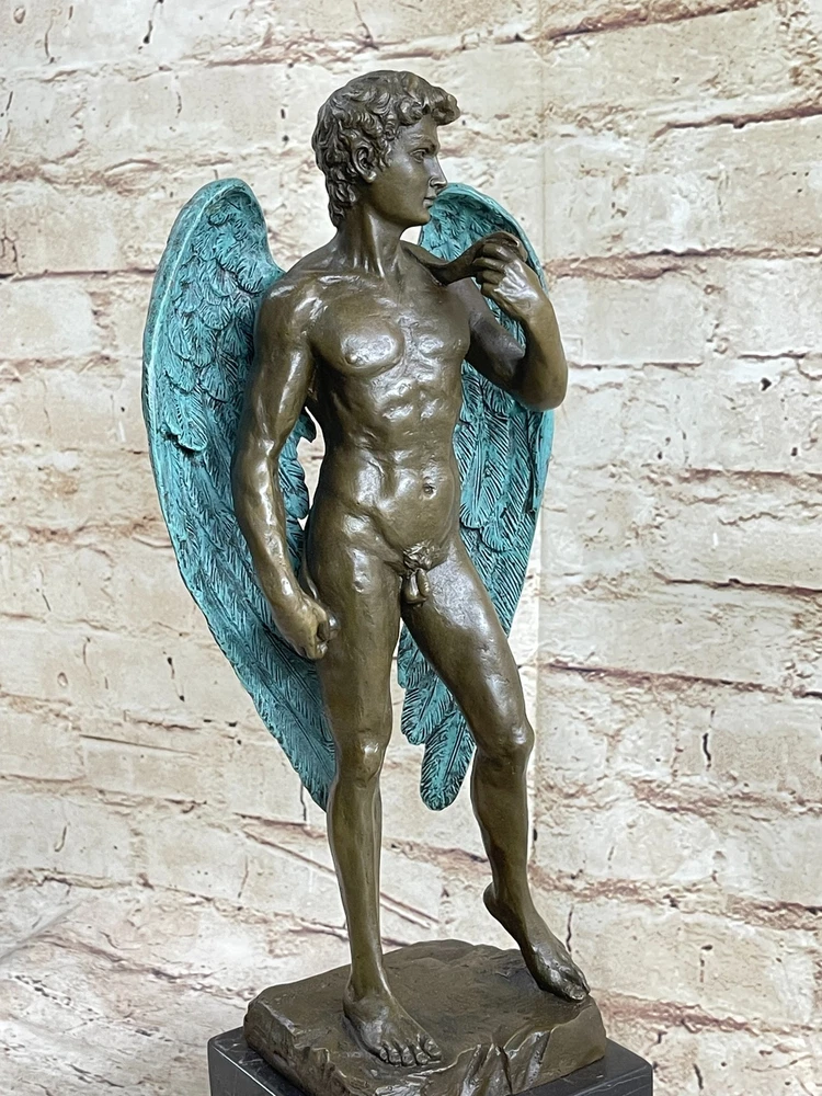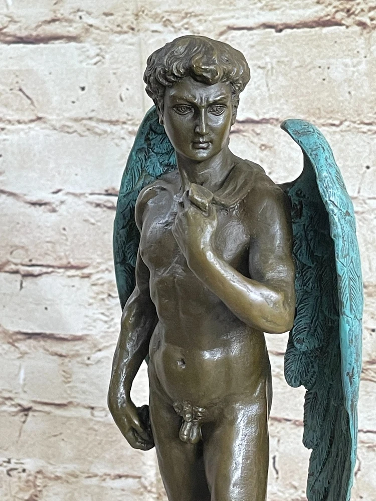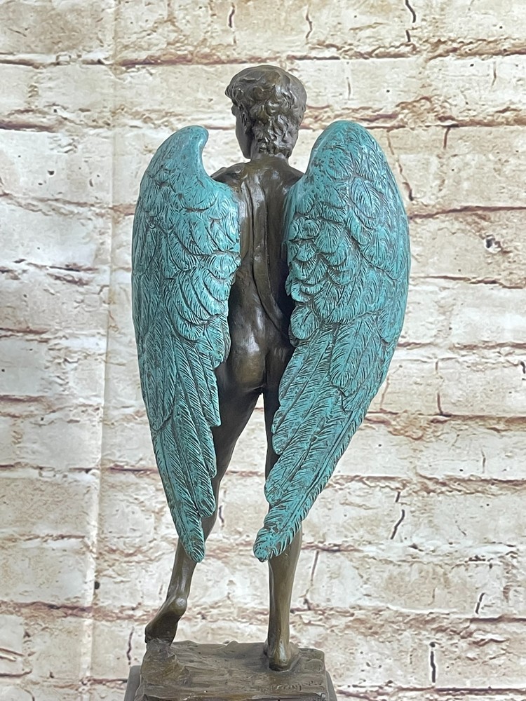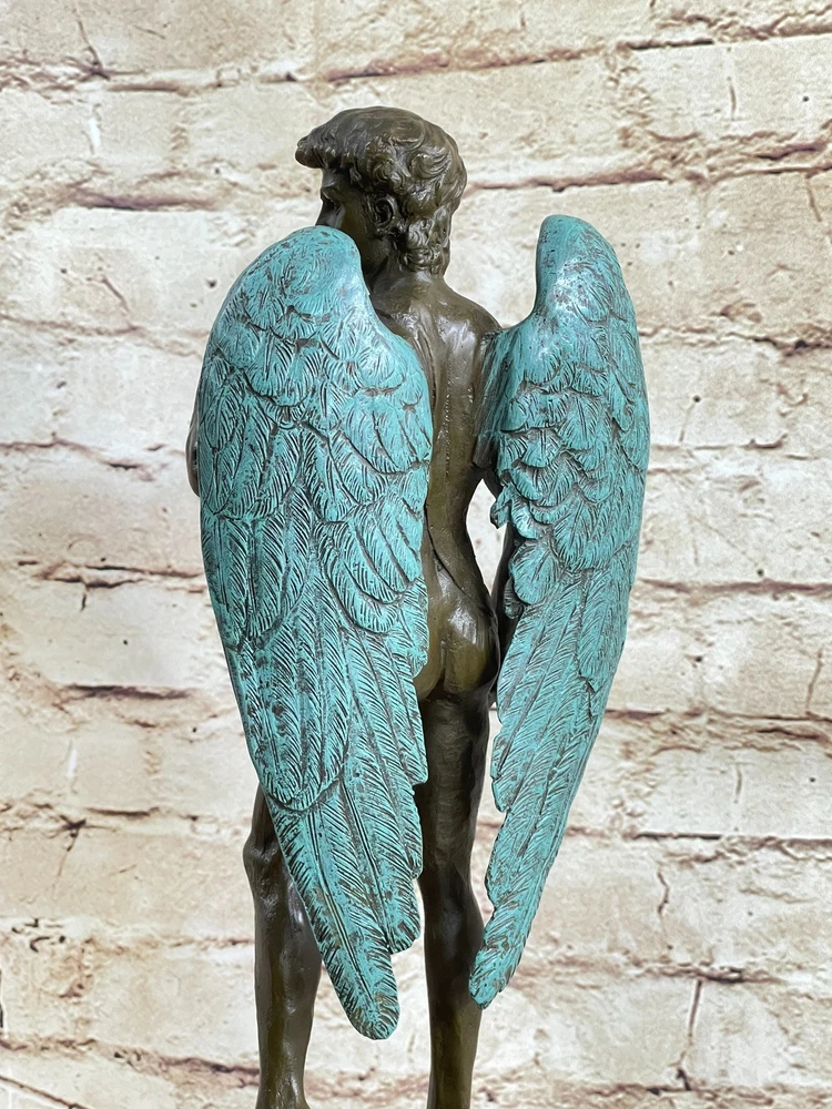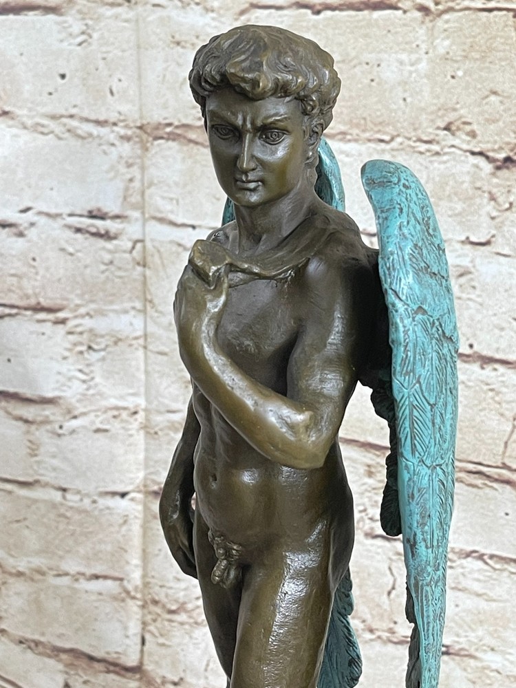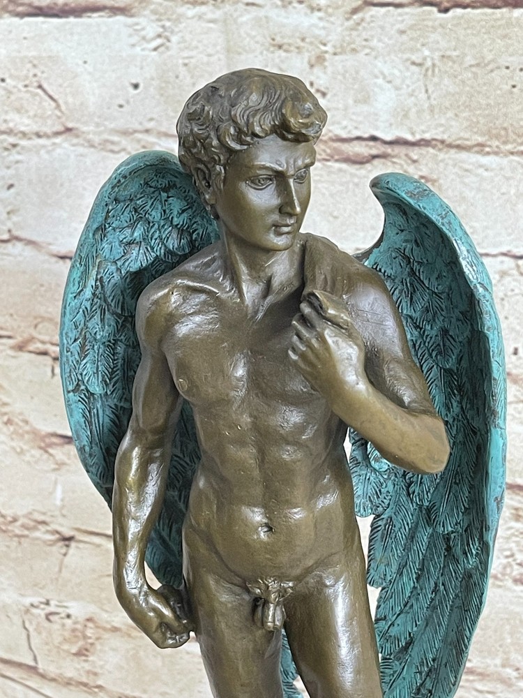 Condition : This sculpture is in perfect condition. Bronze Dimensions with Marble Base: Height 15" X Width 6" Marble Dimensions: Diameter 5" X 5" Height without base:12" Weight:12 LBS Inventory:23EP355B5832 This magnificent bronze statue of David captures the essence of the iconic masterpiece, showcasing his timeless beauty and strength. Standing tall, the nude figure is a testament to the artist's meticulous craftsmanship, with every detail of David's muscular physique meticulously rendered in a rich brown patina. His well-defined abdomen, broad shoulders, and powerful arms are highlighted, underscoring the idealized male form. One of the most captivating features of this sculpture is David's majestic wings. Crafted with intricate detail, his expansive wings, finished in a striking brown and green patina, tuck gracefully behind him, extending down to his calves. The inner feathers of the wings exhibit remarkable craftsmanship, with a transition from smaller feathers at the top to longer, more intricate feathers toward the bottom. This sculpture is a masterful representation of David, the angel, and a true work of art. Crafted with care and precision, this 100% bronze sculpture was created using the ancient "Lost Wax Method." It is mounted on a sleek black marble base, adding to its visual appeal. This extraordinary piece proudly bears the signature of the renowned artist Michelangelo, making it a valuable addition to any art collection or a striking focal point in your home or office. MICHAEL ANGELO NUDE FAIRY MYTHICAL BRONZE SCULPTURE ART DECO HOT CAST FIGURINE Video will open in a new window Using the eBay App? Paste link into a browser window: [isdntekvideo]