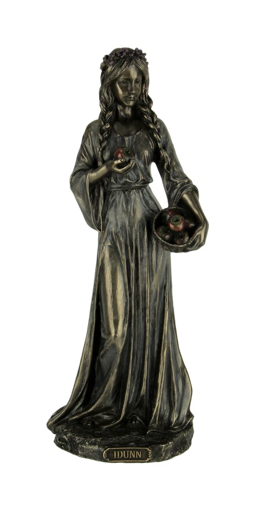 In Norse mythology, Idunn is the goddess associated with youth and apple, she is also the wife of Bragi, the god of poetry. Idunn is the keeper of the magic immortality apples, which the Norse gods must consume to avoid old age. The trickster god Loki once tricked Idunn and kidnapped Idunn to the realm of the giants which caused the other Norse gods to grow old, Loki later rescued Idunn by turning into an eagle and carrying her away in his claws. This beautifully crafted cold-cast bronze statue of Idunn measures 8.5 inches high, 3.25 inches long, and 3 inches wide, and depicts her standing in a dress on a stone path holding a basket of magic apples in her hands, and wearing a crown of pink flowers in her hair. Our eBay Store About Us Add to Favorite Sellers Bronze Finish Idunn Norse Goddess of Spring and Youth Statue OVERALL SIZE - 8.5 Inches High, 3.25 Inches Long, 3 Inches Wide Intricately Sculpted in Cold Cast Bronze with Lifelike Character Showing Fold Lines On the Dress, a Stone Texture On the Base and a Soft Expression On Idunn's Face Polished Bronze Finish with a Grey Color Wash On the Dress and Red On the Apples Depicts Idunn Standing On a Stone Path Holding a Basket of Magic Apples Her Left Hand and One In Her Right, She Wears a Crown of Pink Flowers in Her Long Braided Hair A Beautifully Detailed Work of Art and Makes a Wonderful Gift for Anyone Interested in Norse Mythology In Norse mythology, Idunn is the goddess associated with youth and apple, she is also the wife of Bragi, the god of poetry. Idunn is the keeper of the magic immortality apples, which the Norse gods must consume to avoid old age. The trickster god Loki once tricked Idunn and kidnapped Idunn to the realm of the giants which caused the other Norse gods to grow old, Loki later rescued Idunn by turning into an eagle and carrying her away in his claws. This beautifully crafted cold-cast bronze statue of Idunn measures 8.5 inches high, 3.25 inches long, and 3 inches wide, and depicts her standing in a dress on a stone path holding a basket of magic apples in her hands, and wearing a crown of pink flowers in her hair. Product Details Color Bronze Height 8.5 Length 3.25 Weight 1.05 LB
