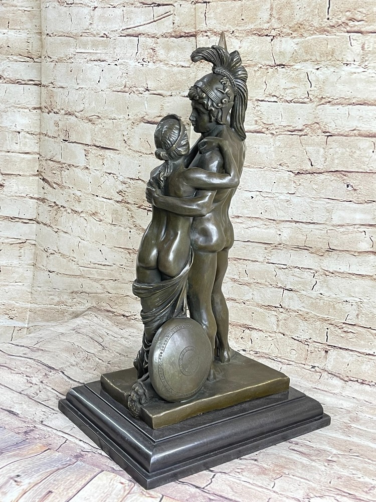 Greek and Roman Mythology Male and Female God and Goddess Bronze Statue Gift Art Greek and Roman Mythology Male and Female God and Goddess Bronze Statue Gift Art Condition : This sculpture is in perfect condition. Bronze Dimensions with Marble Base: Height 20" X Width 10" Marble Dimensions:10" X 8" Height without base:19" Weight:25 LBS Inventory:78Y11813287 This exquisite bronze sculpture captures a tender moment between a Roman soldier and a woman, skillfully crafted by the renowned artist Ellis. The soldier stands tall, adorned with a decorative feathered helmet symbolizing his power and status. A single leaf delicately placed between his legs adds a subtle touch of realism. Beside him, a woman draped in a cloth that cascades to the base gazes lovingly up at him, her ponytail revealing her expressive face. She embraces him, while he reciprocates with one arm around her and the other holding a tall spear, both sharing a passionate gaze in this intimate scene. The authenticity of the details is remarkable, showcasing Ellis's exceptional artistry. This sculpture was cast using the ancient "Lost Wax Method," a technique that ensures intricate details are preserved, resulting in a piece that adds grace and beauty to any space. The sculpture is mounted on a black marble base, enhancing its visual impact and stability. The artist's signature on the base attests to its authenticity and craftsmanship. This sculpture not only serves as a captivating work of art but also as a testament to the enduring power of love and connection. Its presence in your home or office will undoubtedly be a conversation starter, inviting admiration for its beauty and the story it tells. Whether you're an art enthusiast or someone who appreciates the timeless themes of love and strength, this piece is sure to leave a lasting impression. For a deeper understanding of the "Lost Wax Method" used in creating such sculptures, you might find the following video informative: SIGN ARTISIAN ELLIS NUDE ROMAN WARRIOR BRONZE STATUE SCULPTURE FIGURE FIGURINE Video will open in a new window Using the eBay App? Paste link into a browser window: [isdntekvideo] Shipping Terms : Most of our items are shipped via USPS (United States Postal Service) mail or UPS. Most orders are shipped within 24-48 hours of purchase. Please be aware that not all items are available for USPS shipping due to size and weight. We do ship to Hawaii, Alaska, Canada, Puerto Rico, APO/AE, and U.S. Virgin Islands, however, an additional charge may be required. Please contact us before making any purchases in these areas. For Non-USA customers, you may be responsible for all duty, tax, brokerage fees that may be due upon delivery (shipping costs cover freight charges only). We also ship internationally. Please refer to the "Shipping and Handling" chart for the rates for each area. Payment : We accept just about any form of payment. PayPal, Master Card, Visa or American Express credit cards. Money orders, cashiers checks, and even personal or business checks. For governmental institutions, we will also accept a purchase order. Please understand that for personal or business checks we have to wait for the check to clear (usually 7 days) before shipping. Condition : New Detailed Hand Crafted Hot Cast Bronze Satisfaction Guaranteed. This is Stock Photo, Slight Color Variation!! Listing and template services provided by inkFrog