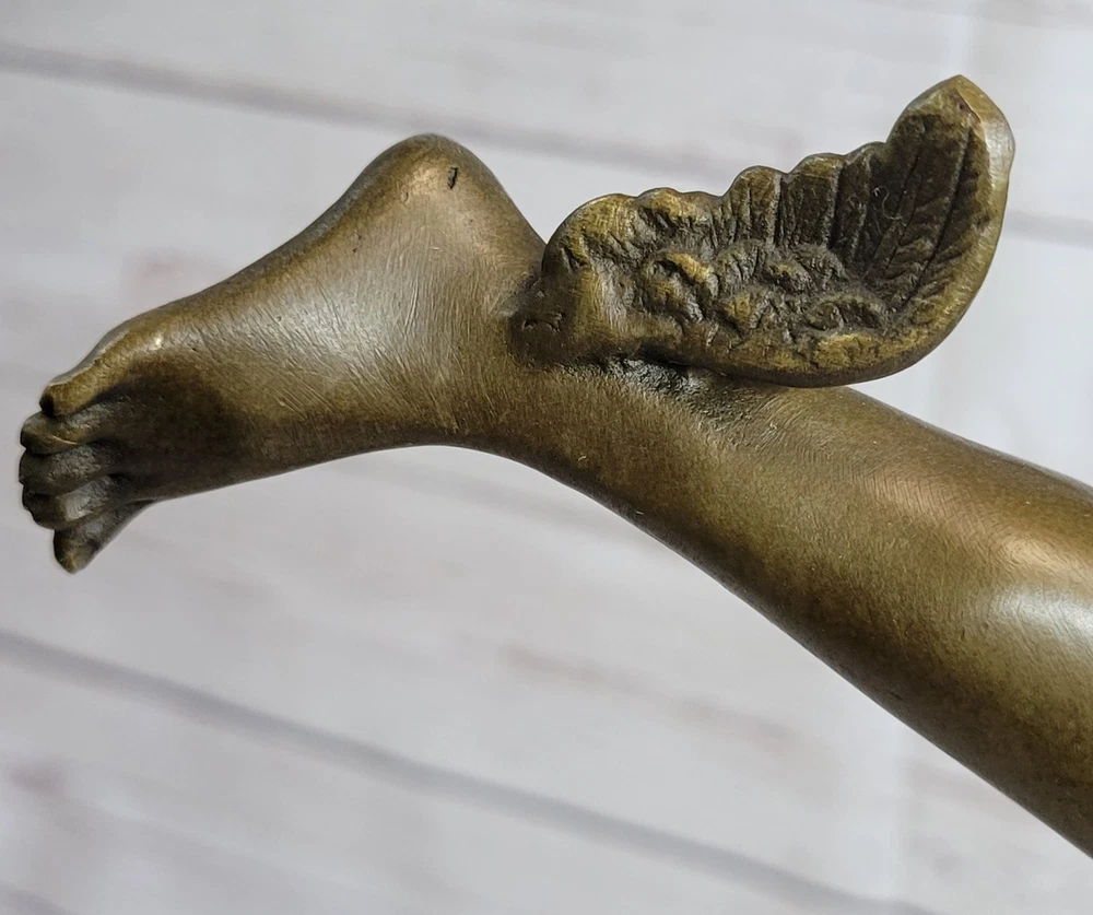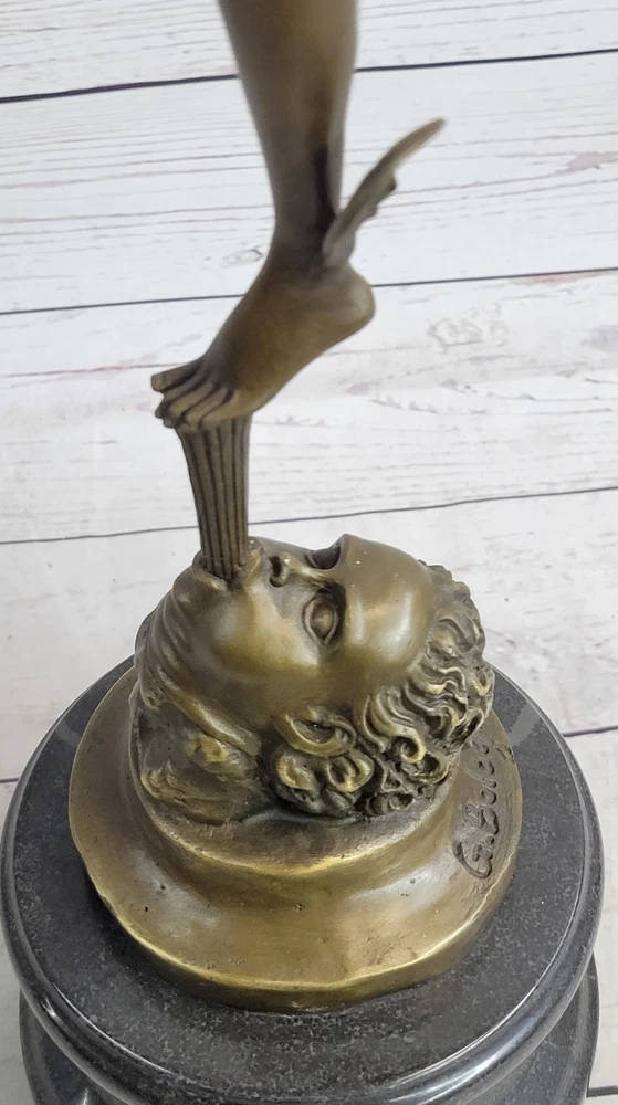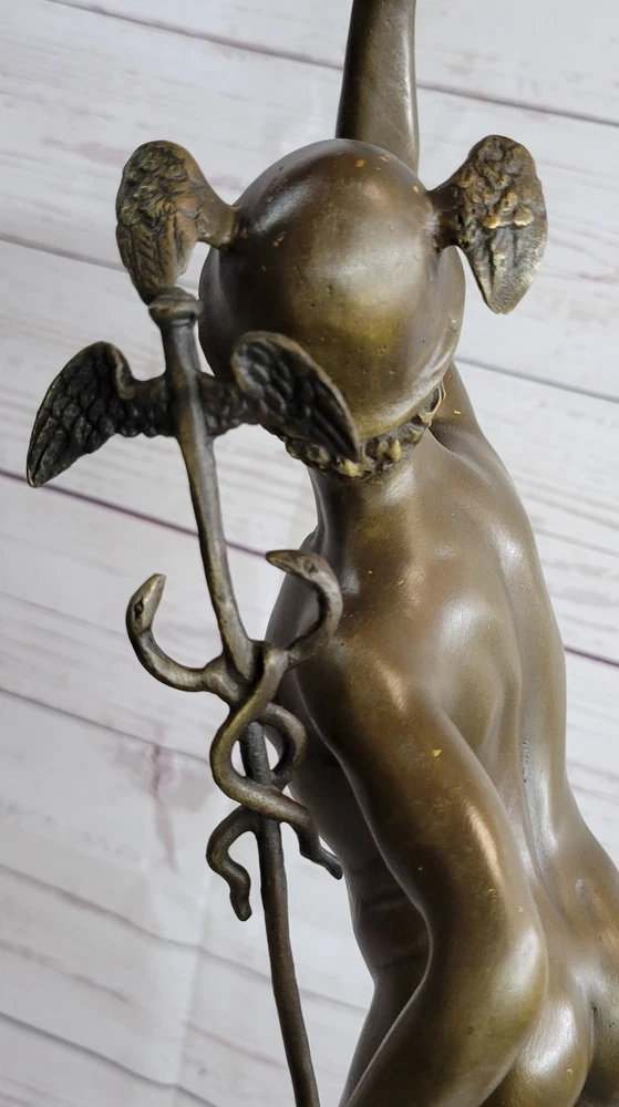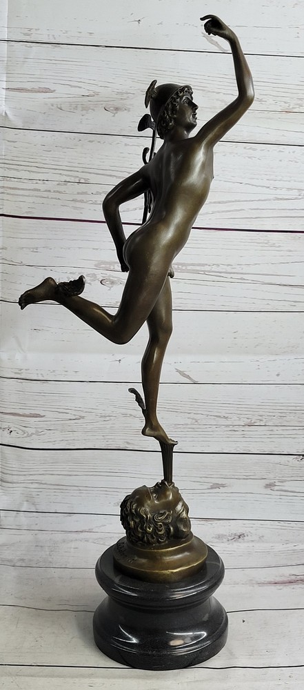 Condition :nbsp; This sculpture is in perfect condition. Bronze Dimensions with Marble Base: Height 23" X Width 13" Marble Dimensions: Diameter 5" Height without base:19.5" Weight: 12 LBS Inventory:90Y2115509 Capture the essence of Giambologna's artistic brilliance with this extraordinary bronze statue. Known for his ability to convey movement and action, Giambologna's Mercury sculpture is a testament to his mastery of form and surface finish. This iconic piece depicts Mercury, the Roman god of commerce and communication, in a moment of poised grace and elegance. Standing on one foot, Mercury is supported by a zephyr, embodying the swift and ethereal nature of the wind. The intricate details of his winged petasus and sandals highlight his ability to travel with great speed. In his hand, he holds the caduceus, symbolizing his connection to the realm of medicine. The statue captures the dynamic energy of Mercury, with his raised arm and poised stance, showcasing Giambologna's skill in creating lifelike sculptures. Crafted using the time-honored "Lost Wax Method," this sculpture ensures the preservation of the original work's quality and intricate details. It stands proudly on a heavy marble base, accentuated with a beautiful bronze trim that adds a touch of elegance and sophistication. The sculpture bears Giambologna's signature, serving as a testament to his mastery and the authenticity of the piece. Own a magnificent piece of art history with this bronze statue, a remarkable representation of Giambologna's artistic genius. Display it in your home or office, and immerse yourself in the timeless beauty and refined elegance that this sculpture embodies. NUDE FLYING MERCURY BRONZE STATUE MARBLE BASE SCULPTURE ART DECO ROMAN MYTHICAL Video will open in a new window Using the eBay App? Paste link into a browser window: [isdntekvideo]