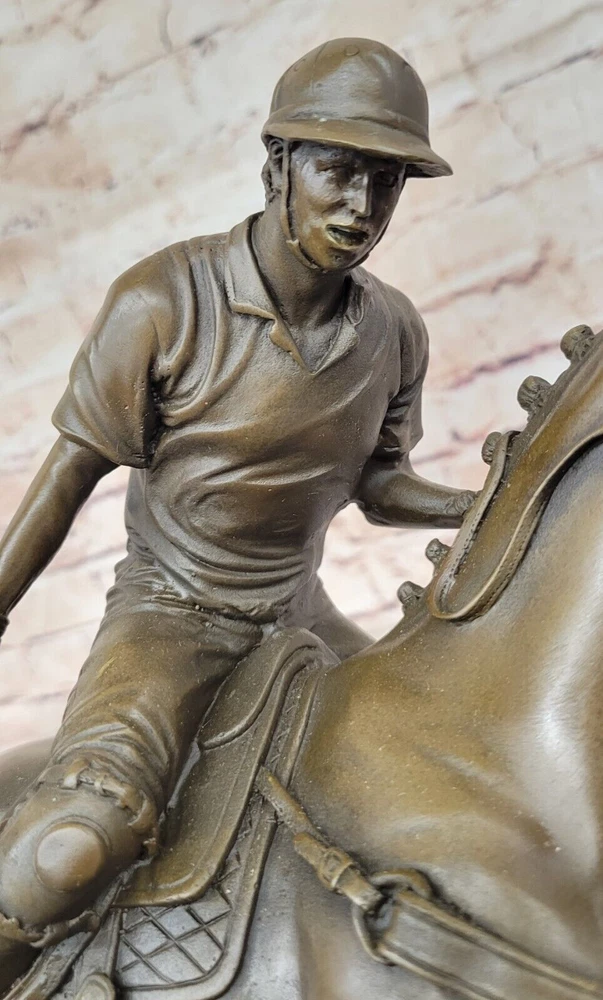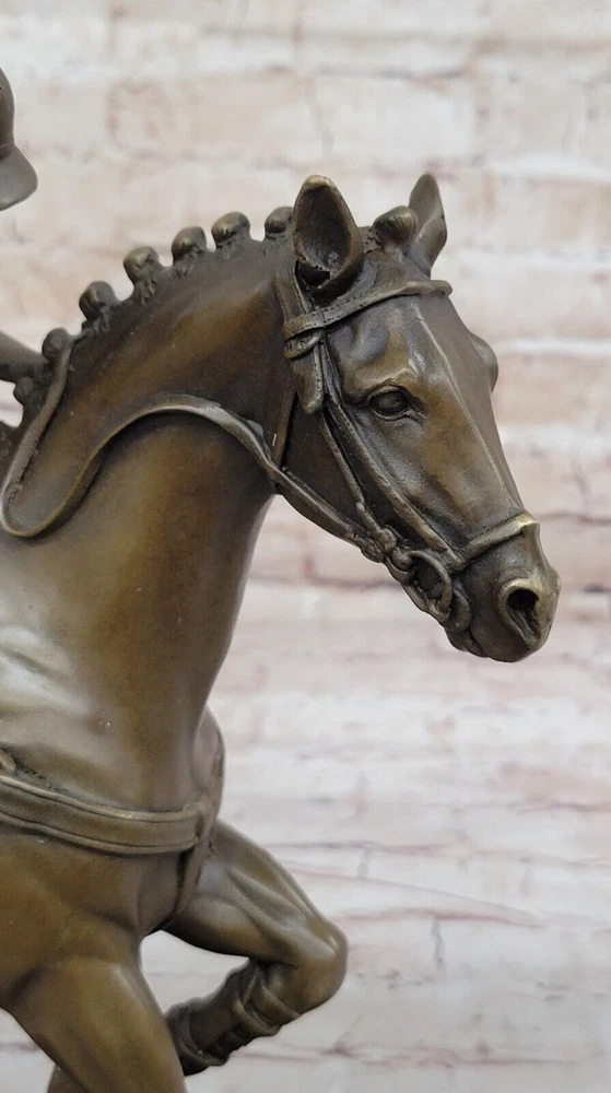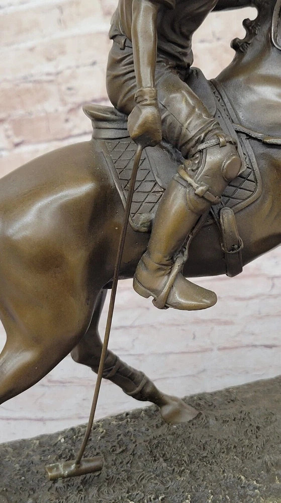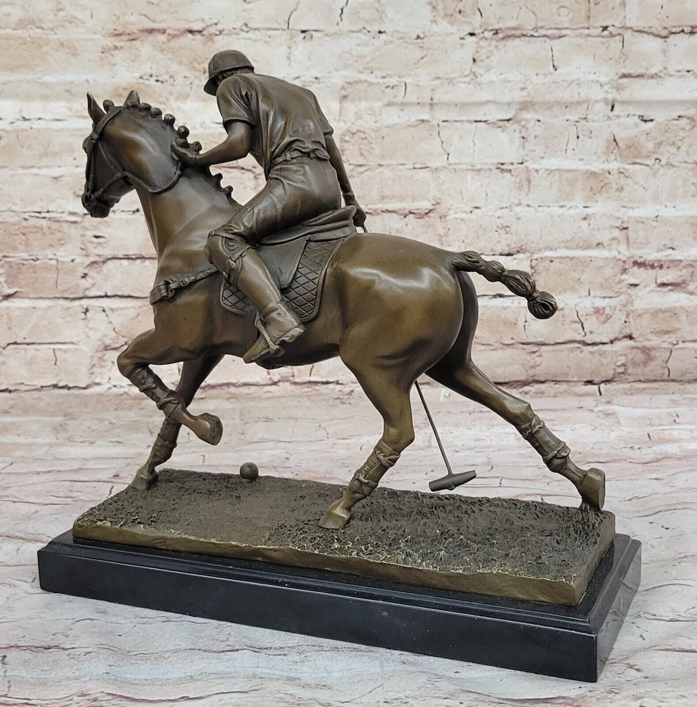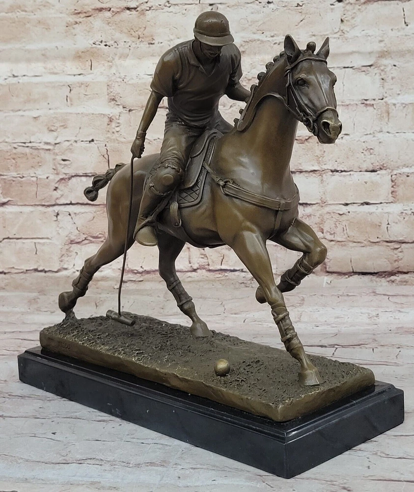 Condition : This sculpture is in perfect condition Bronze Dimensions with Marble Base: Height 12.5" X Width 12.5"nbsp; Marble Dimensions:12.5" X 5.5" Height without base:11.5" Weight:20 LBS Inventory:27B3338472 Experience the exhilarating world of polo with this captivating bronze sculpture that captures the essence of the "Sport of Kings." Swiftly riding through the field on his majestic stallion, the player prepares to strike the ball with a powerful swing of his mallet. This dynamic moment, frozen in bronze, pays homage to the grace and intensity of this revered sport that gained popularity in Britain. Crafted with precision and artistry, the sculpture is a masterpiece made using the ancient and intricate lost wax method. This technique ensures that every detail, from the flowing mane of the stallion to the focused determination of the player, is preserved with unparalleled accuracy. The sculpture stands as a testament to the skill of the artist, signed with the distinguished mark of Milo. As you admire this 100% bronze creation, you are transported to the heart of a polo match, where the synergy between rider and horse is a dance of skill and athleticism. Whether you're a fan of equestrian sports or appreciate the artistry of sculpture, this piece invites you to celebrate the timeless allure of polo and the craftsmanship that brings it to life. Valentines Day Gift. Bronze Statue BRONZE BY MILO POLO PLAYER HORSE SCULPTURE www.bronzhaus.com Video will open in a new window Using the eBay App? Paste link into a browser window: [isdntekvideo]