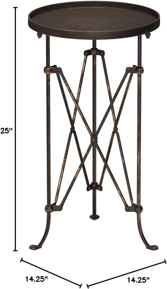 Creative Co-Op Round Bronze Metal Accent Table Product Details Brand: Creative Co-Op Product Dimensions: 14.25"D x 14.25"W x 25"H Maximum Weight Recommendation: 12 Pounds Color: Bronze Product Care Instructions: Wipe with Dry Cloth Item WeightFrame Material: 12.3 PoundsMetal Top Material TypeShape: MetalAccent Table Metal construction Top tray is 14. 5" round with 1" raised sides Legs are 1" round and 25" high Wipe clean with dry cloth 14. 25L x 14. 25W x 25. 25H in. This accent table is the perfect size for just about anywhere in the home. The slightly distressed bronze finish coupled with whimsical feet make it a unique choice for any décor. Some assembly is required.