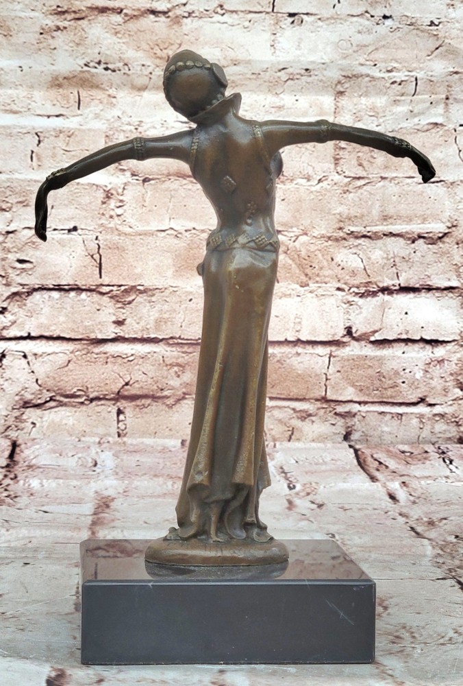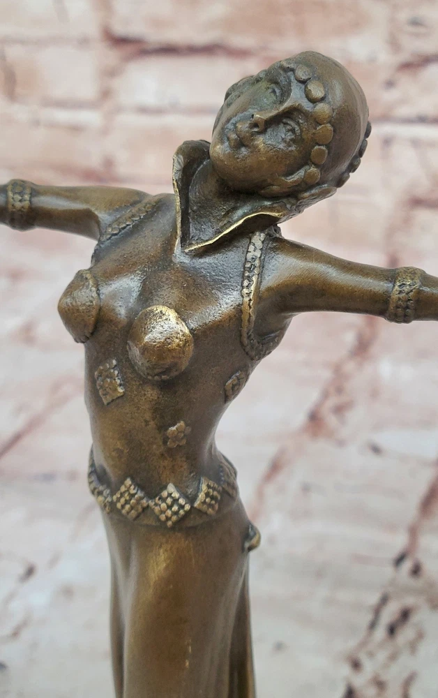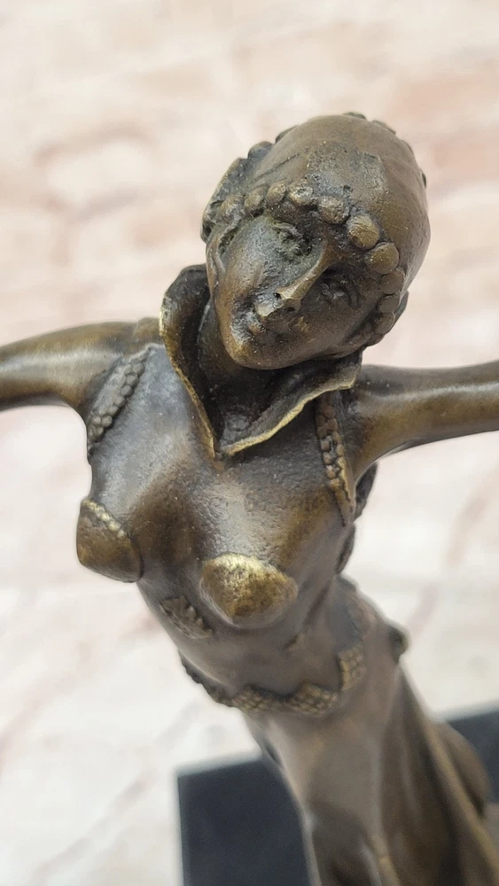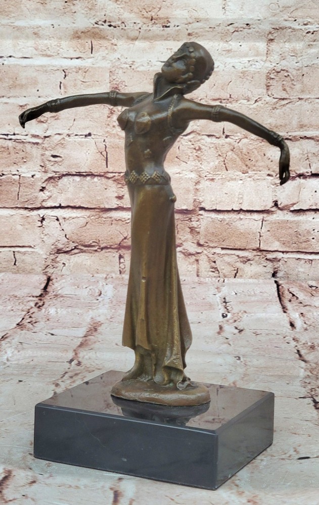 Bronze Sculpture Statue Art Deco 9" Tall Dancer Signed Chiparus Figure Gift BB Bronze Sculpture Statue Art Deco 9" Tall Dancer Signed Chiparus Figure Gift BB Condition : This sculpture is in perfect condition Bronze Dimensions with Marble Base: Height 9.5" X Width 7" Marble Dimensions:4" X 4" Height without base:9" Weight:5 LBS Inventory:57Y2382575 The beautiful maiden can be envisioned dancing to a melody only she can hear—an ethereal rhythm known only to her and nature itself. Surrounded by the silent witness of trees, land, and birds, she twirls effortlessly through the open air, a vision of grace and liberation. Her arms are outstretched, her face uplifted, and her spirit seems to soar alongside the breeze as she embraces the sky above. Crafted in bronze, this sculpture captures a fleeting moment of movement and emotion with exceptional detail. The figure exudes a lightness and freedom, her flowing garments and posture reflecting both elegance and spontaneity. Every curve and gesture invites the viewer to imagine the serenity and joy of being truly in harmony with the natural world. Handmade using the ancient lost-wax casting method, this sculpture is finished with a rich brown patina that enhances its depth and timeless character. Mounted on a black marble base for contrast and stability, the piece bears the signature of the renowned artist D.H. Chiparus, ensuring its place as a collectible and cherished work of art. 100% Solid Bronze Egyptian Sculpture Signed Art D.H. Chiparus Figurine Decor Video will open in a new window Using the eBay App? Paste link into a browser window: [isdntekvideo] Shipping Terms : Most of our items are shipped via USPS (United States Postal Service) mail or UPS. Most orders are shipped within 24-48 hours of purchase. Please be aware that not all items are available for USPS shipping due to size and weight. We do ship to Hawaii, Alaska, Canada, Puerto Rico, APO/AE, and U.S. Virgin Islands, however, an additional charge may be required. Please contact us before making any purchases in these areas. For Non-USA customers, you may be responsible for all duty, tax, brokerage fees that may be due upon delivery (shipping costs cover freight charges only). We also ship internationally. Please refer to the "Shipping and Handling" chart for the rates for each area. Payment : We accept just about any form of payment. PayPal, Master Card, Visa or American Express credit cards. Money orders, cashiers checks, and even personal or business checks. For governmental institutions, we will also accept a purchase order. Please understand that for personal or business checks we have to wait for the check to clear (usually 7 days) before shipping. Condition : New Detailed Hand Crafted Hot Cast Bronze Satisfaction Guaranteed. This is Stock Photo, Slight Color Variation!! Listing and template services provided by inkFrog