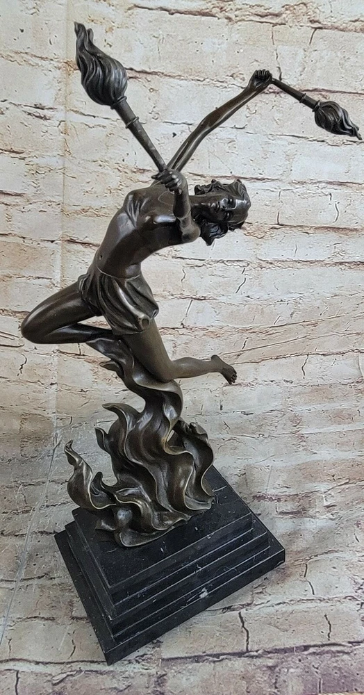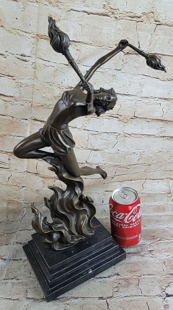 Bronze Sculpture The Flame Leaper Art Deco Woman Torch Dancer Fire Dancer Deal Bronze Sculpture The Flame Leaper Art Deco Woman Torch Dancer Fire Dancer Deal Condition : This sculpture is in perfect condition Bronze Dimensions with Marble Base: Height 17.5" X Width 11" Marble Dimensions:7" X 5" Height without base:15" Weight:13 LBS Inventory:84EPA0758148 This dynamic Art Deco bronze sculpture captures the captivating energy of a fire dancer in motion, inspired by the iconic work of Mario Nick. The figure, poised with torchlights in hand, embodies movement, grace, and the bold style of the Art Deco era. Crafted entirely from genuine bronze with meticulous attention to detail, this sculpture showcases the artist's mastery of form and expression. Mounted on a polished black marble base, the piece exudes sophistication and timeless appeal, making it a striking focal point in both classic and contemporary interiors. Each sculpture is individually handcrafted using the traditional lost wax casting method, ensuring lasting quality and artistic integrity. Due to the natural variations in marble and the handcrafted nature of bronze casting, each sculpture is truly one of a kind—adding to its exclusivity and collectible value. Signed by the artist, this exceptional artwork promises lasting enjoyment and elegance for any art lover or interior setting. Fire Dancer Girl Dancing with Torches Bronze Metal Sculpture Statue Figure Marble Base EPA-075 Video will open in a new window Using the eBay App? Paste link into a browser window: [isdntekvideo] Shipping Terms : Most of our items are shipped via USPS (United States Postal Service) mail or UPS. Most orders are shipped within 24-48 hours of purchase. Please be aware that not all items are available for USPS shipping due to size and weight. We do ship to Hawaii, Alaska, Canada, Puerto Rico, APO/AE, and U.S. Virgin Islands, however, an additional charge may be required. Please contact us before making any purchases in these areas. For Non-USA customers, you may be responsible for all duty, tax, brokerage fees that may be due upon delivery (shipping costs cover freight charges only). We also ship internationally. Please refer to the "Shipping and Handling" chart for the rates for each area. Payment : We accept just about any form of payment. PayPal, Master Card, Visa or American Express credit cards. Money orders, cashiers checks, and even personal or business checks. For governmental institutions, we will also accept a purchase order. Please understand that for personal or business checks we have to wait for the check to clear (usually 7 days) before shipping. Condition : New Detailed Hand Crafted Hot Cast Bronze Satisfaction Guaranteed. This is Stock Photo, Slight Color Variation!! Listing and template services provided by inkFrog