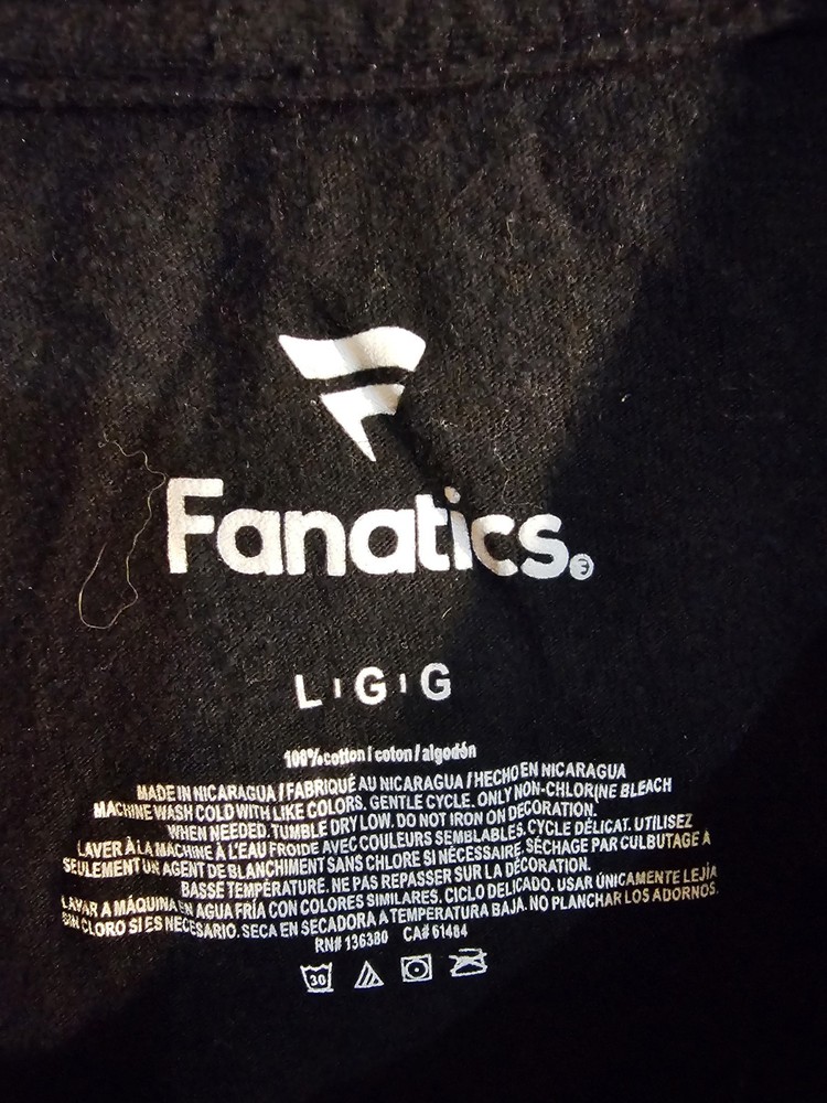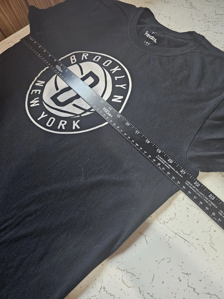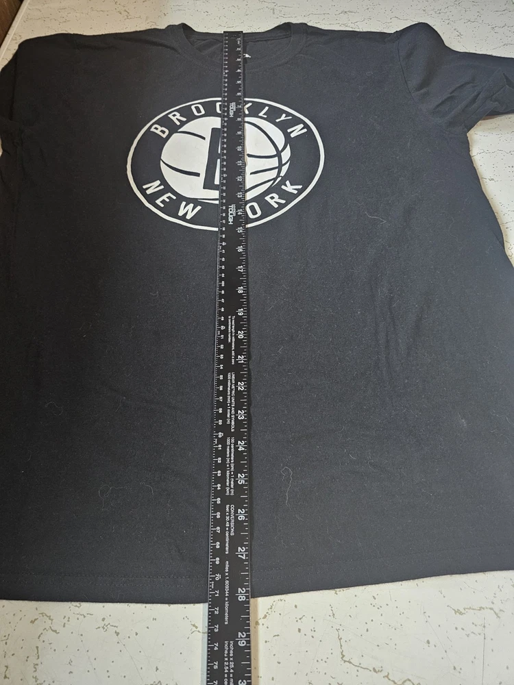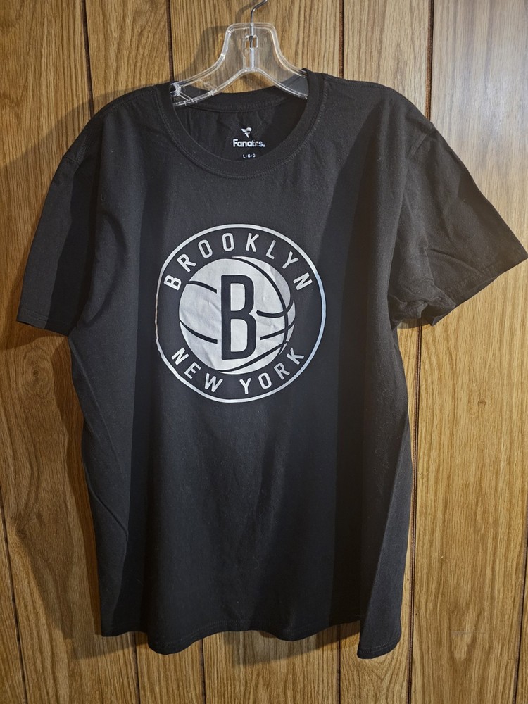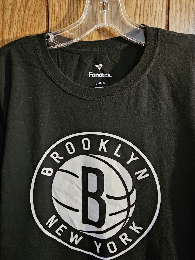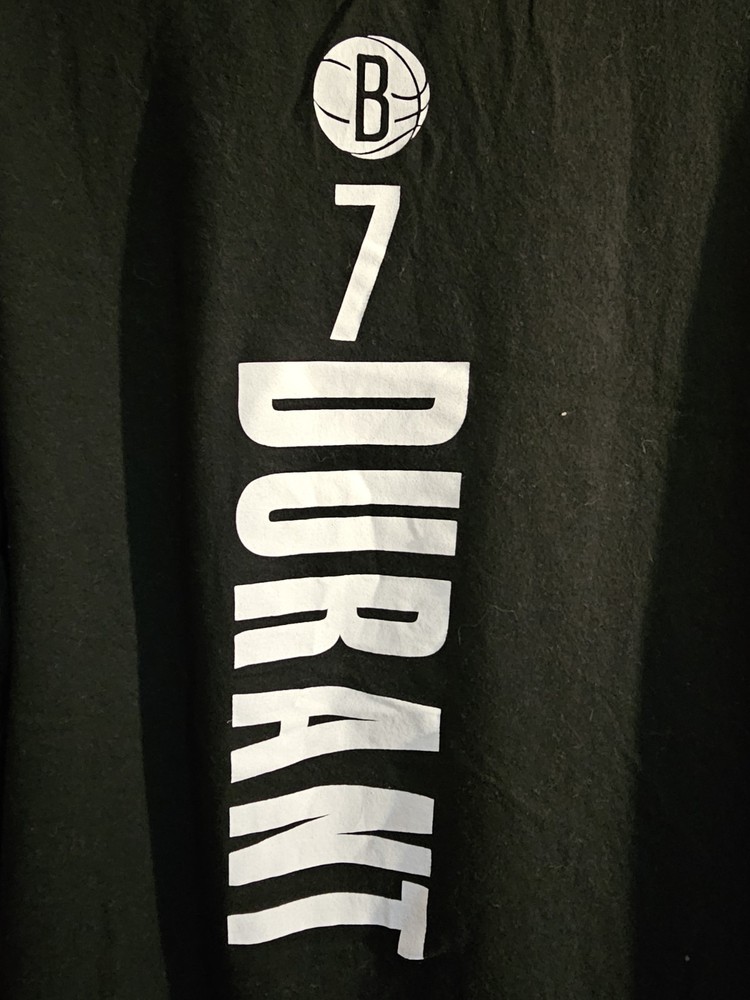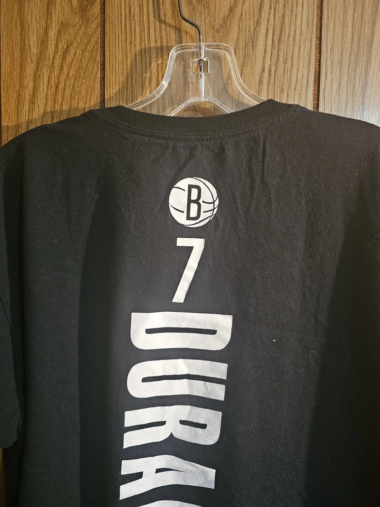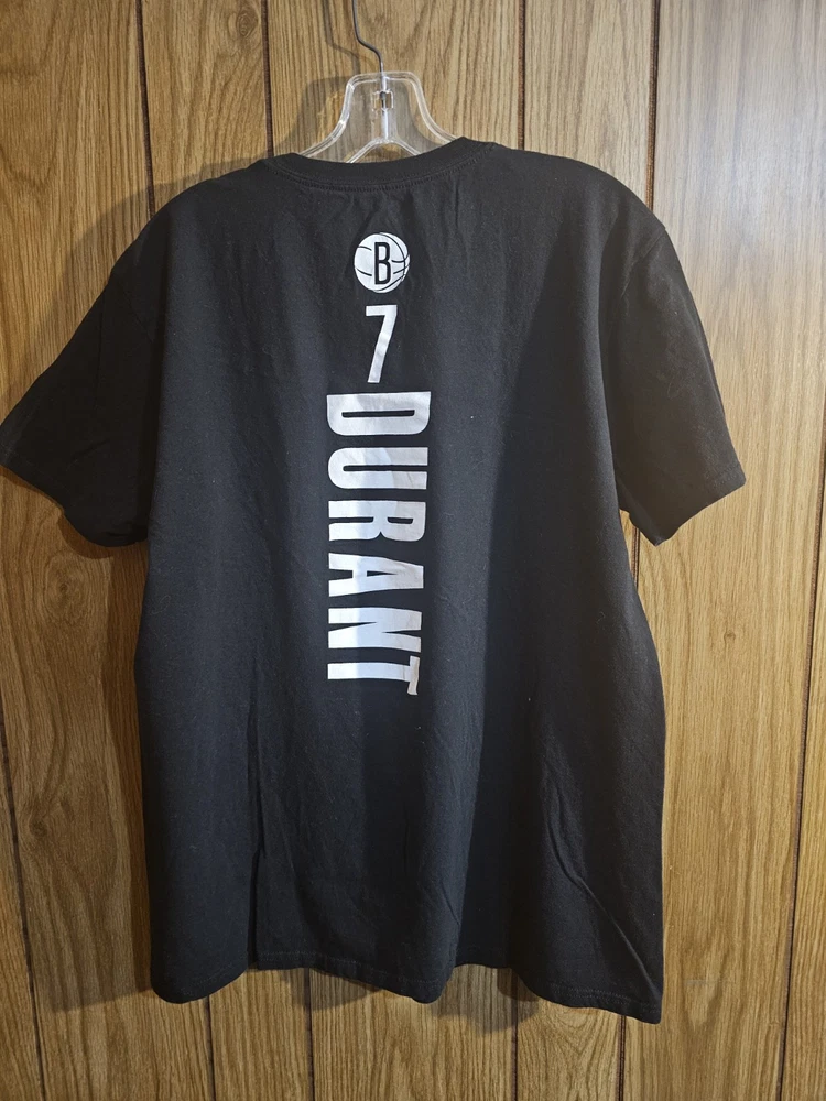This is a black, size large men's shirt featuring a double-sided graphic logo of Kevin Durant from the Brooklyn Nets. The shirt is officially licensed by the National Basketball Association (NBA) and is made by Fanatics. It is suitable for regular season basketball games and is manufactured in Nicaragua.