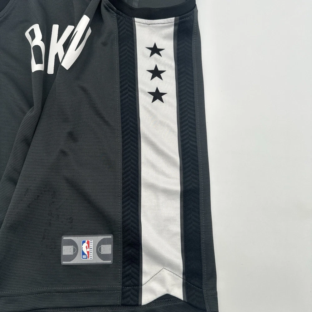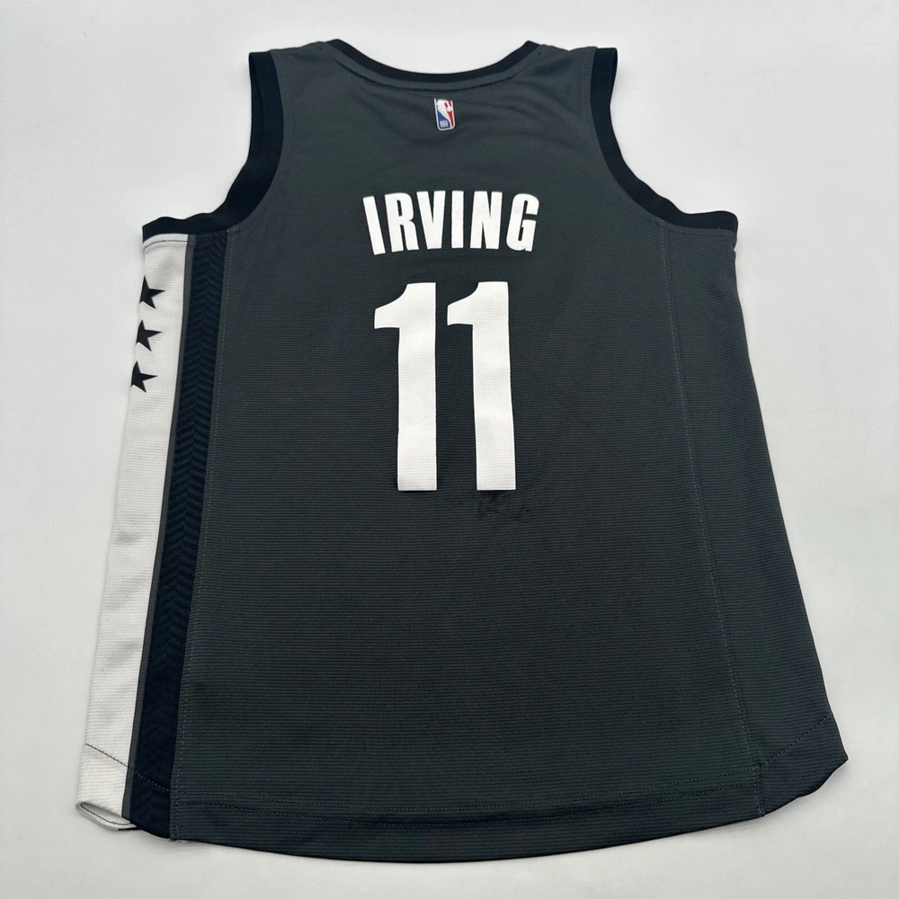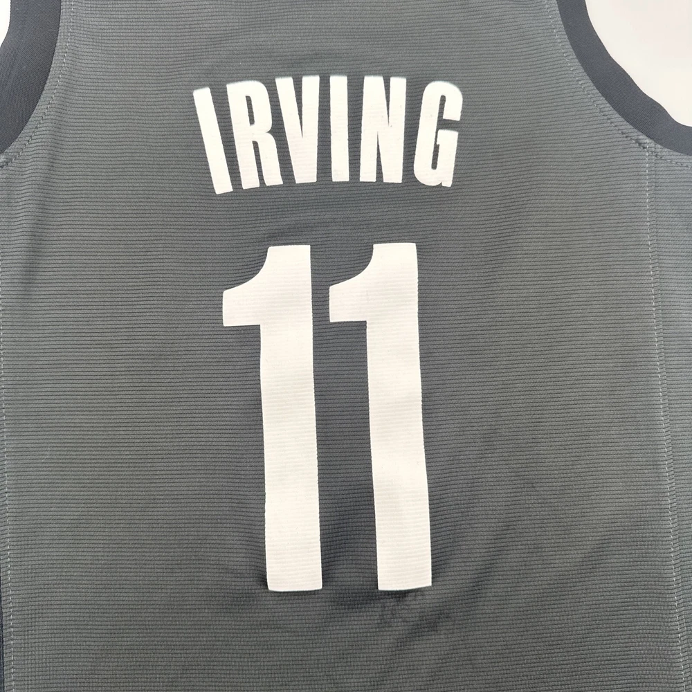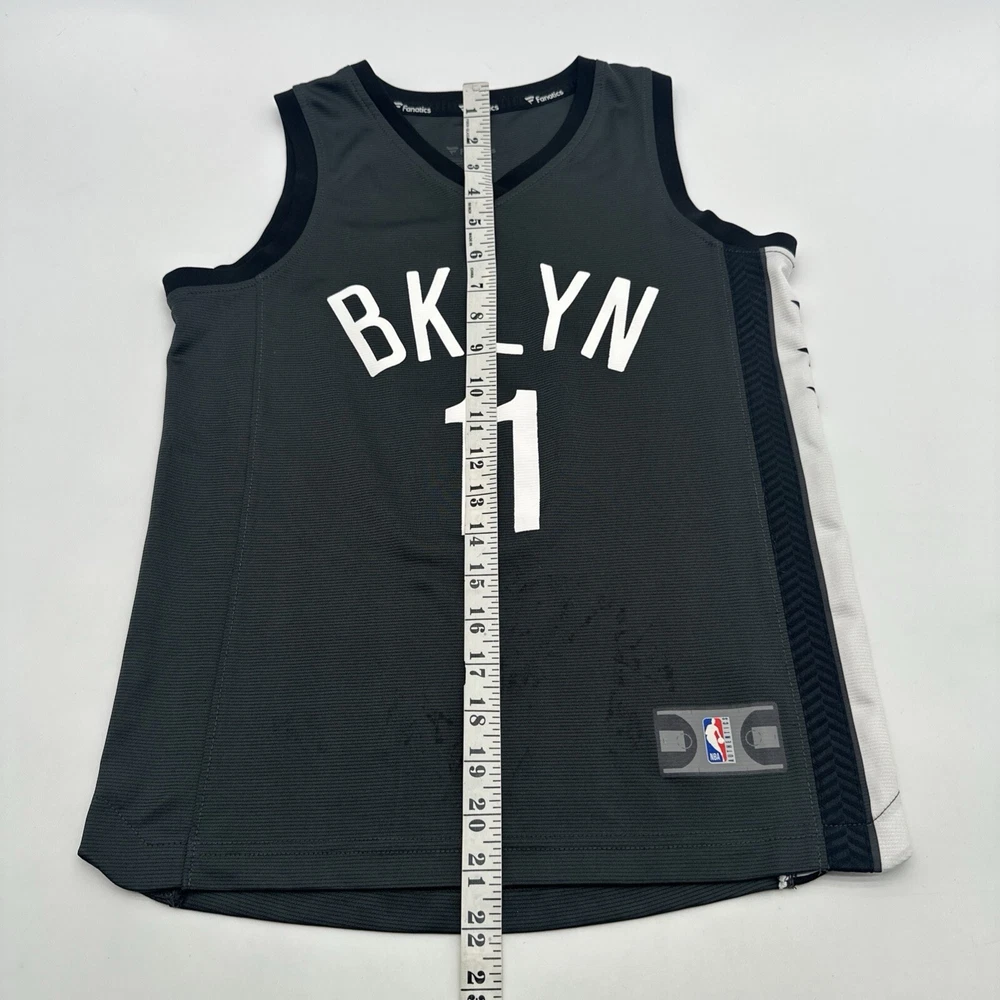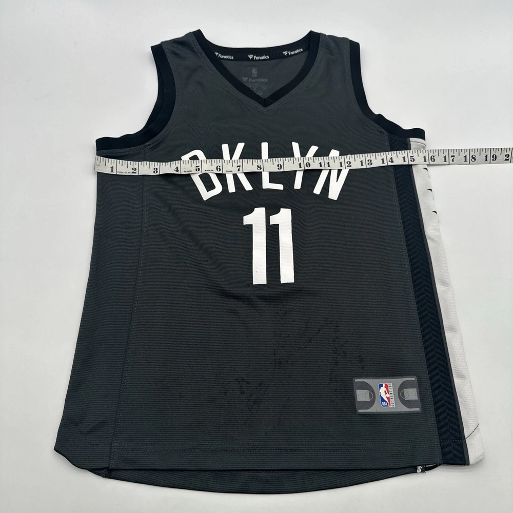 This is a youth boys' size small gray Brooklyn Nets jersey featuring player Kyrie Irving's name and number. Officially licensed by the NBA and made by Fanatics, this basketball jersey is perfect for young fans of the Brooklyn Nets to show their support for the team. Check Pictures for flaws and measurements