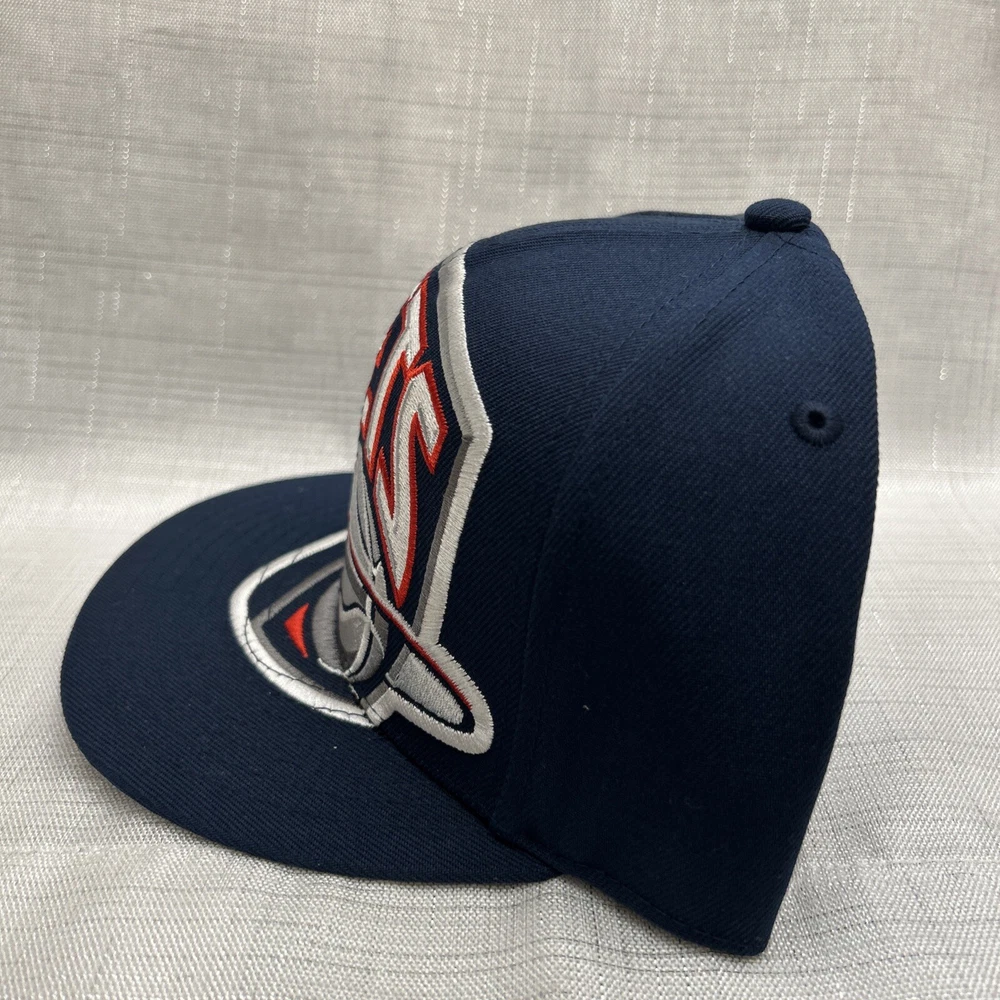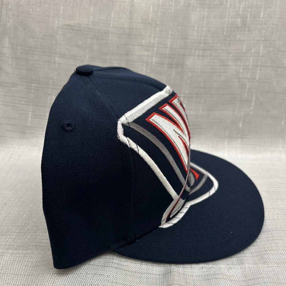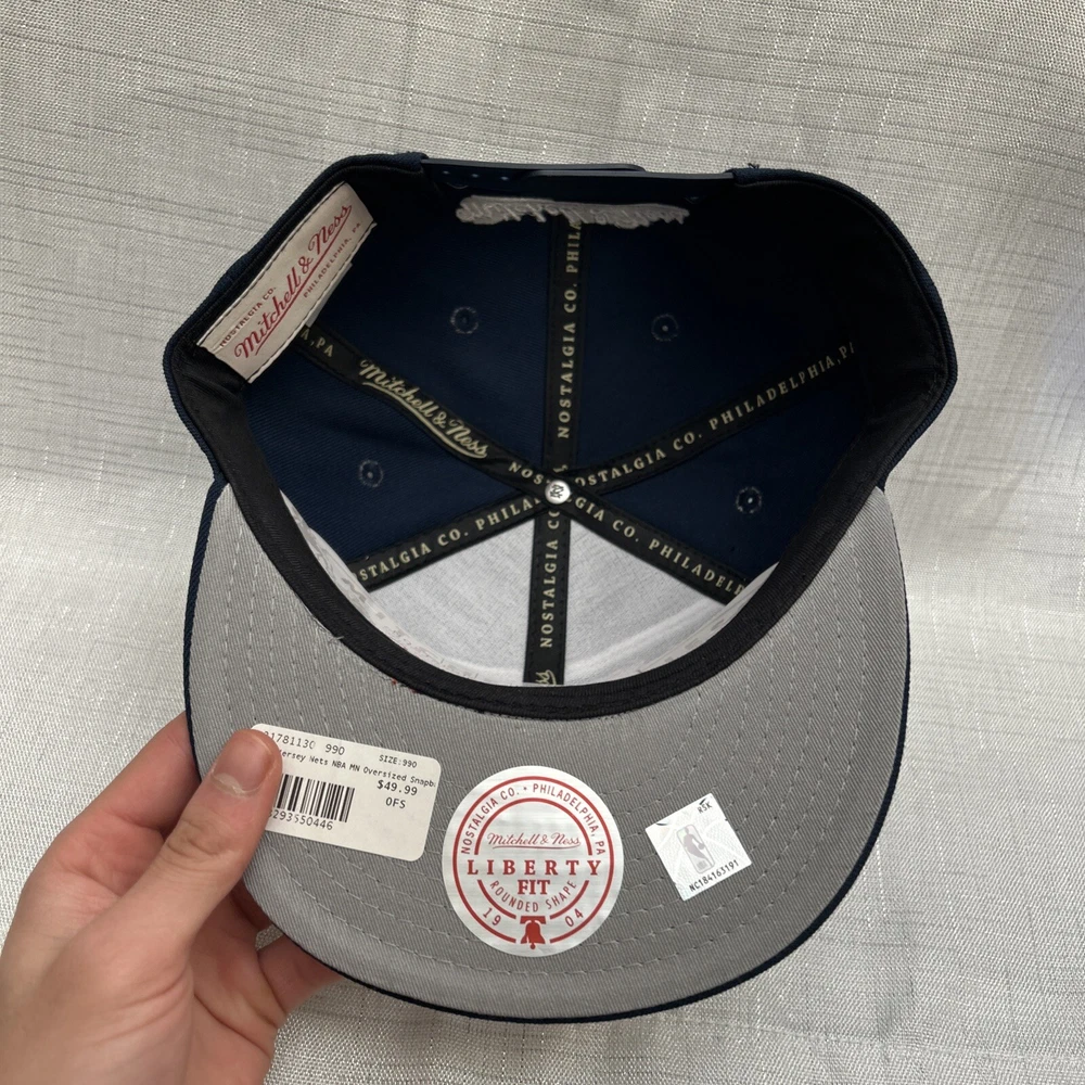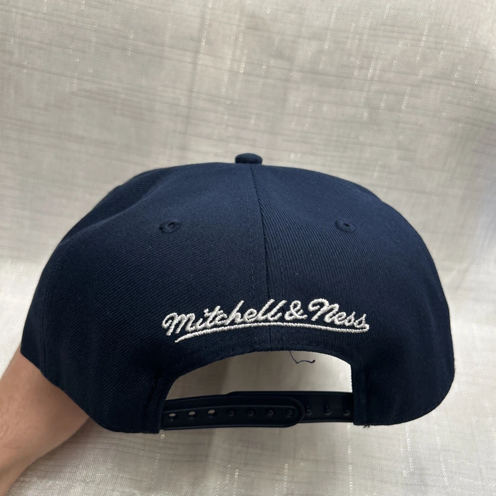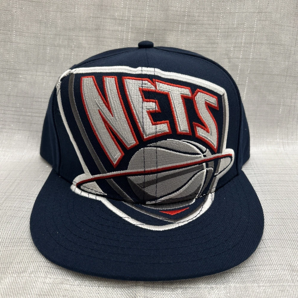 The product is a Mitchell & Ness NBA Snapback Hat Cap featuring an oversized Brooklyn Nets logo in blue. It is officially licensed by the National Basketball Association (NBA) and designed for basketball fans to show support for the team. The hat is brand new with tags (NWT).