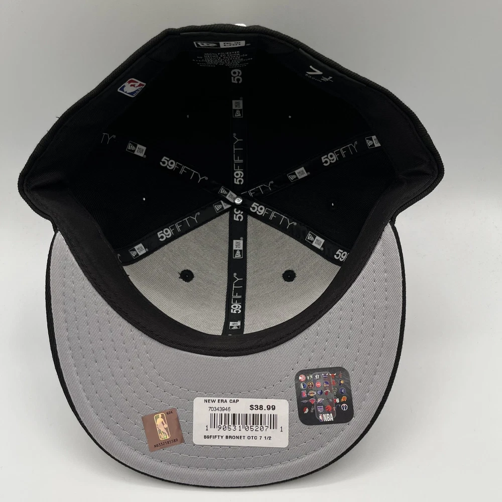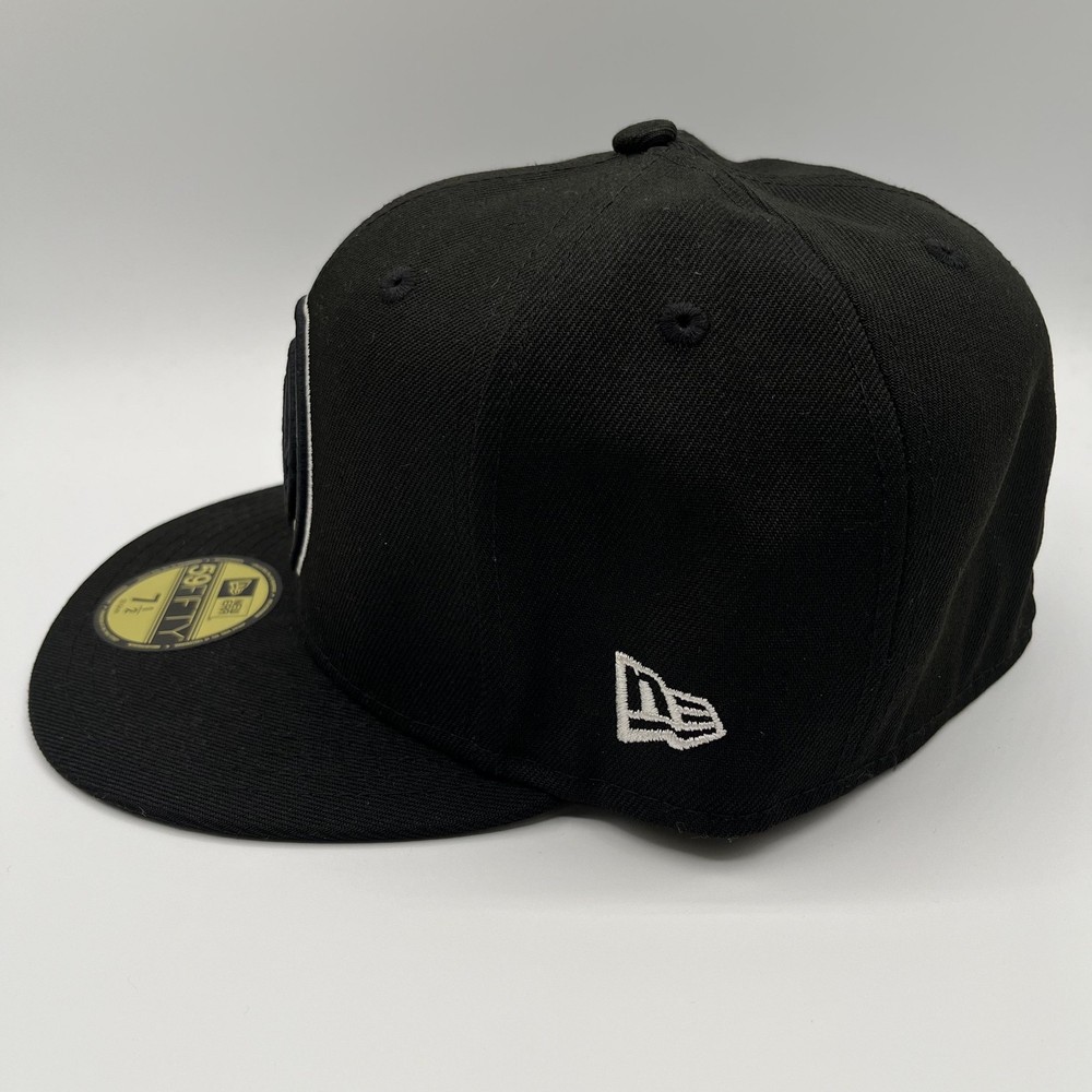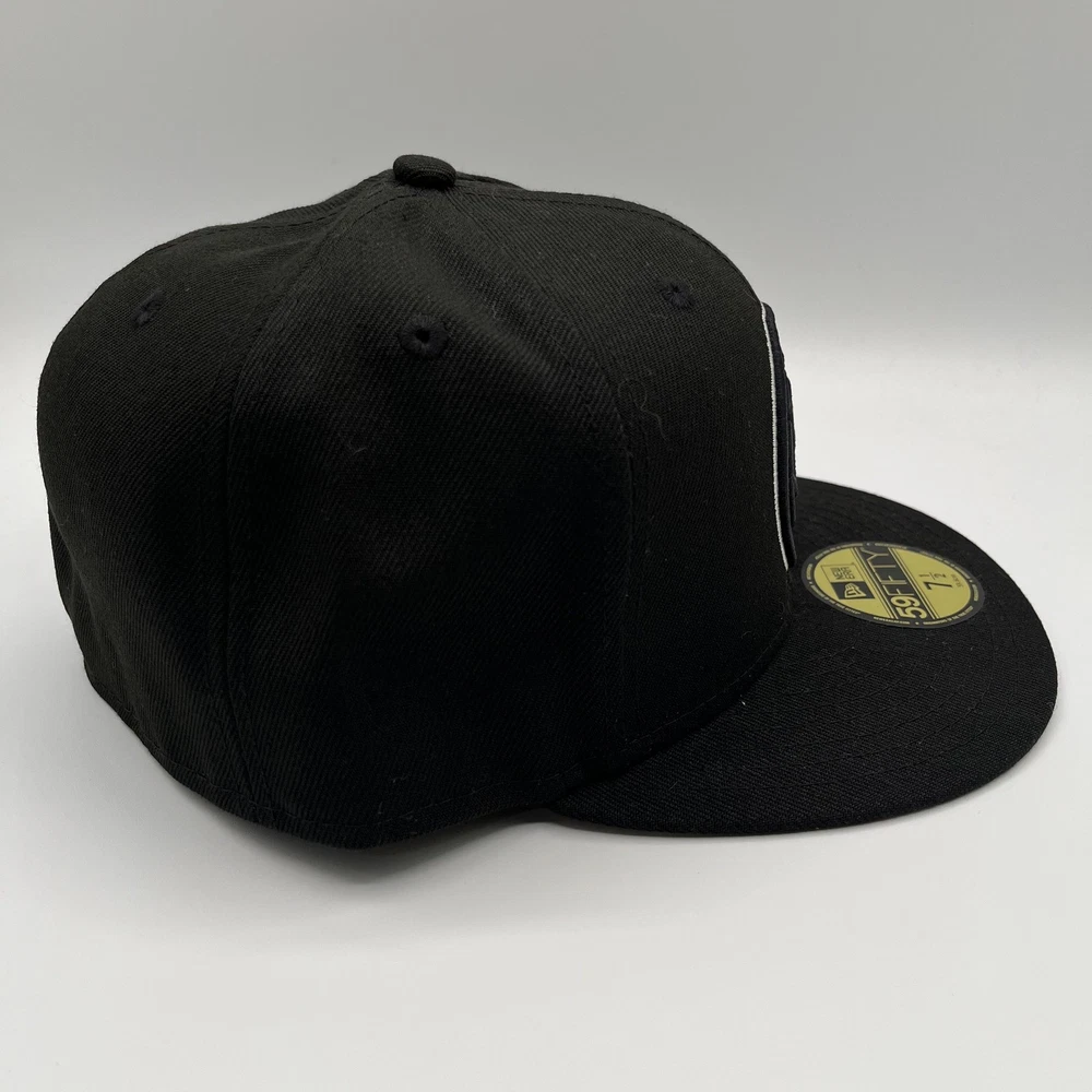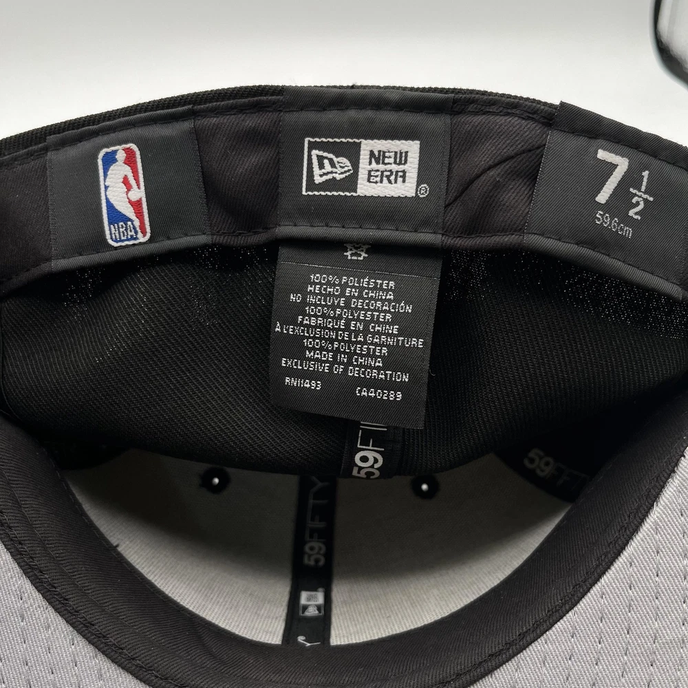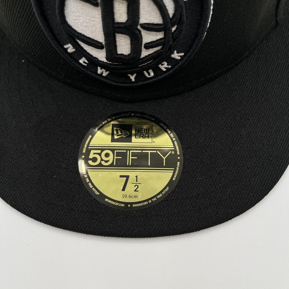 Brooklyn Nets New Era 59FIFTY Hat Cap Fitted Mens 7 1/2 Black NBA Basketball NEW New with original gold 59FIFTY size sticker and underbrim price sticker; hat appears unworn. Fabric, embroidery, visor, and interior sweatband are clean with no stains, fraying, or damage. Brim and crown retain crisp shape and may show a few small lint specks from storage. Brooklyn Nets mens fitted hat cap by New Era from the 59FIFTY NBA collection in black. Brand: New Era 59FIFTY; officially licensed National Basketball Association headwear with interior New Era and NBA shield branding. Team: Brooklyn Nets with large raised embroidered circular "BROOKLYN NEW YORK" basketball logo patch on the front panels, white New Era flag embroidery on the left side, and monochrome NBA logo man embroidery on the back. Style: Mens fitted baseball hat cap with structured six-panel high crown, flat visor, black top button and eyelets, and light gray under brim. Size on tag: 7 1/2 fitted (59.6 cm), designed for adult mens sizing. Manufacturing details: Made in China with interior woven labels showing New Era, NBA, size, RN# 14393, CA# 00289, and 59FIFTY branded taping. HAT200