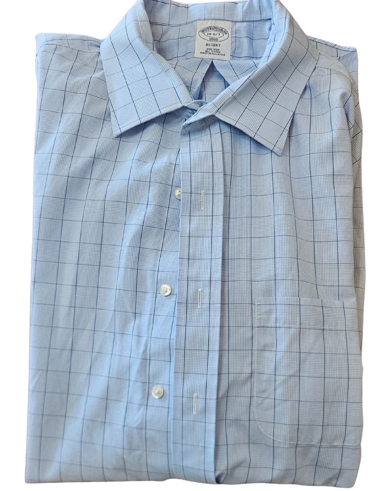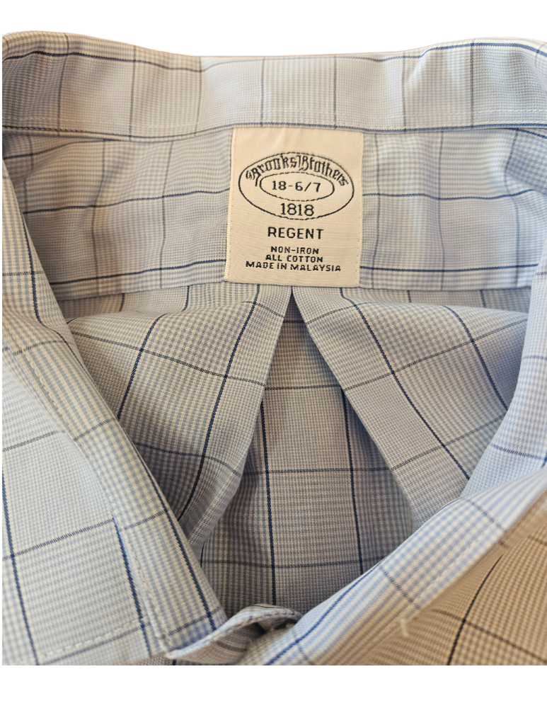 Brooks Brothers 1818 Regent Fit Non-Iron Dress Shirt in excellent pre-owned condition. Classic light blue base with sophisticated navy windowpane check pattern—perfect for the office or dressed down on weekends. The Regent fit offers a comfortable, traditional cut through the body. Non-iron finish means this shirt comes out of the dryer ready to wear with minimal touch-up. Made from 100% cotton for breathability and all-day comfort.